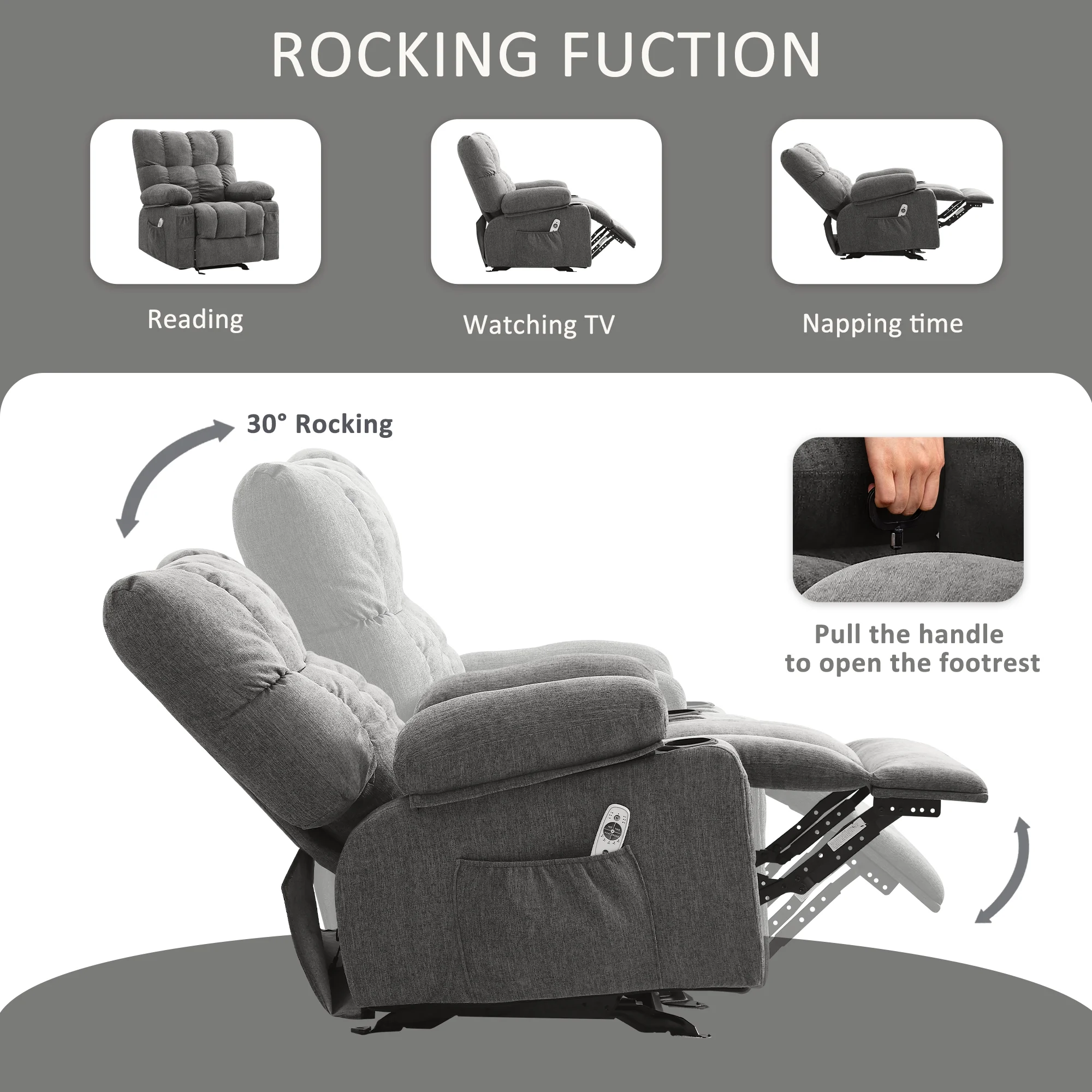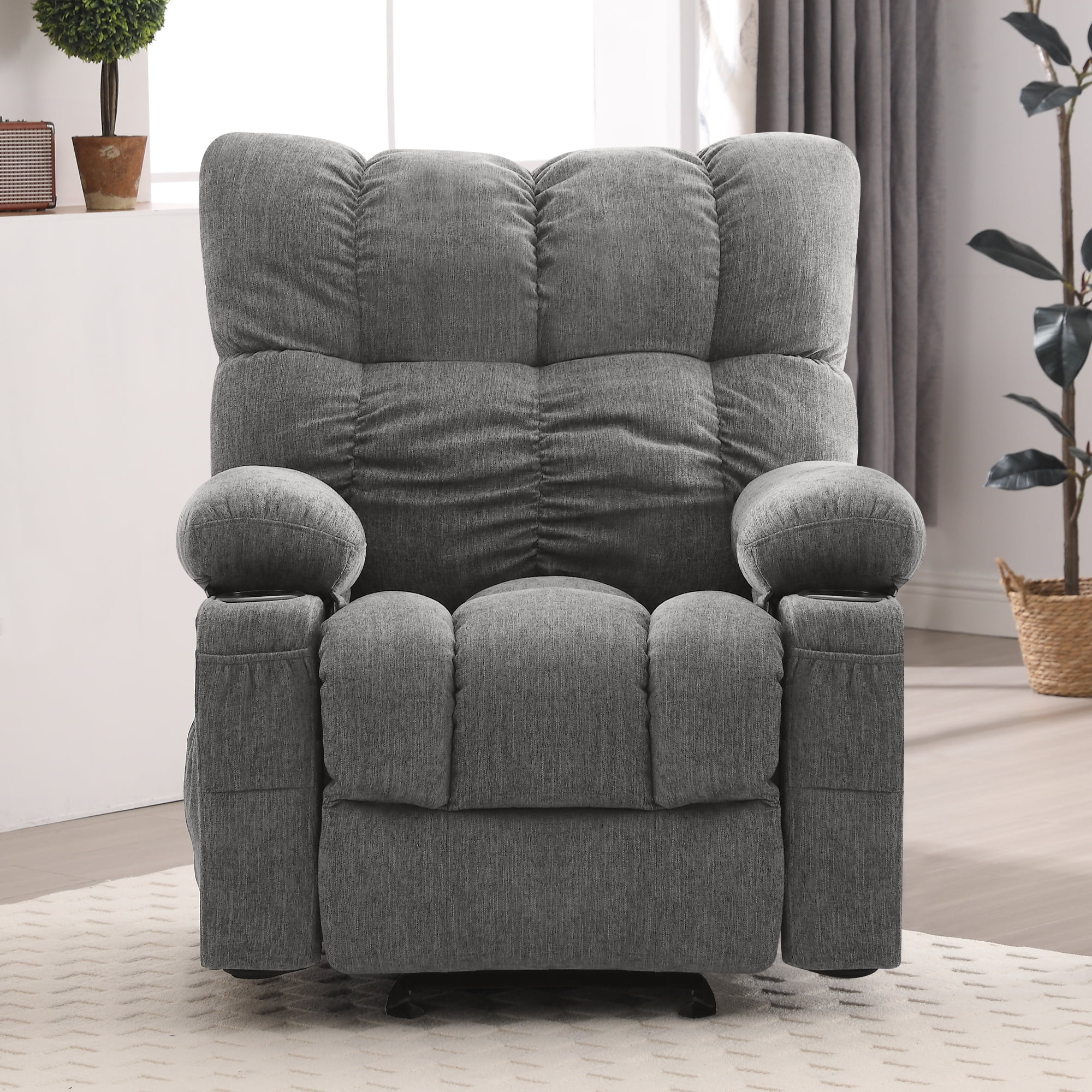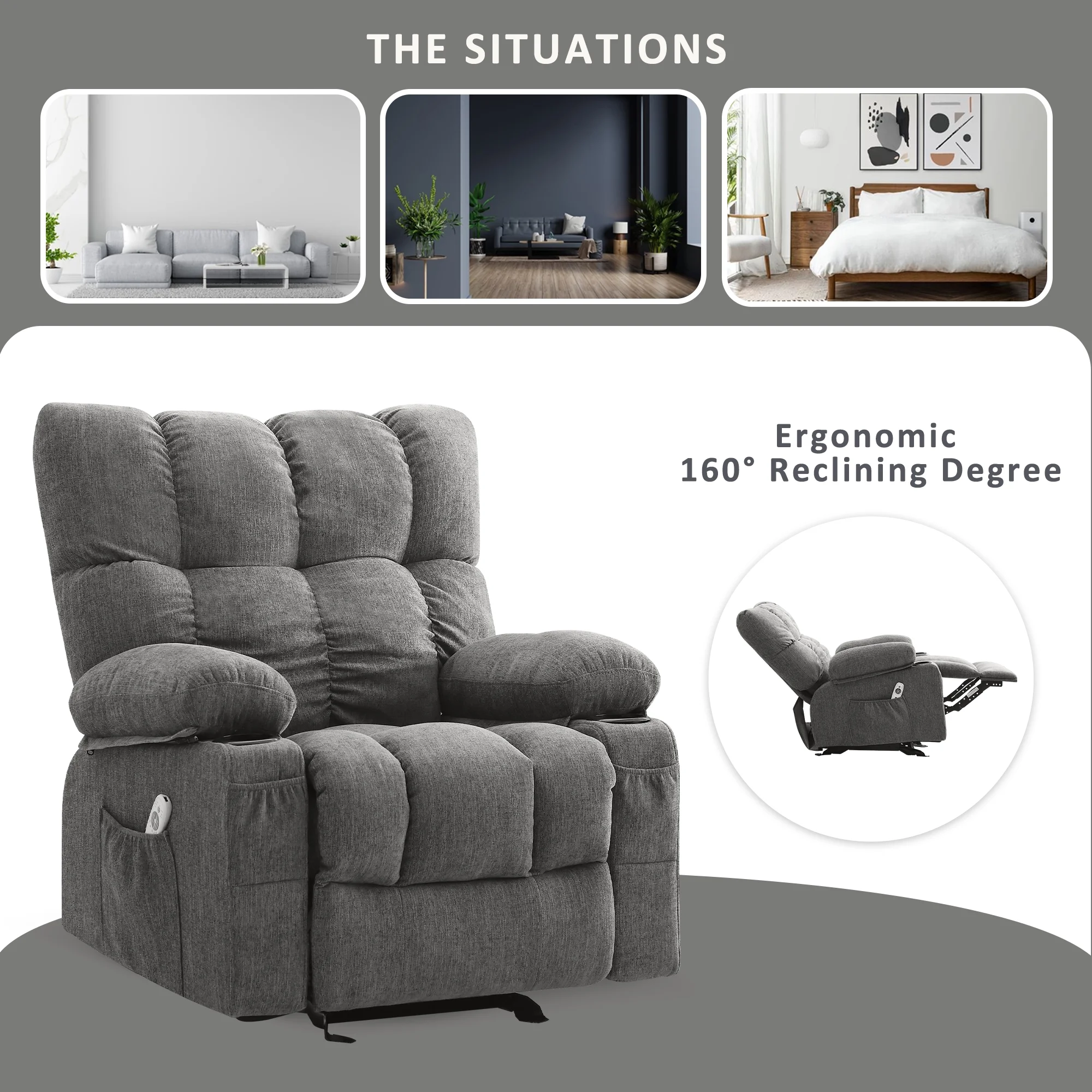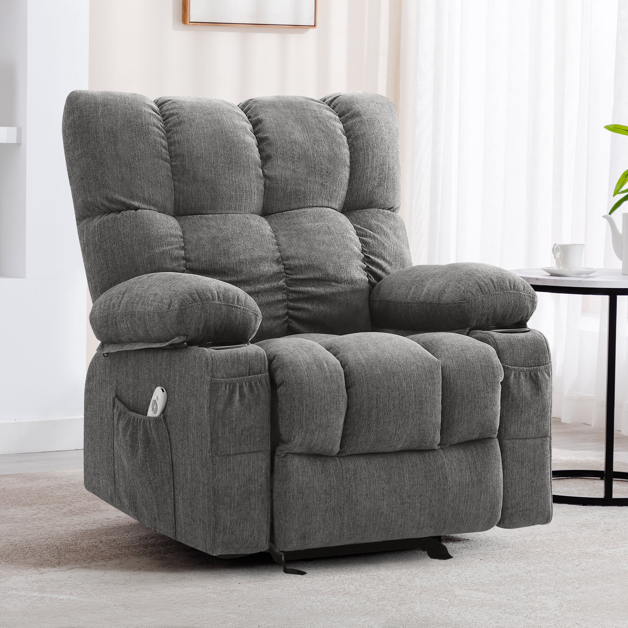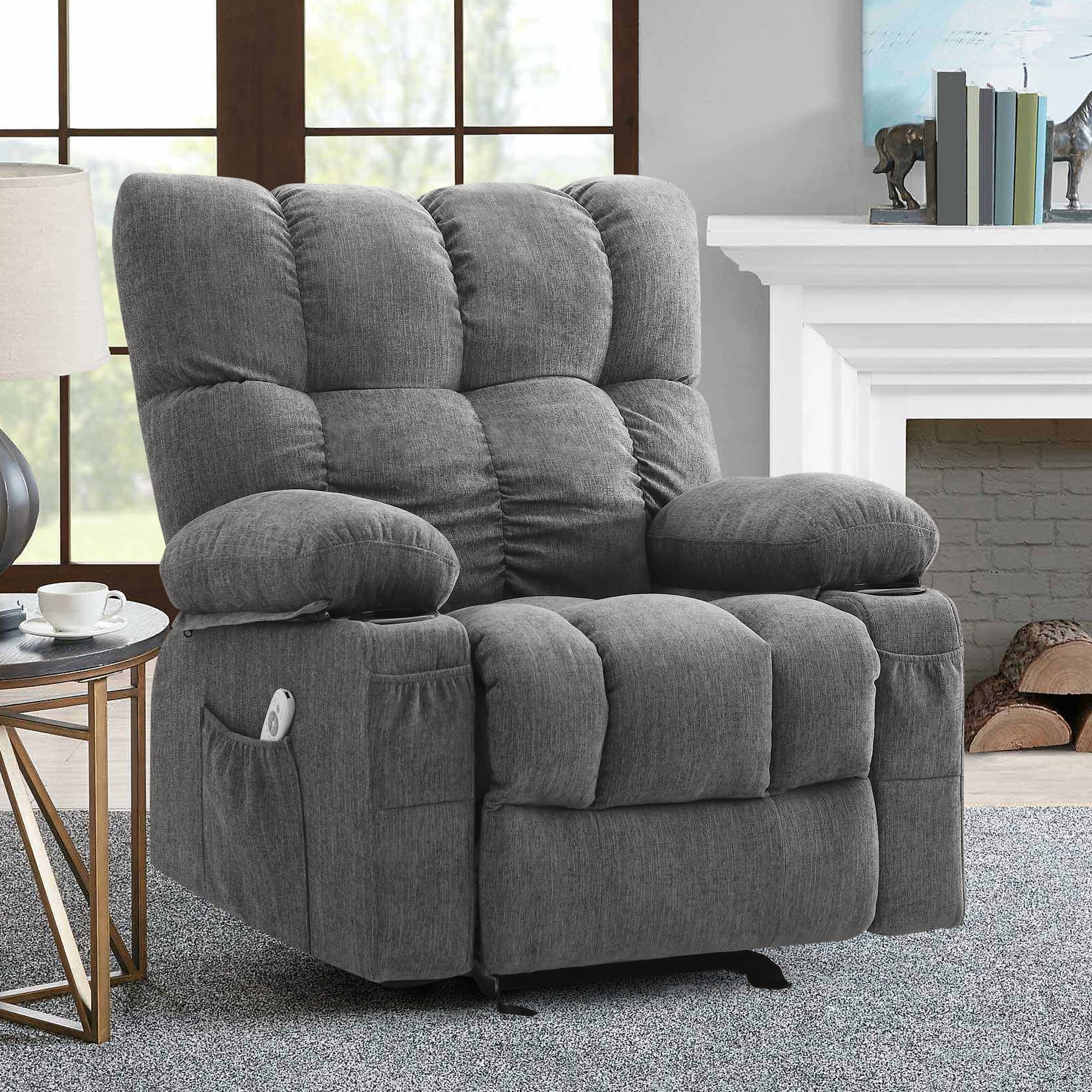 JONPONY Manual Recliner Chair with Heat Therapy and Massage Function, Heavy Duty Reclining Mechanism Massage Chair, Elderly Single Rocker Sofa with Cup Holders for Bedroom Home Theater, Grey