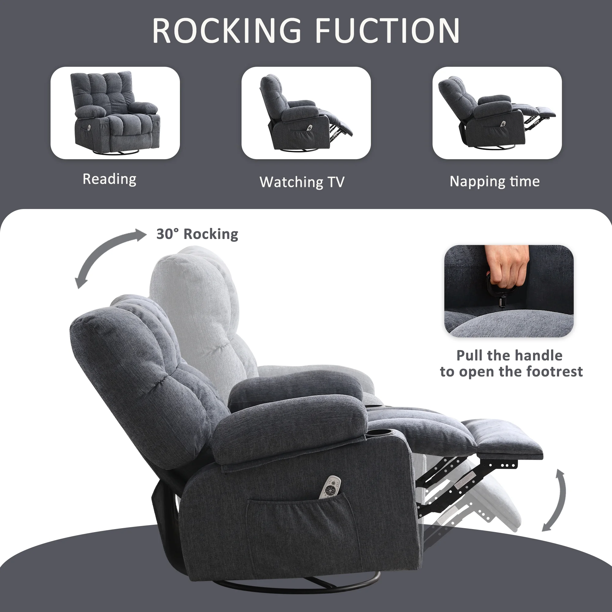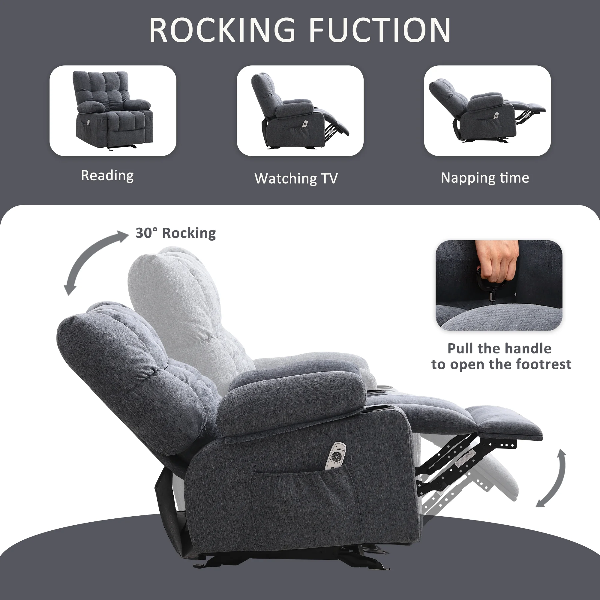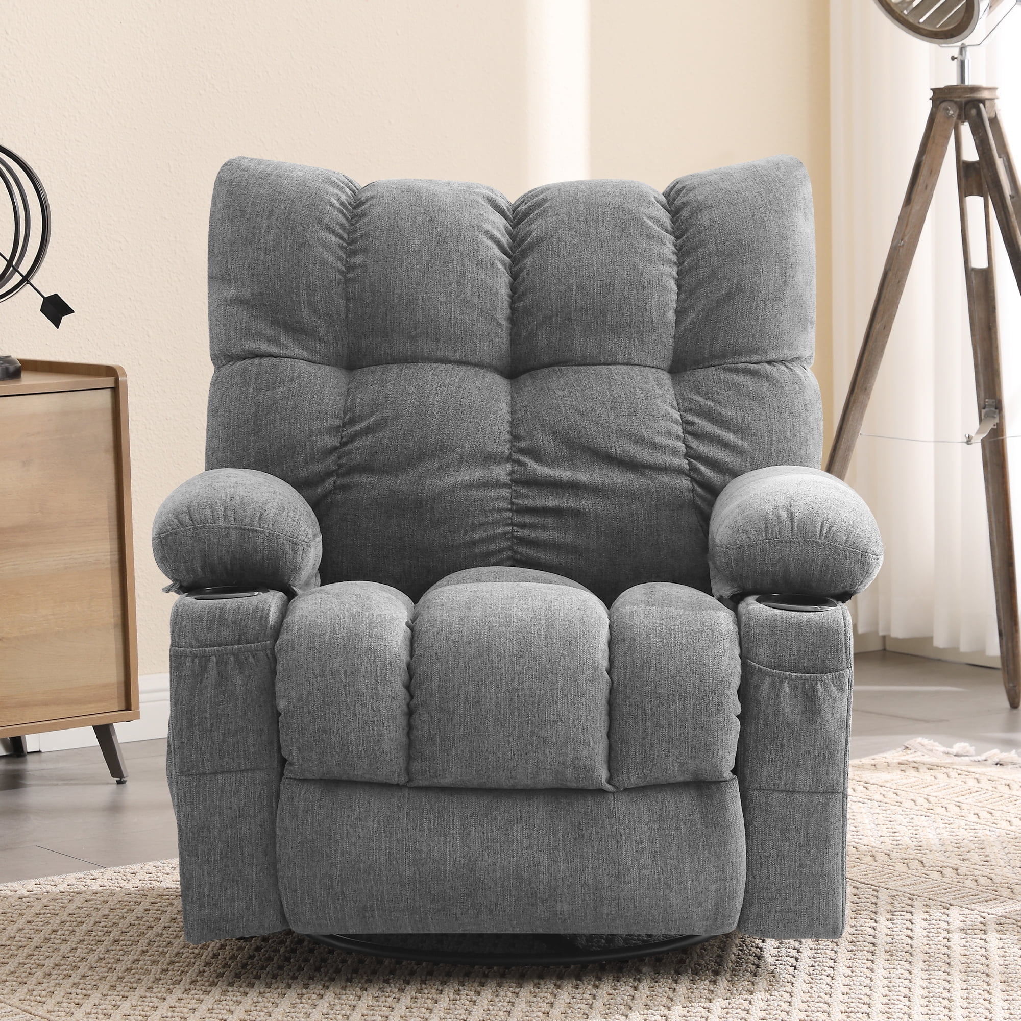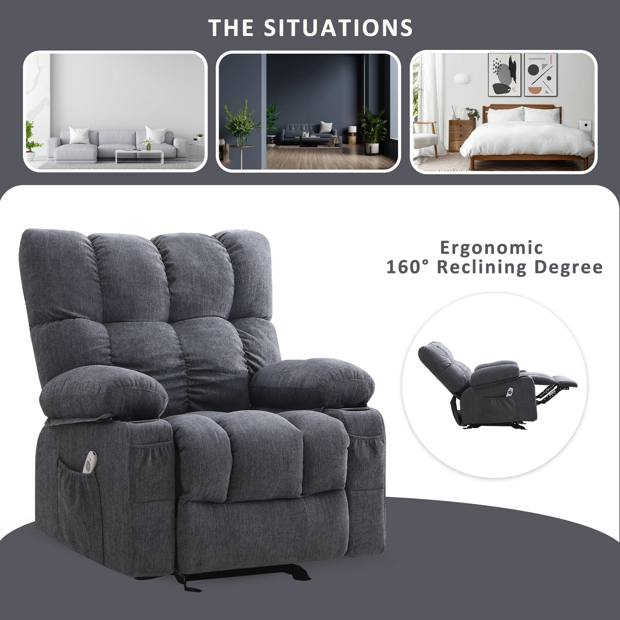 JONPONY Manual Recliner Chair with Heat Therapy and Massage Function, Heavy Duty Reclining Mechanism Massage Chair, Elderly Single Rocker Sofa with Cup Holders for Bedroom Home Theater, Grey