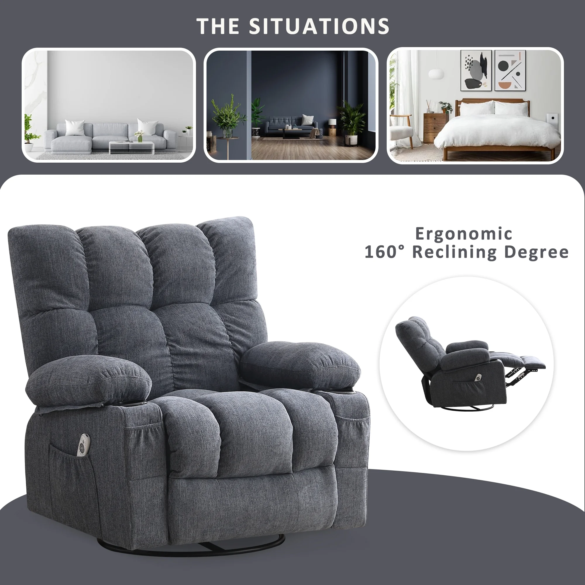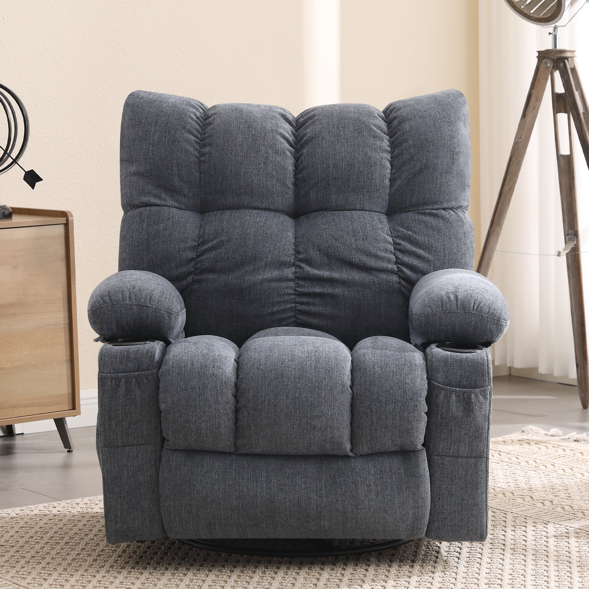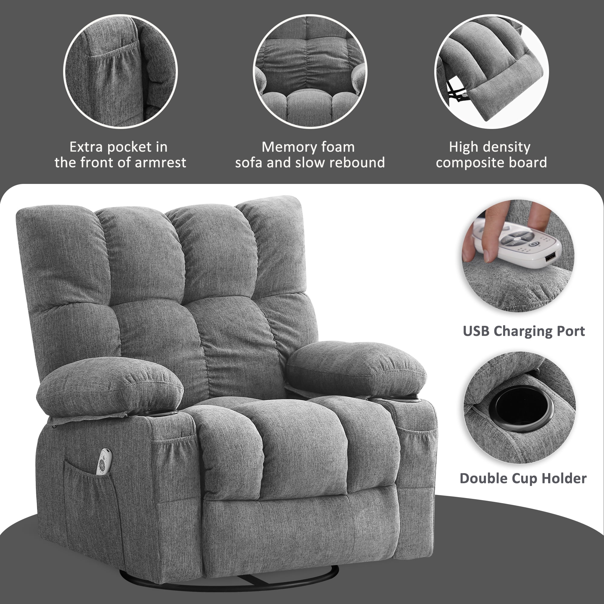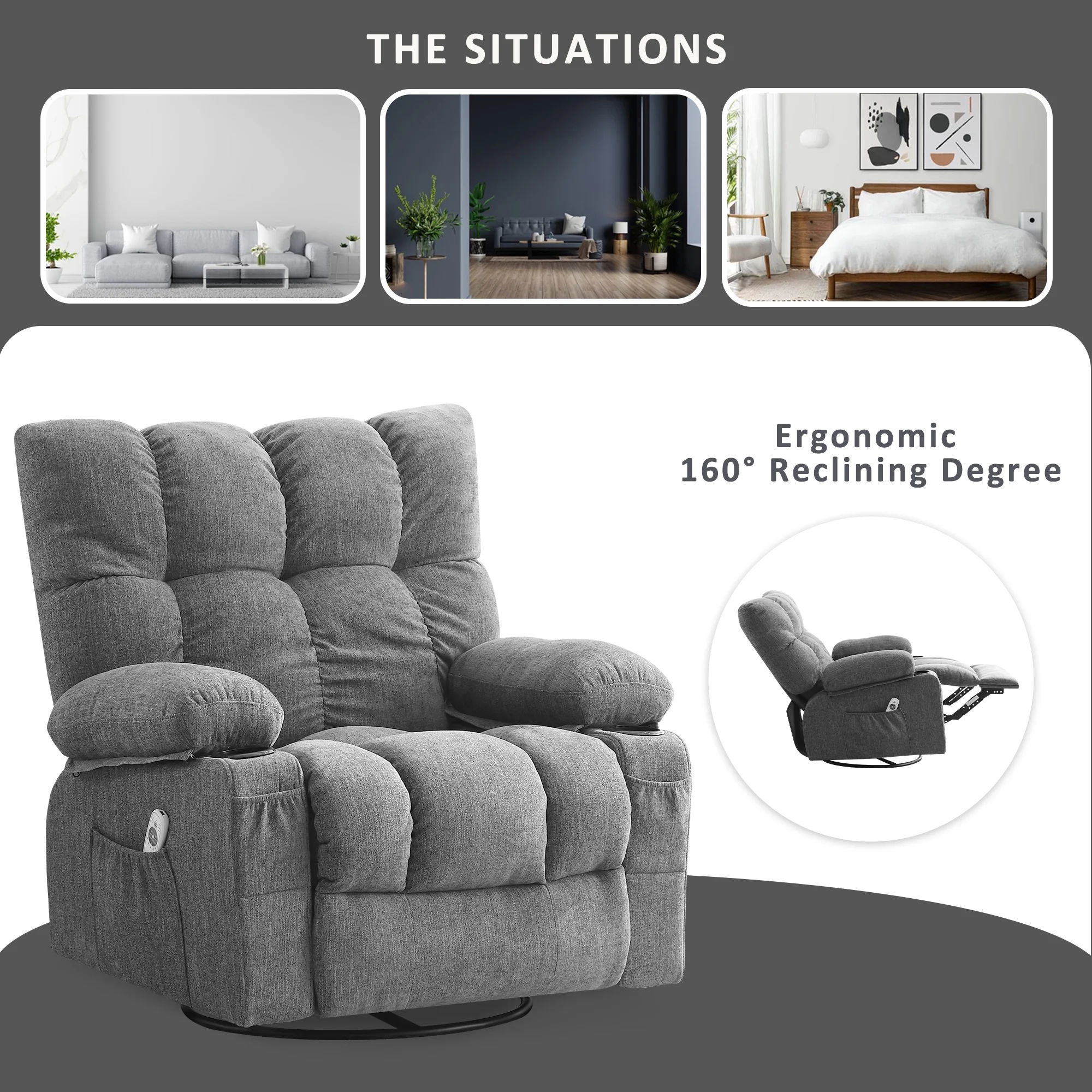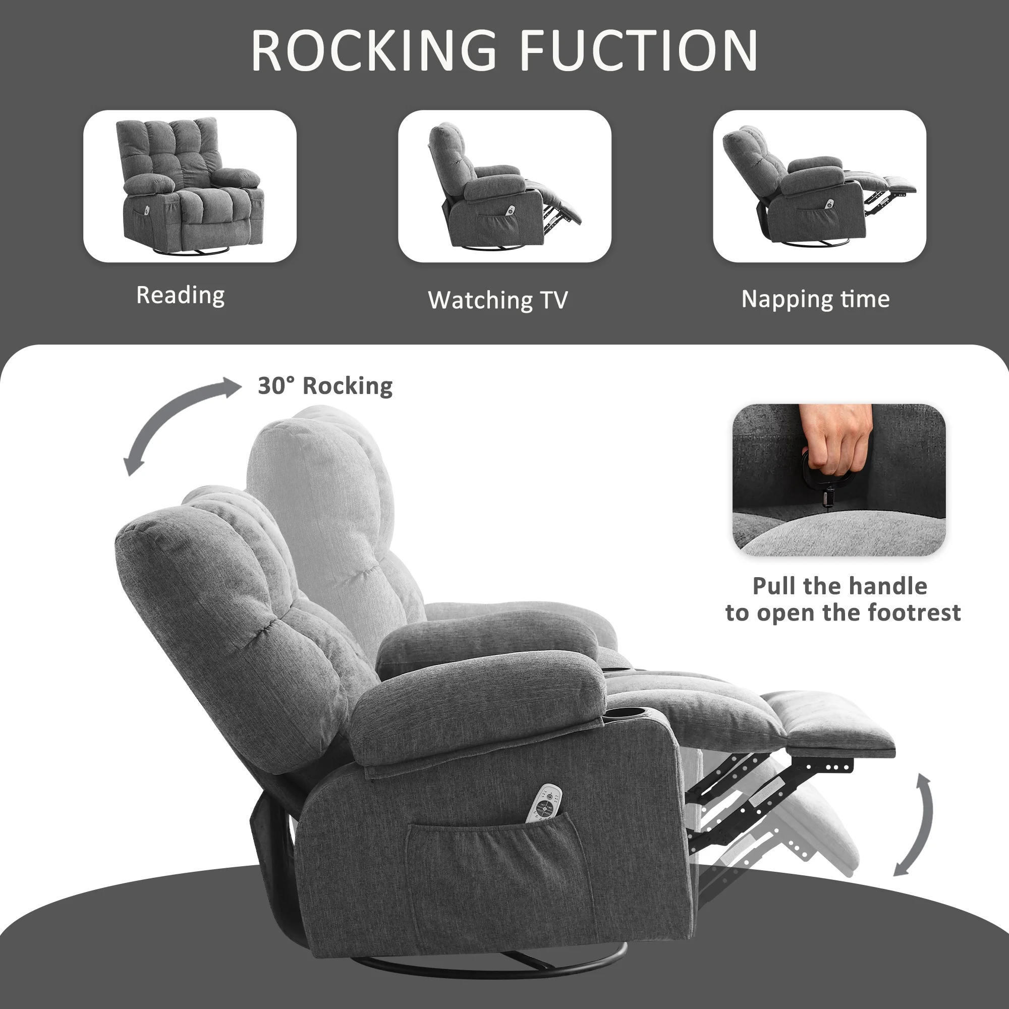 JONPONY Manual Recliner Chair with Heat Therapy and Massage Function, Heavy Duty Reclining Mechanism Massage Chair, Elderly Single Rocker Sofa with Cup Holders for Bedroom Home Theater, Grey