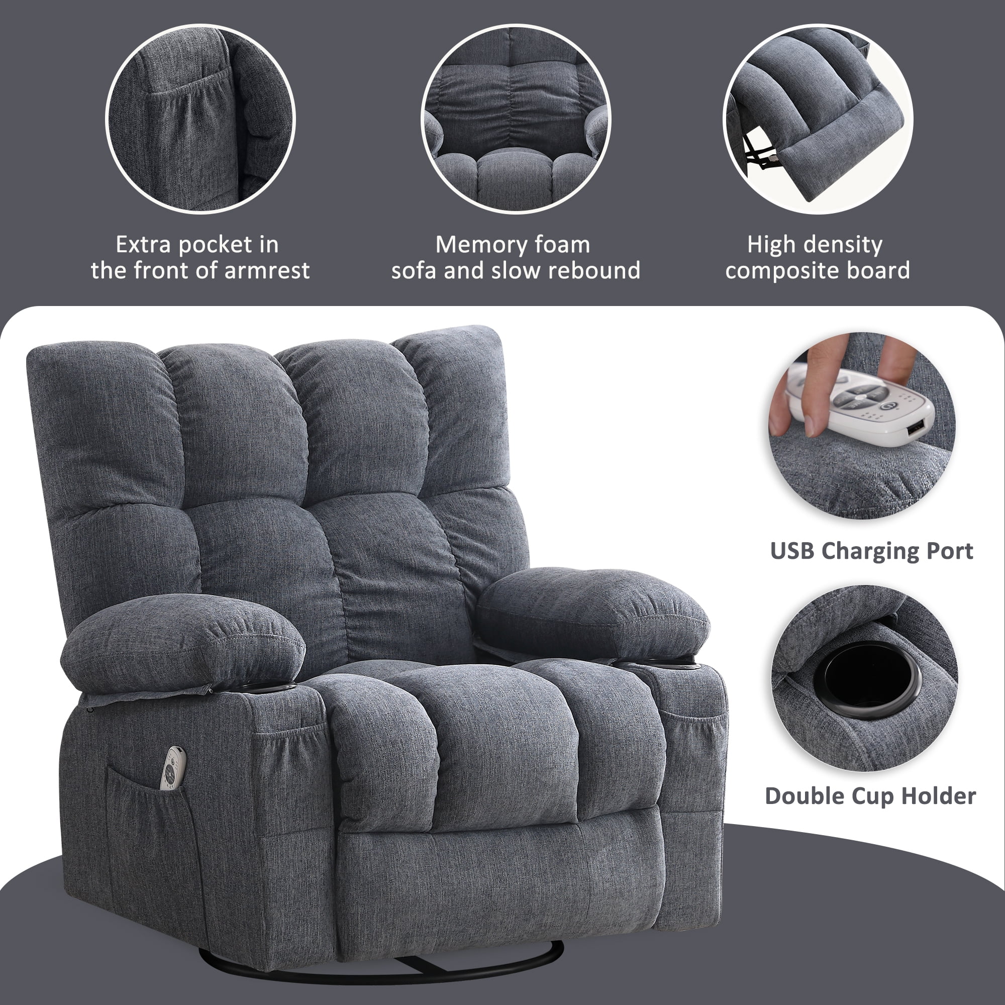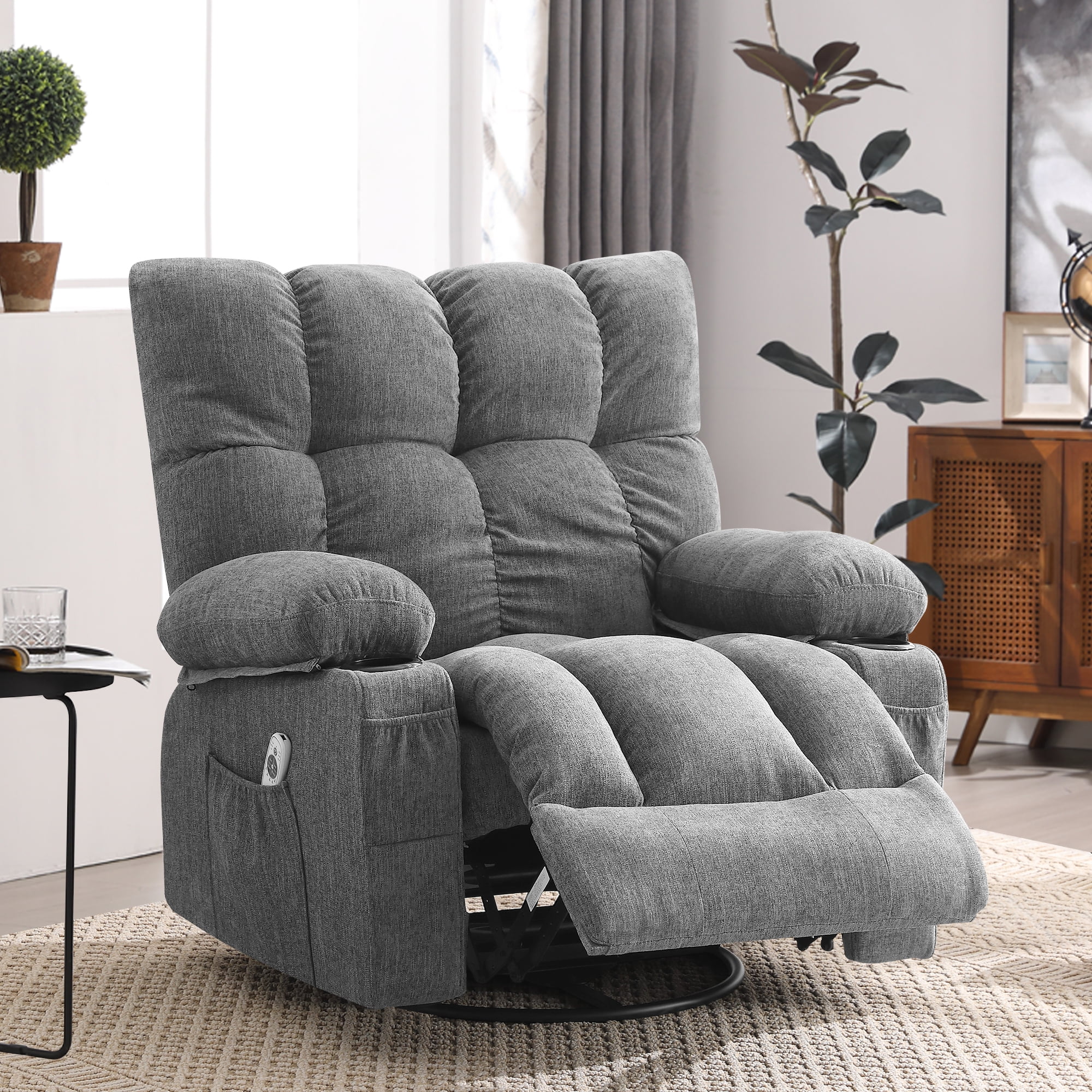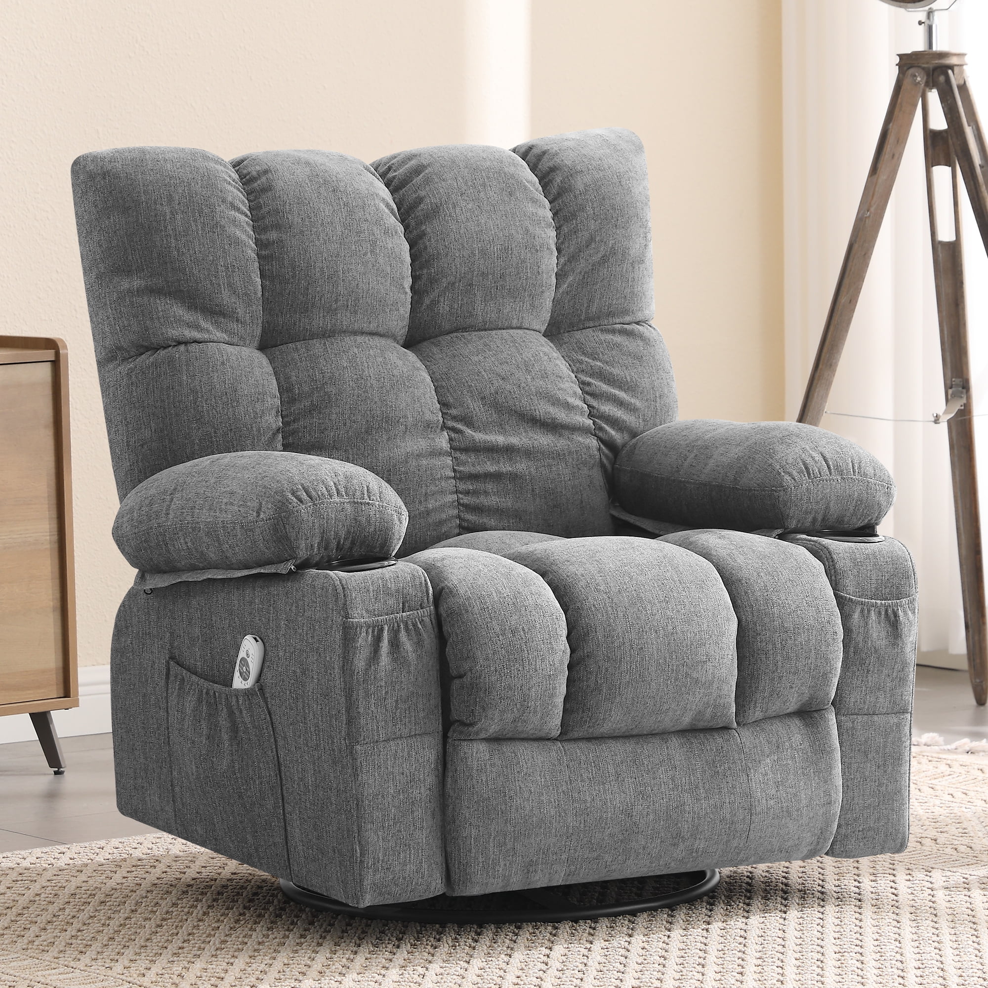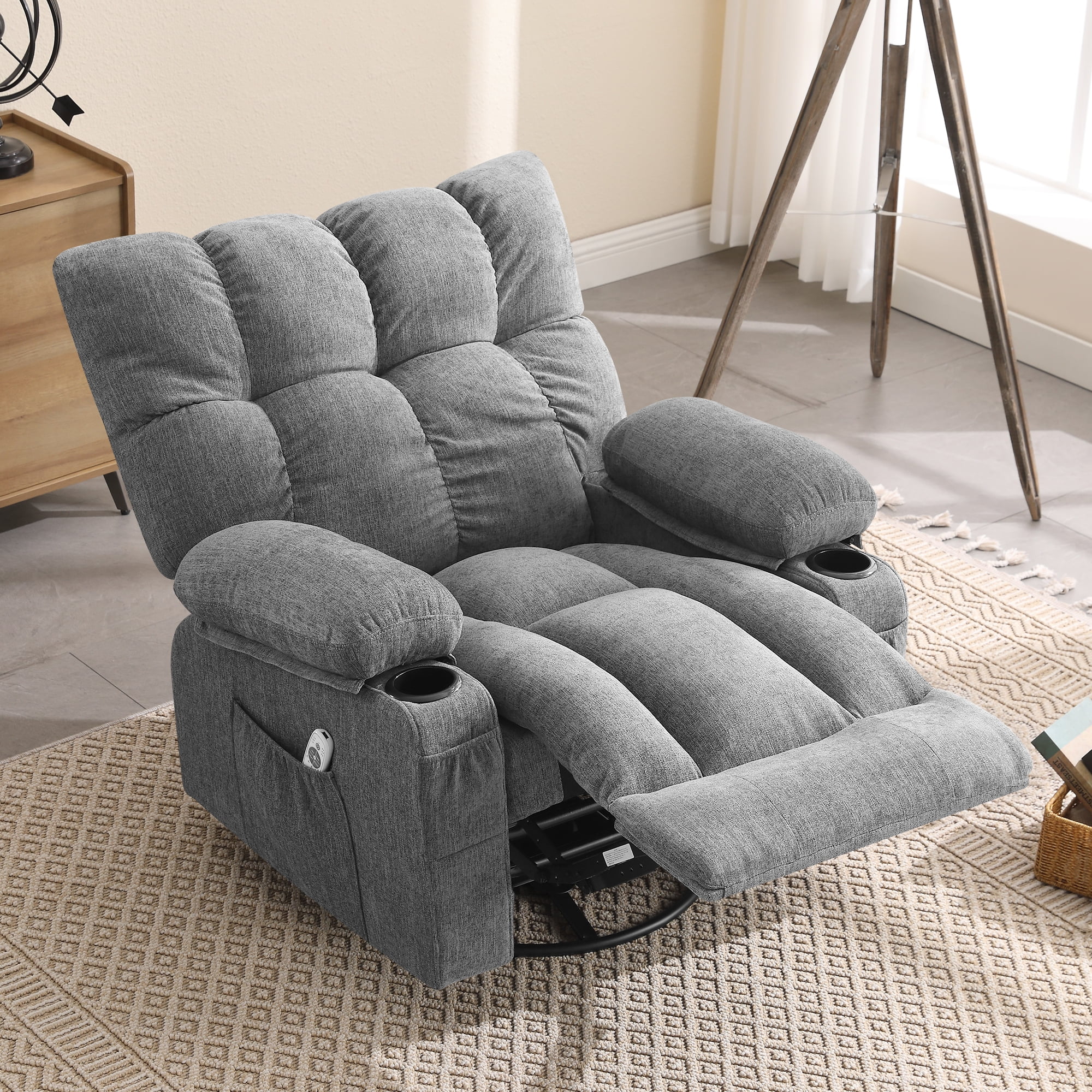 JONPONY Manual Recliner Chair with Heat Therapy and Massage Function, Heavy Duty Reclining Mechanism Massage Chair, Elderly Single Rocker Sofa with Cup Holders for Bedroom Home Theater, Grey