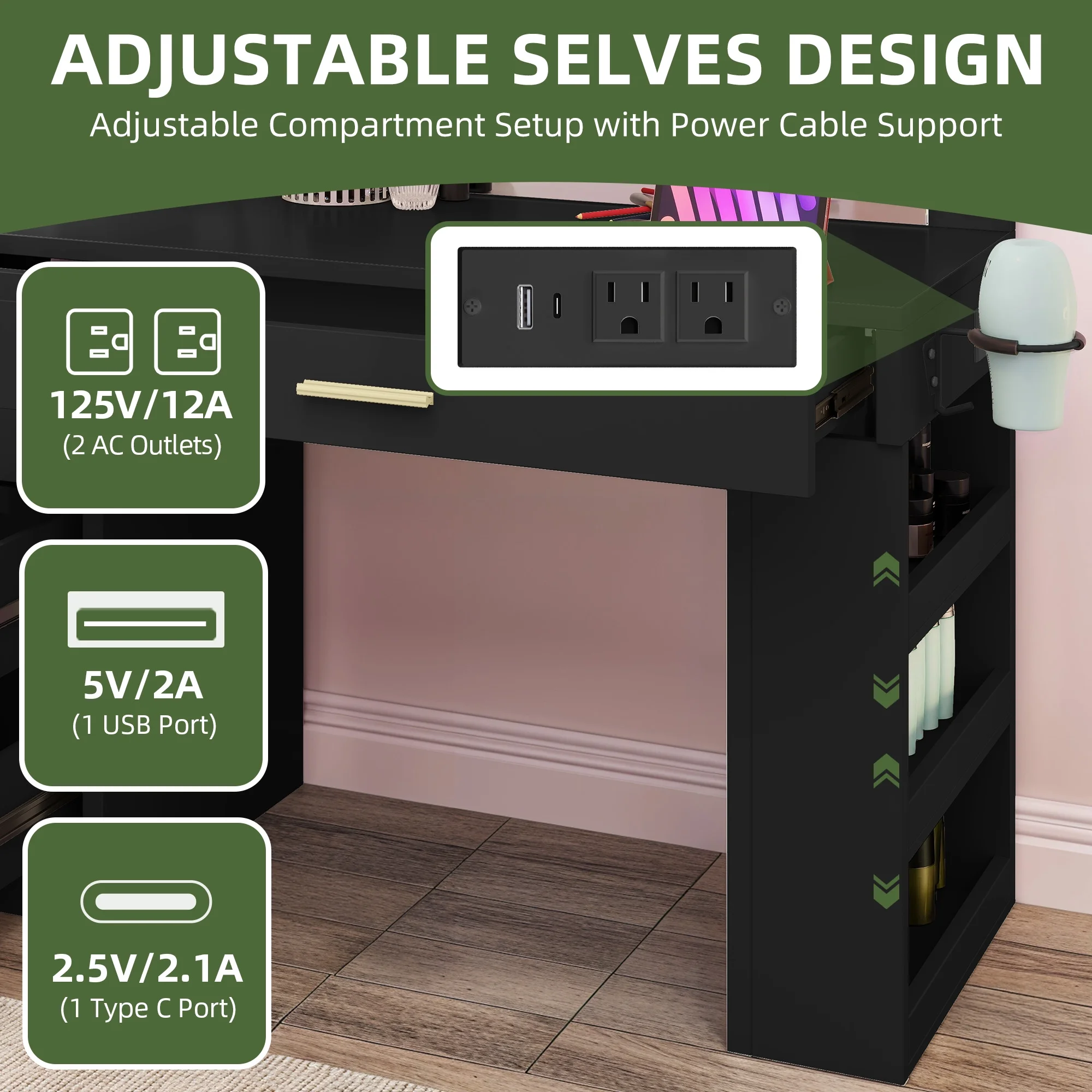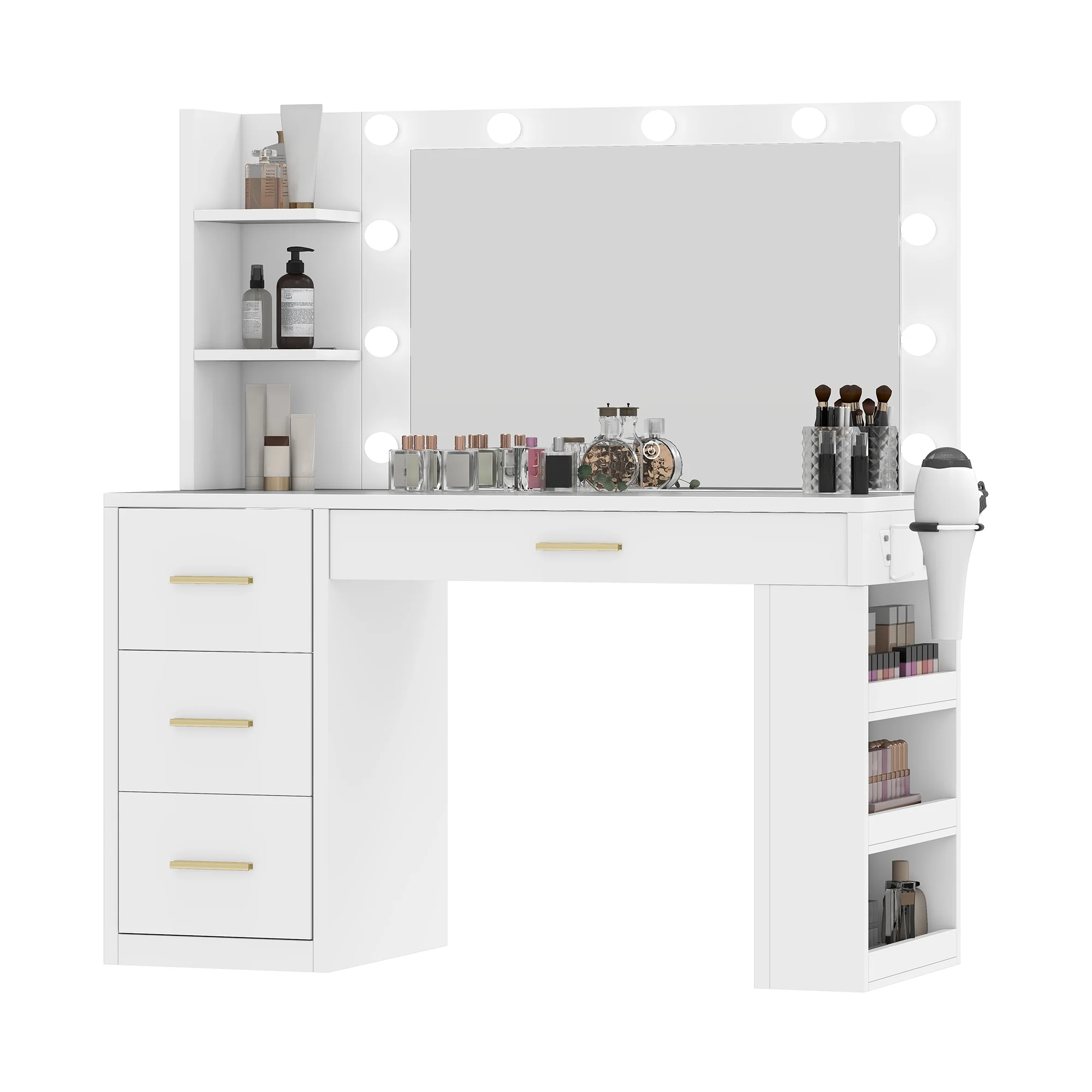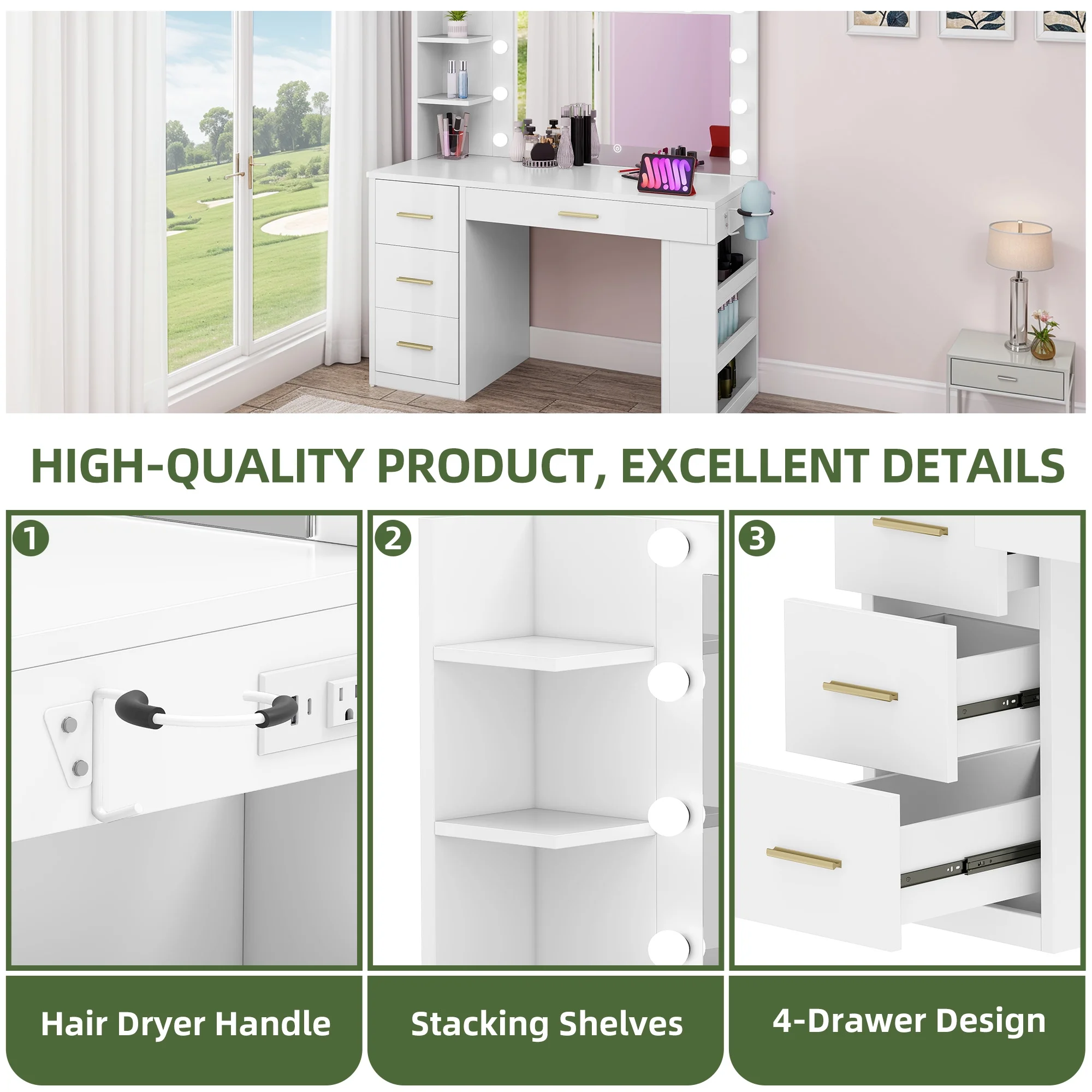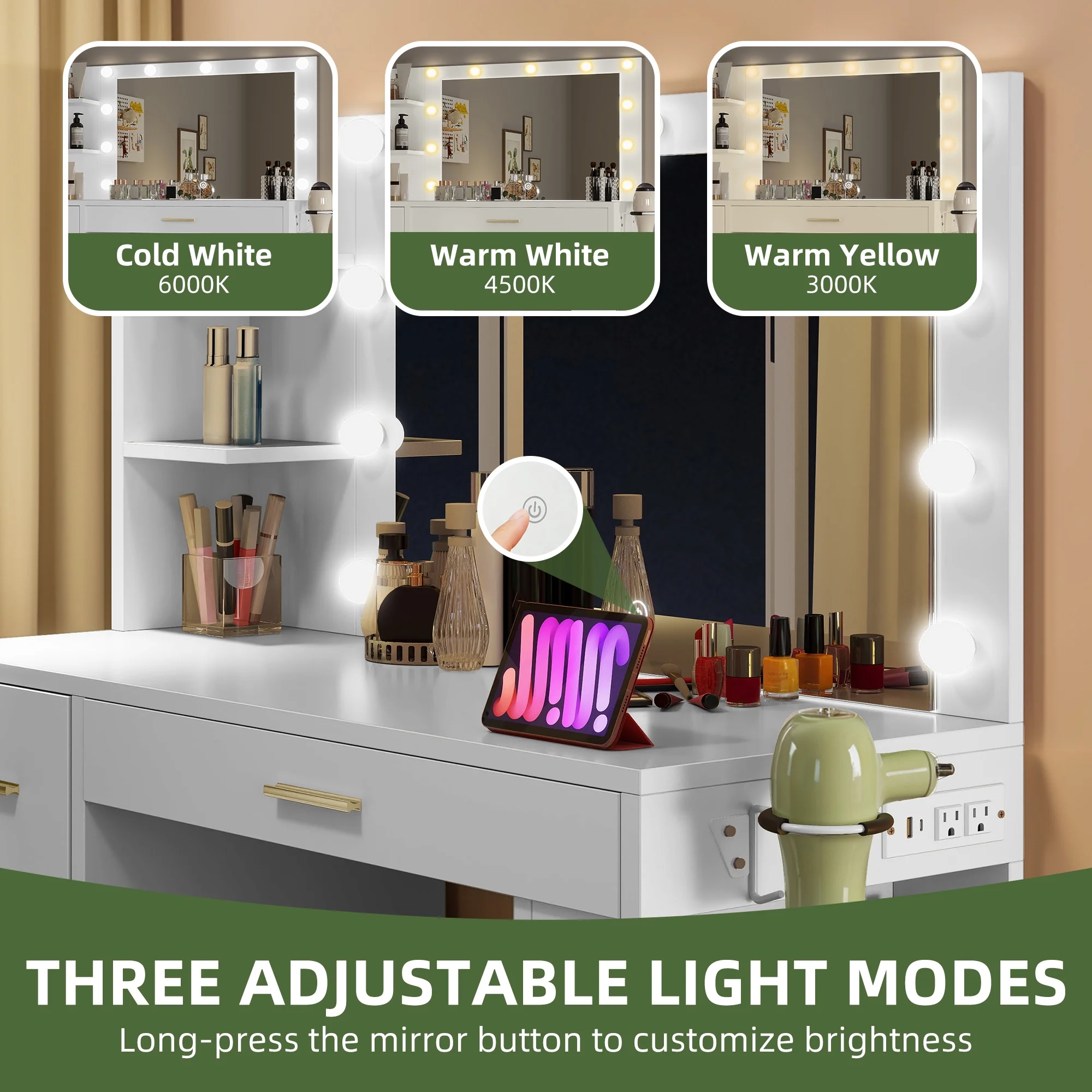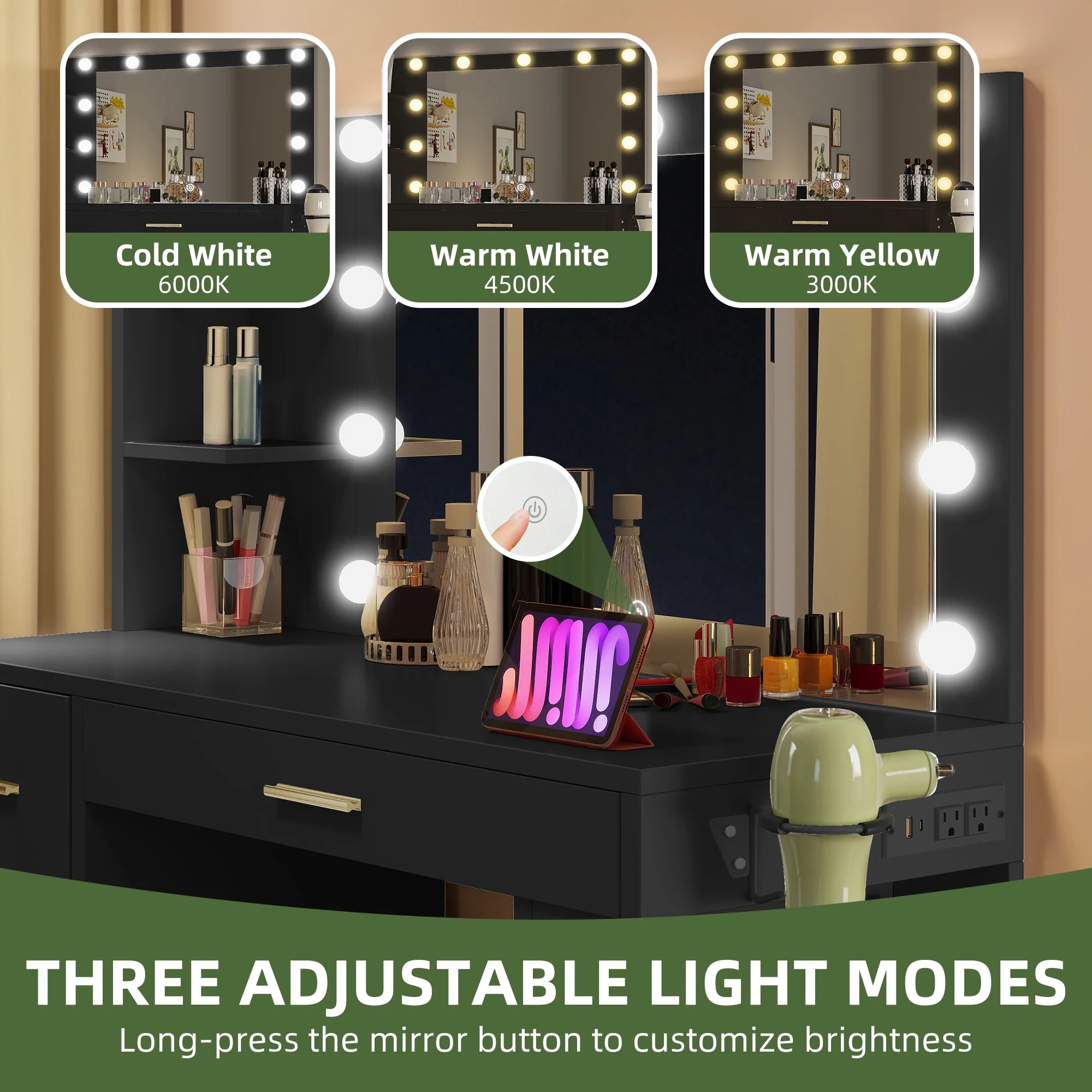 - Bulb-Illuminated Vanity with Power Ports: Our makeup table has a spacious mirror lit by 11 bulbs with 3 adjustable color modes. It also includes 2 AC outlets and 2 USB ports to charge your phone and power beauty tools in one spot.