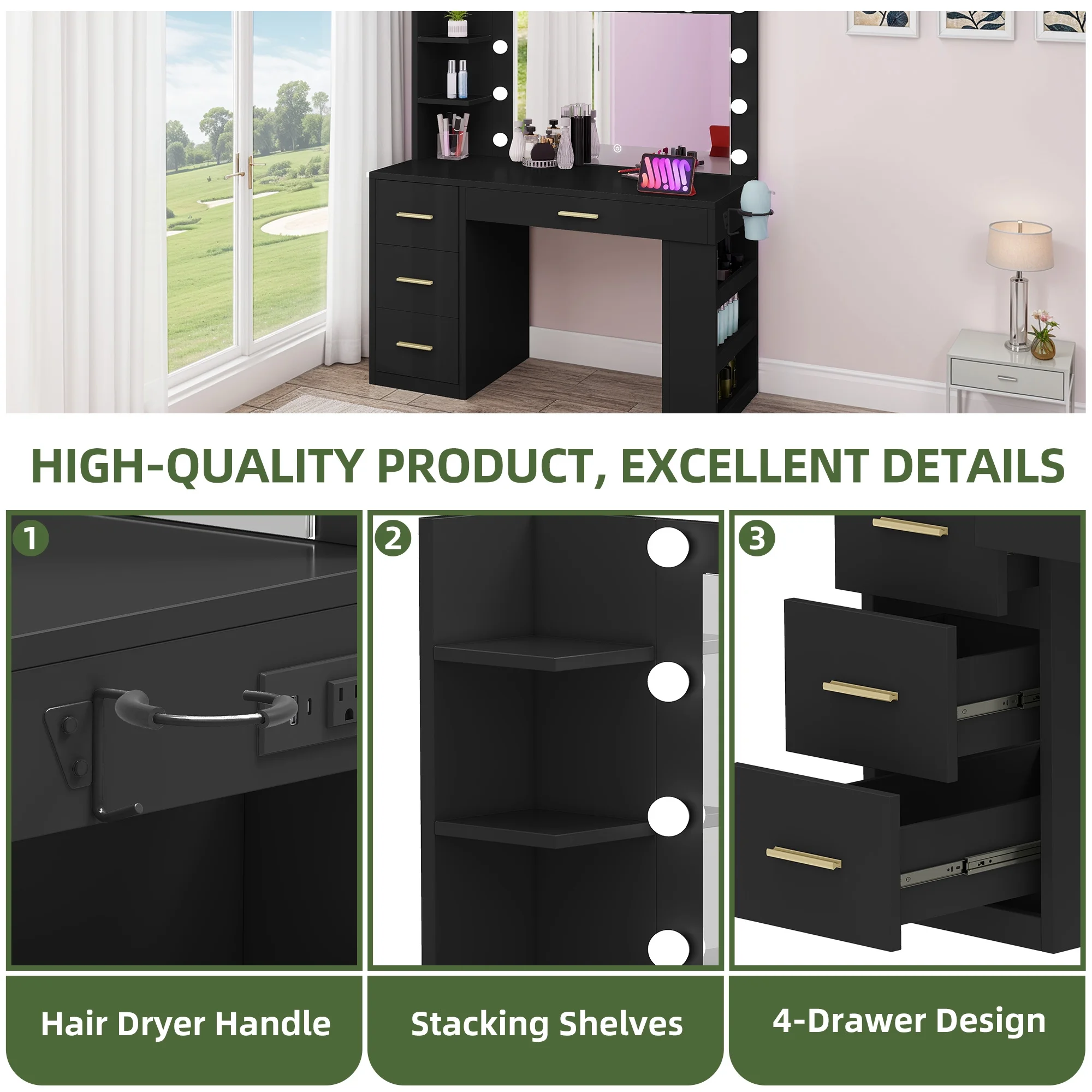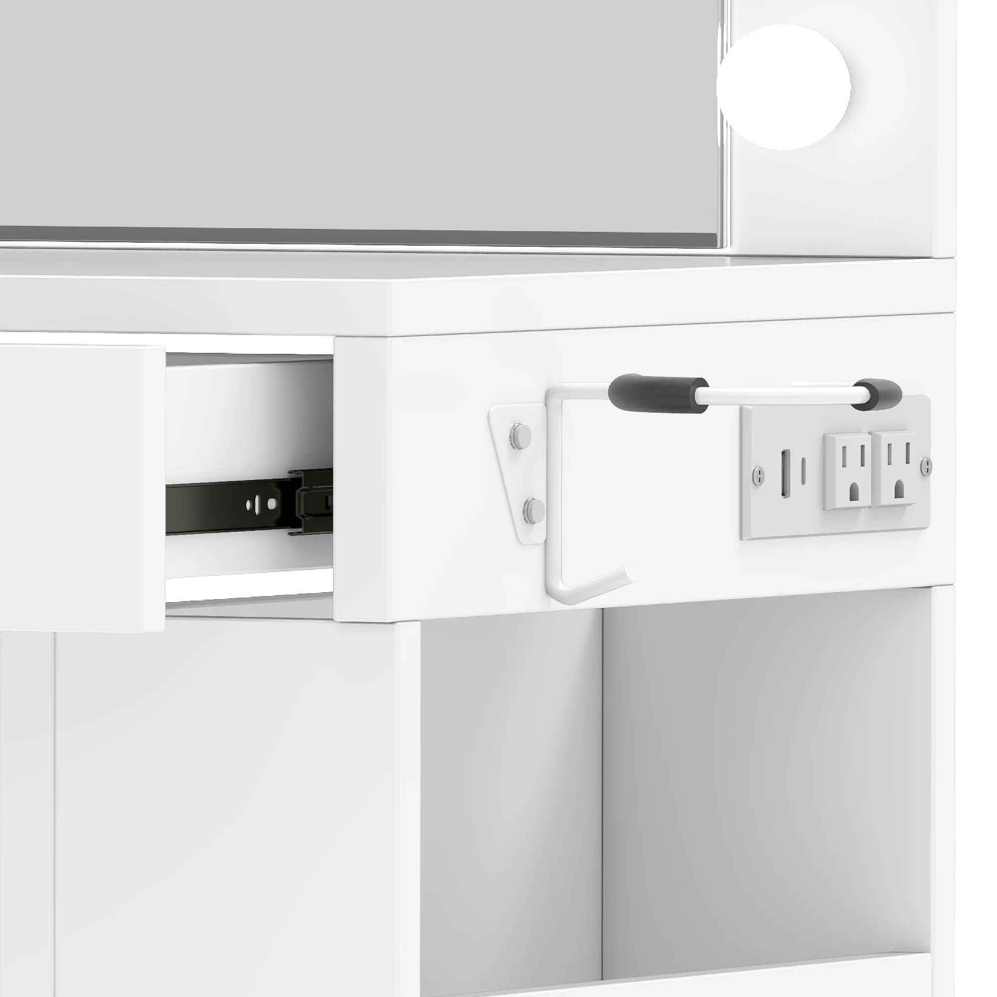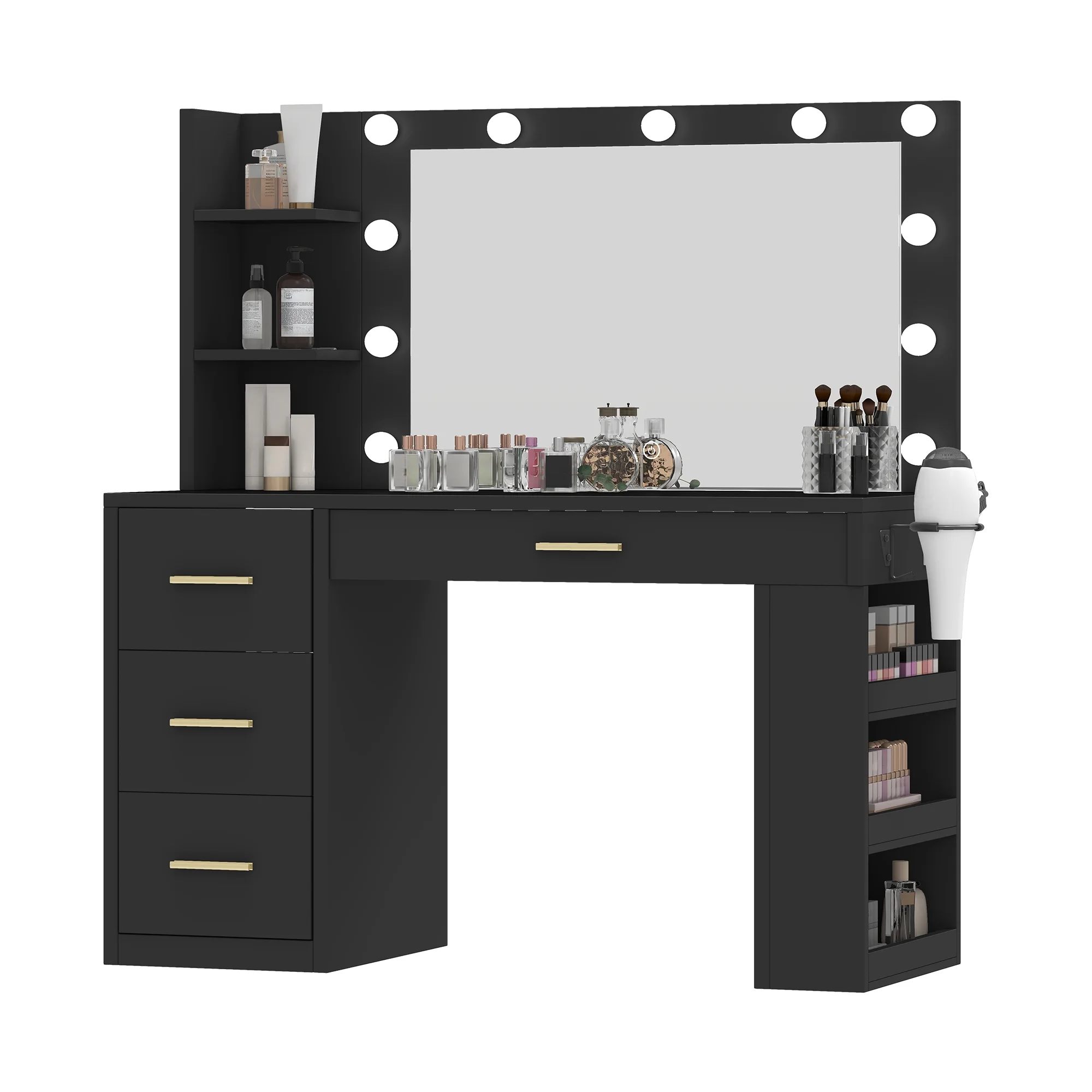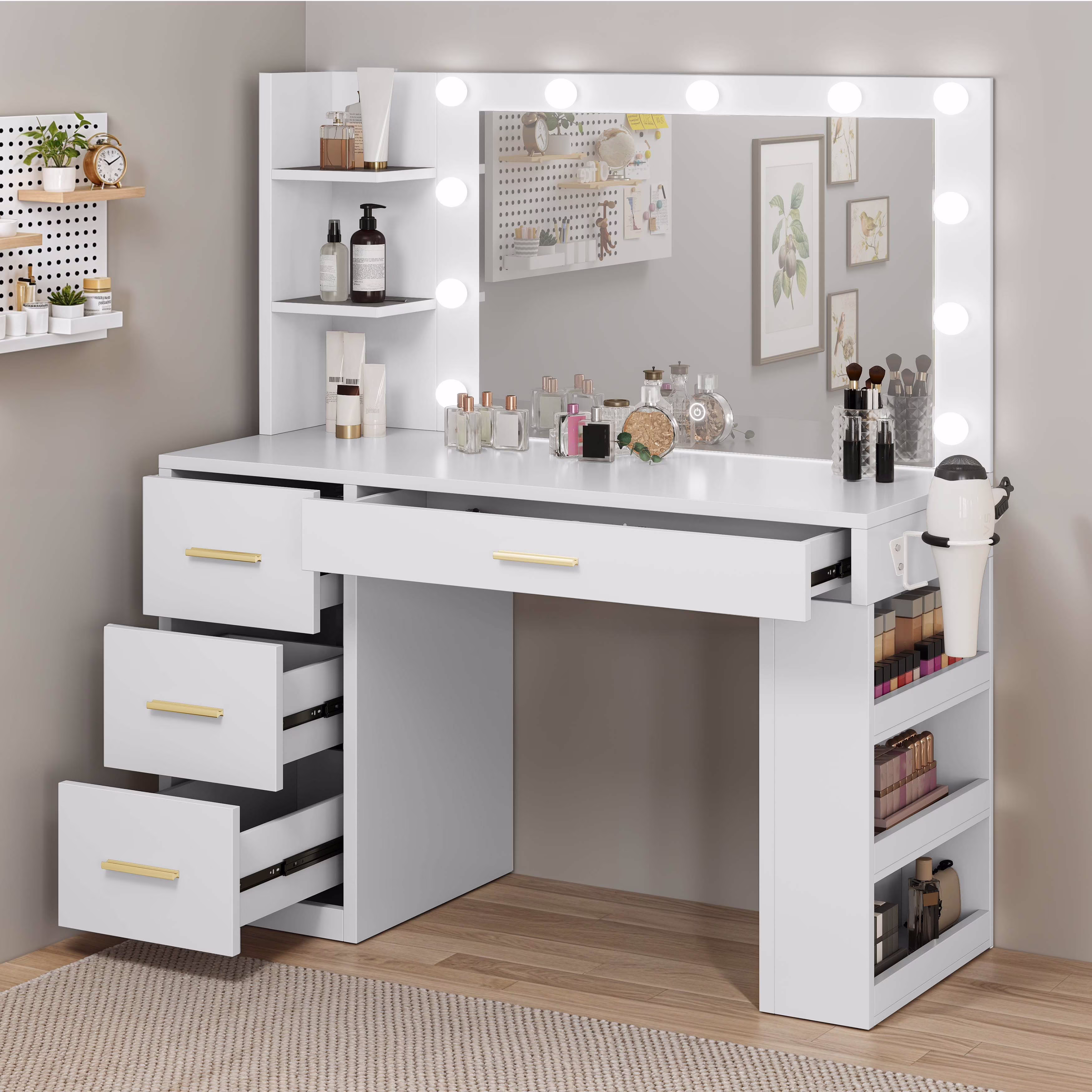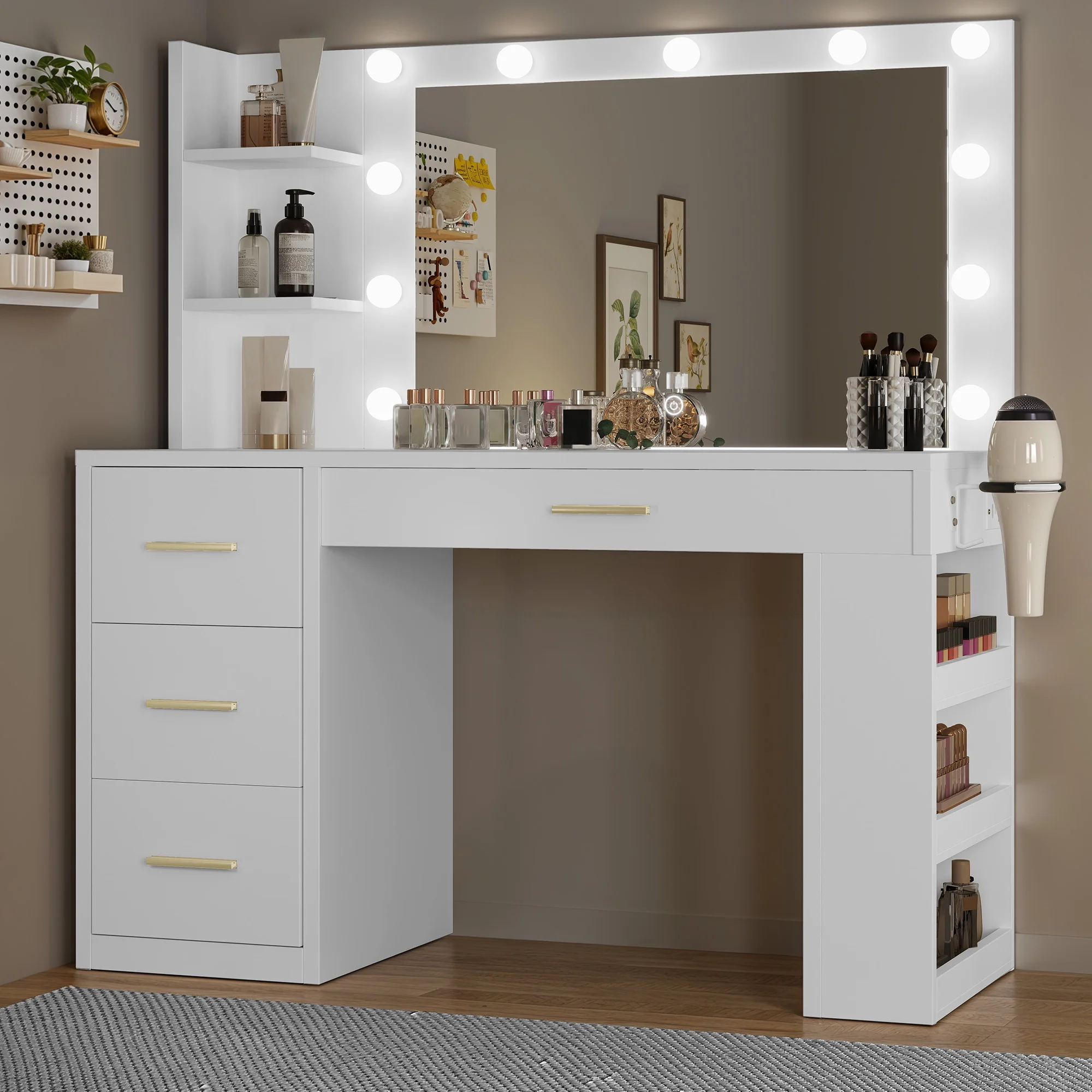 - Bulb-Illuminated Vanity with Power Ports: Our makeup table has a spacious mirror lit by 11 bulbs with 3 adjustable color modes. It also includes 2 AC outlets and 2 USB ports to charge your phone and power beauty tools in one spot.