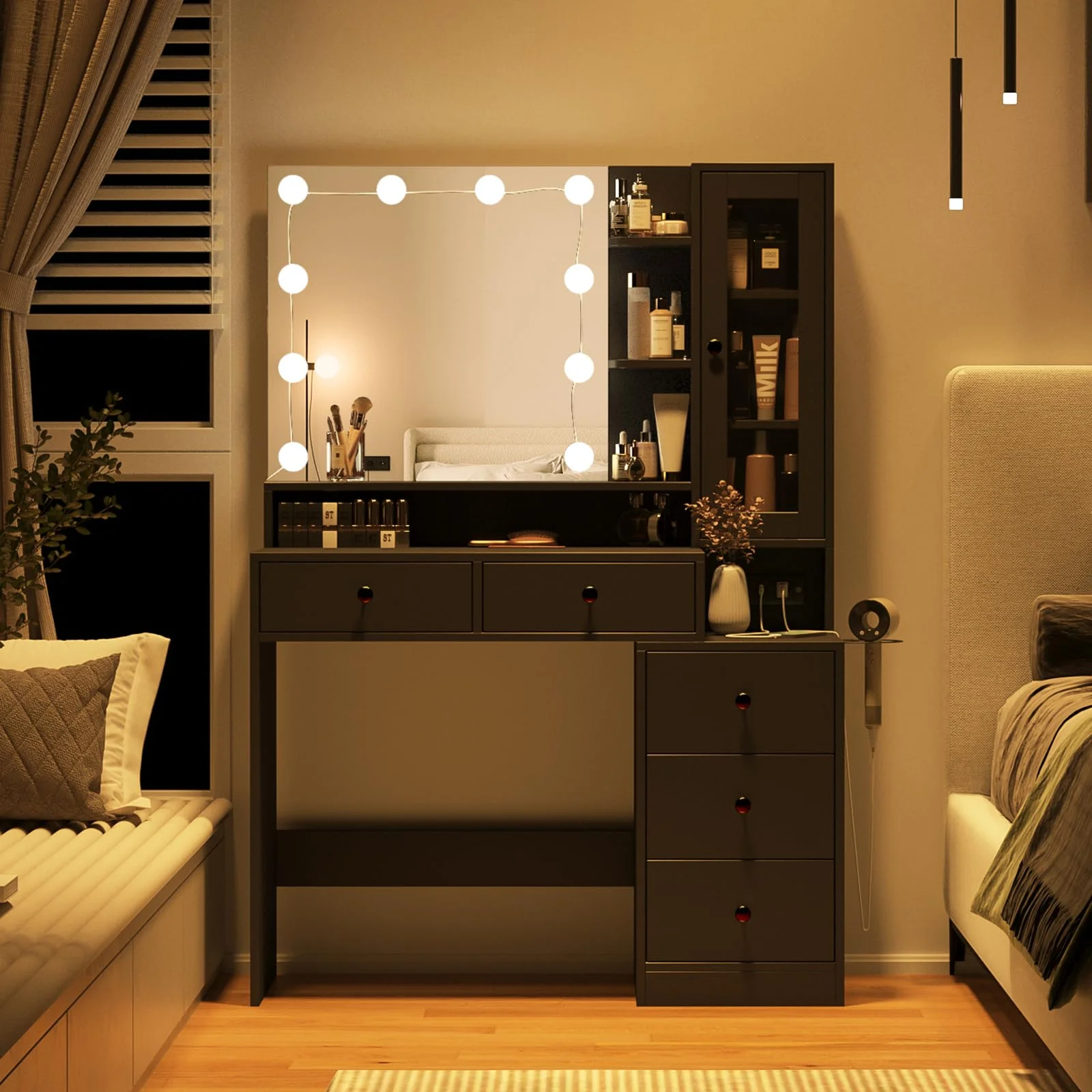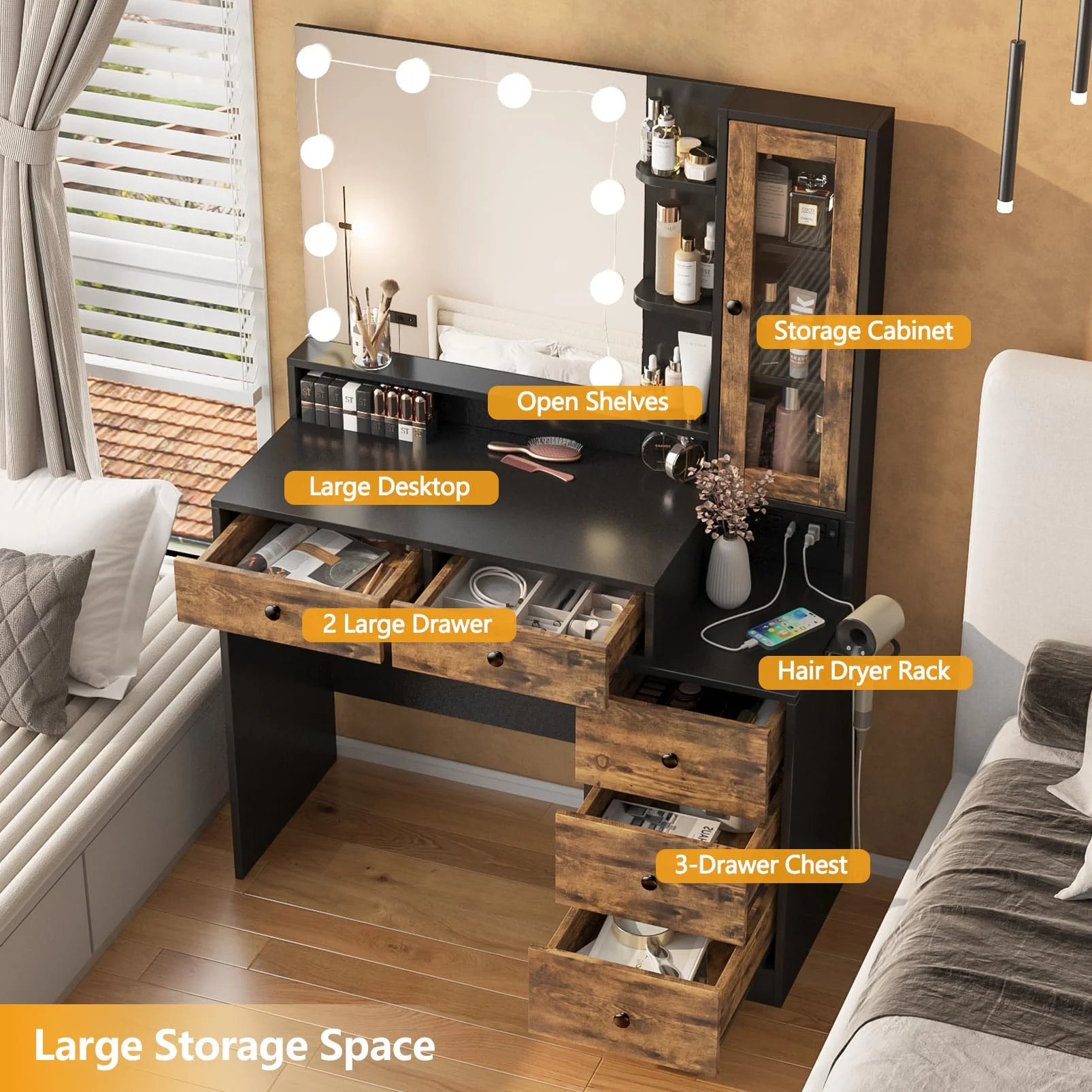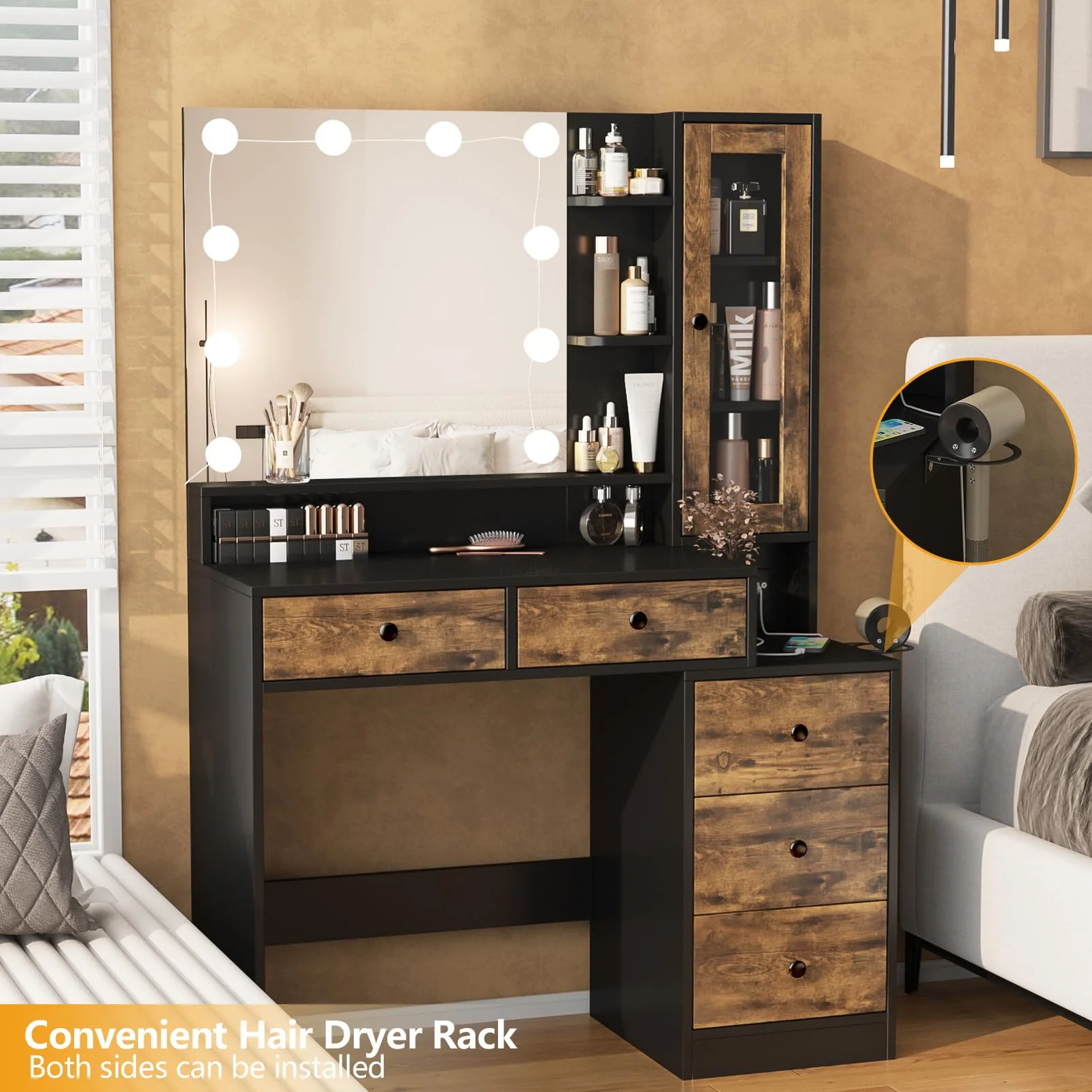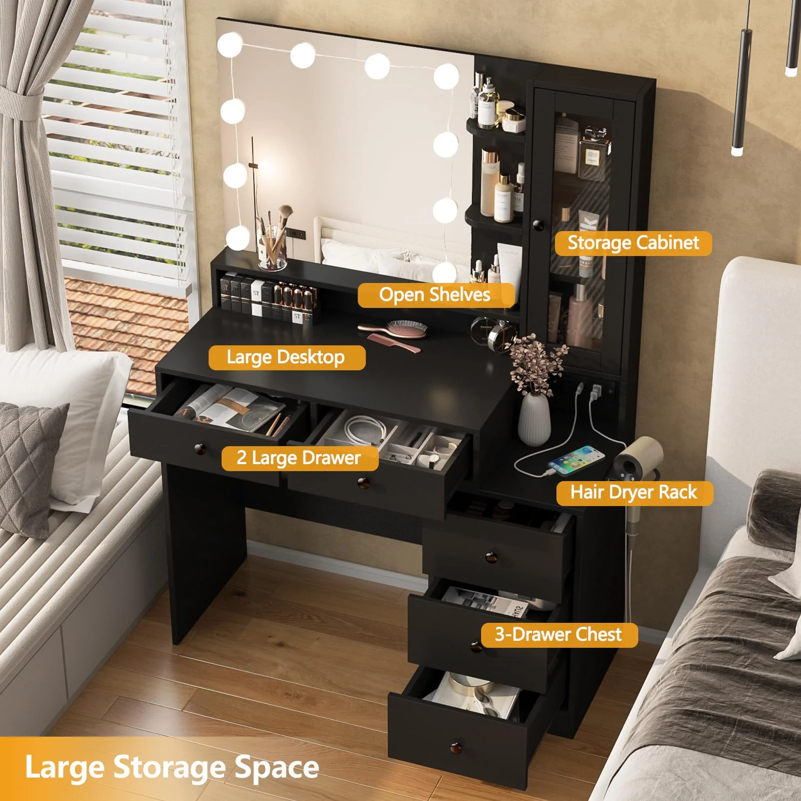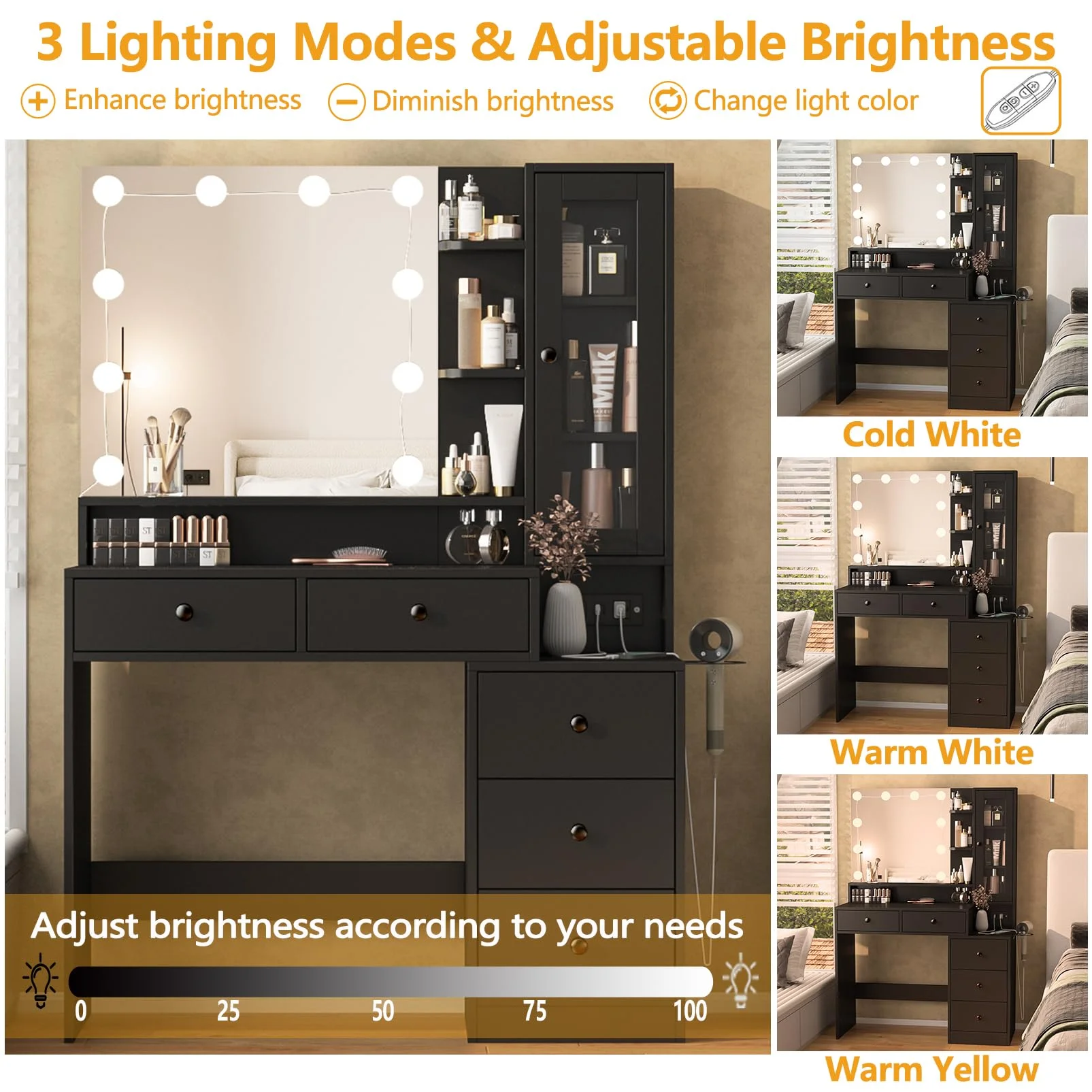 - 10 Led Lights 3 Lighting Modes Adjustable Brightness|2 Power Outlets and 2 USB Ports|5 Large Drawers for Storage|1 Cabinet with Glass Door|Open shelves|Built-in Hair Dryer Rack|Beautiful Modern Style