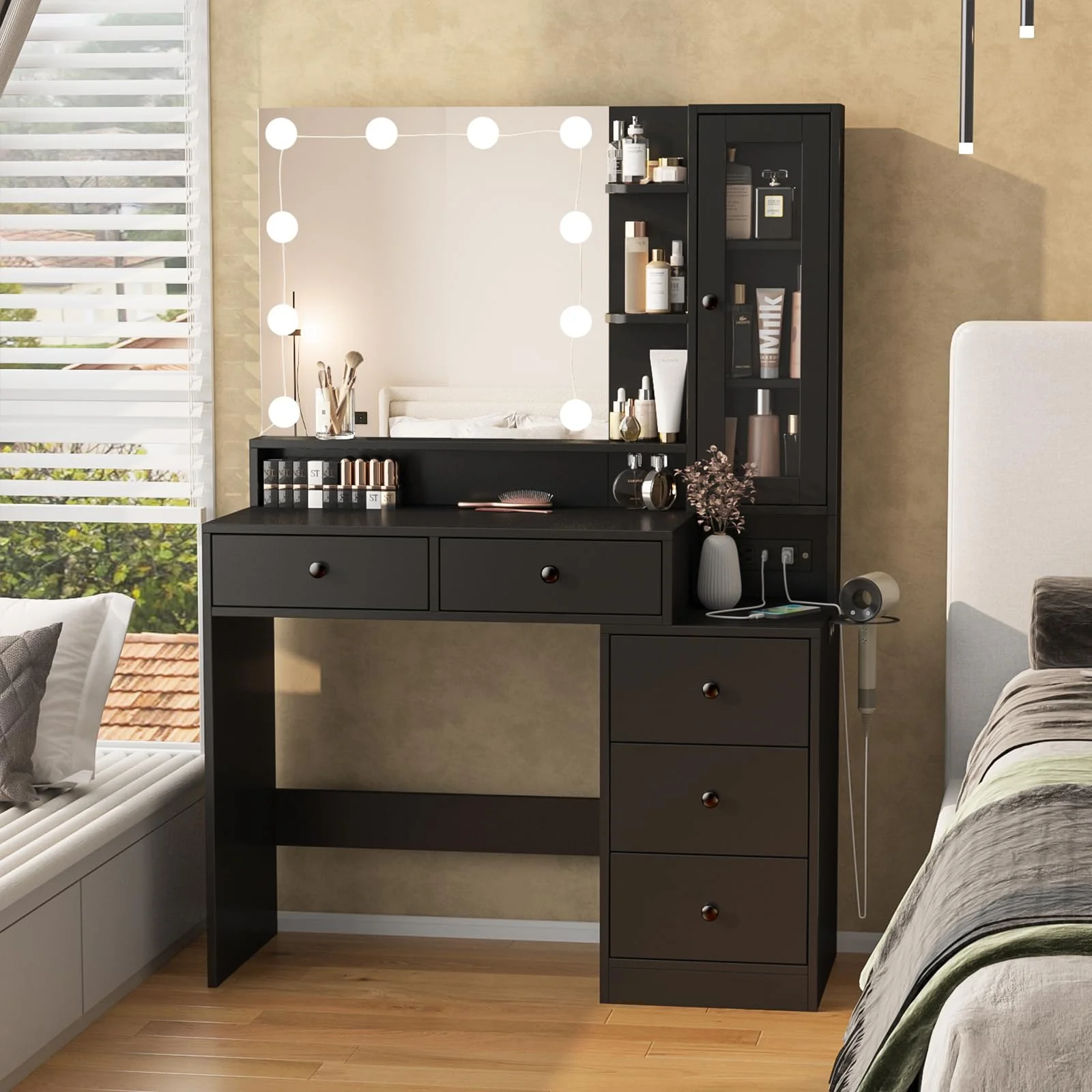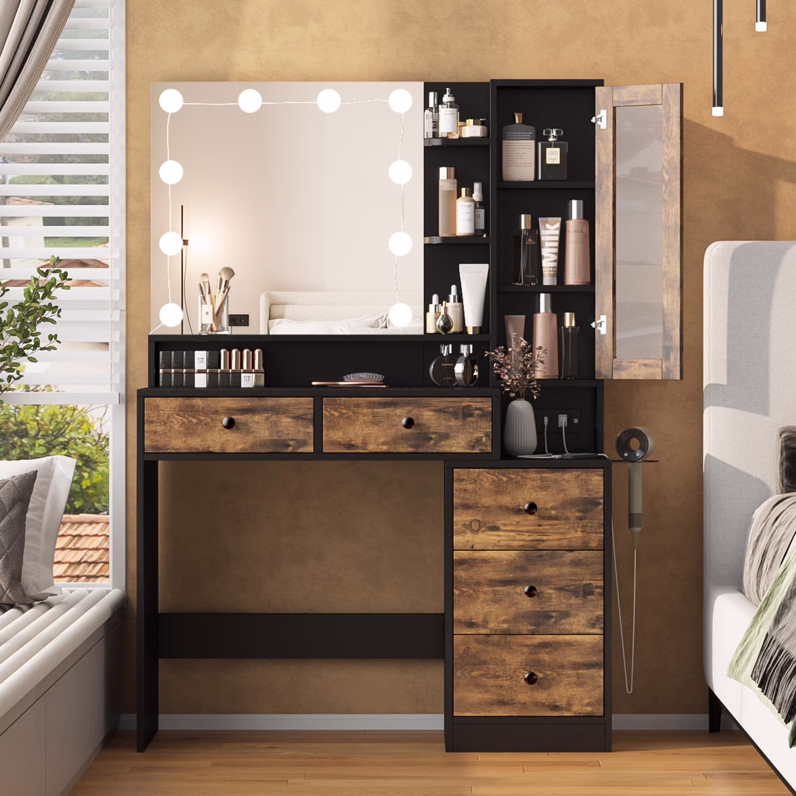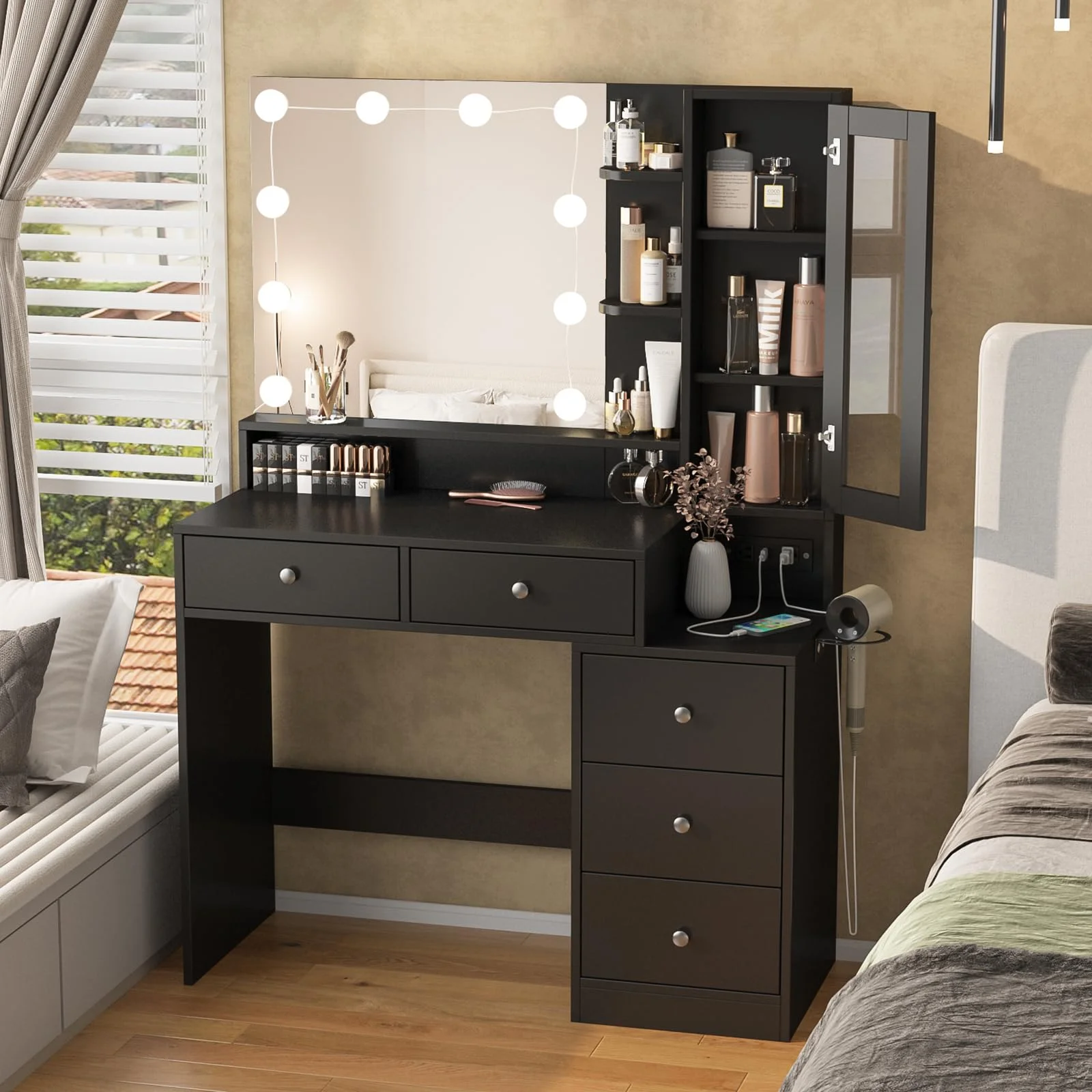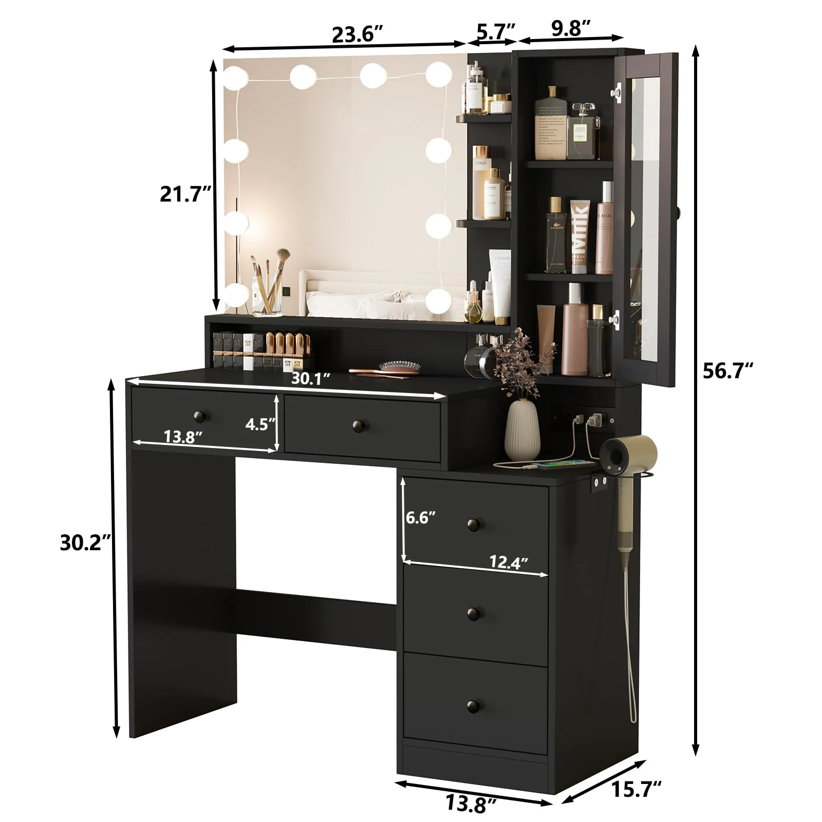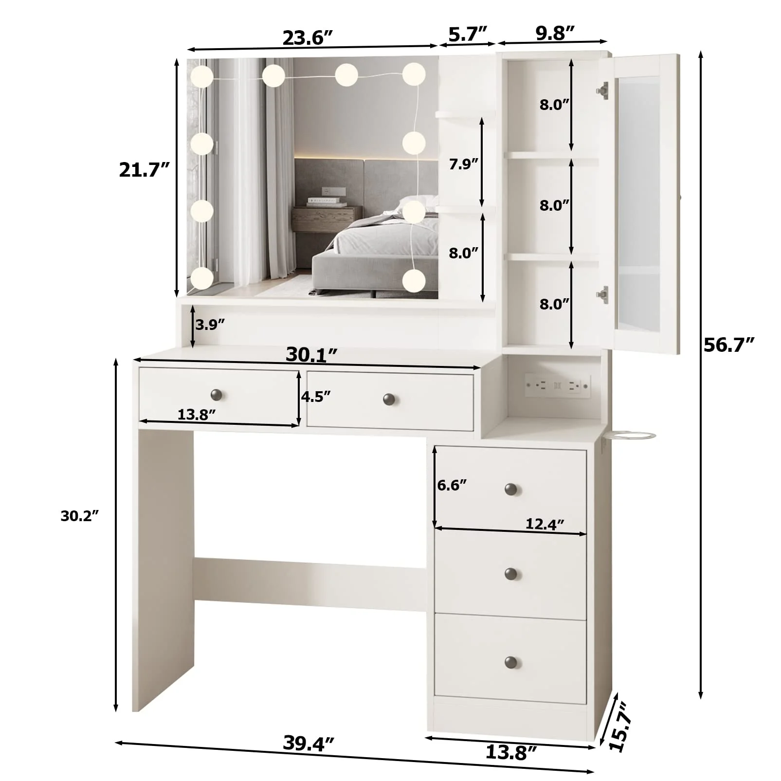 - 10 Led Lights 3 Lighting Modes Adjustable Brightness|2 Power Outlets and 2 USB Ports|5 Large Drawers for Storage|1 Cabinet with Glass Door|Open shelves|Built-in Hair Dryer Rack|Beautiful Modern Style