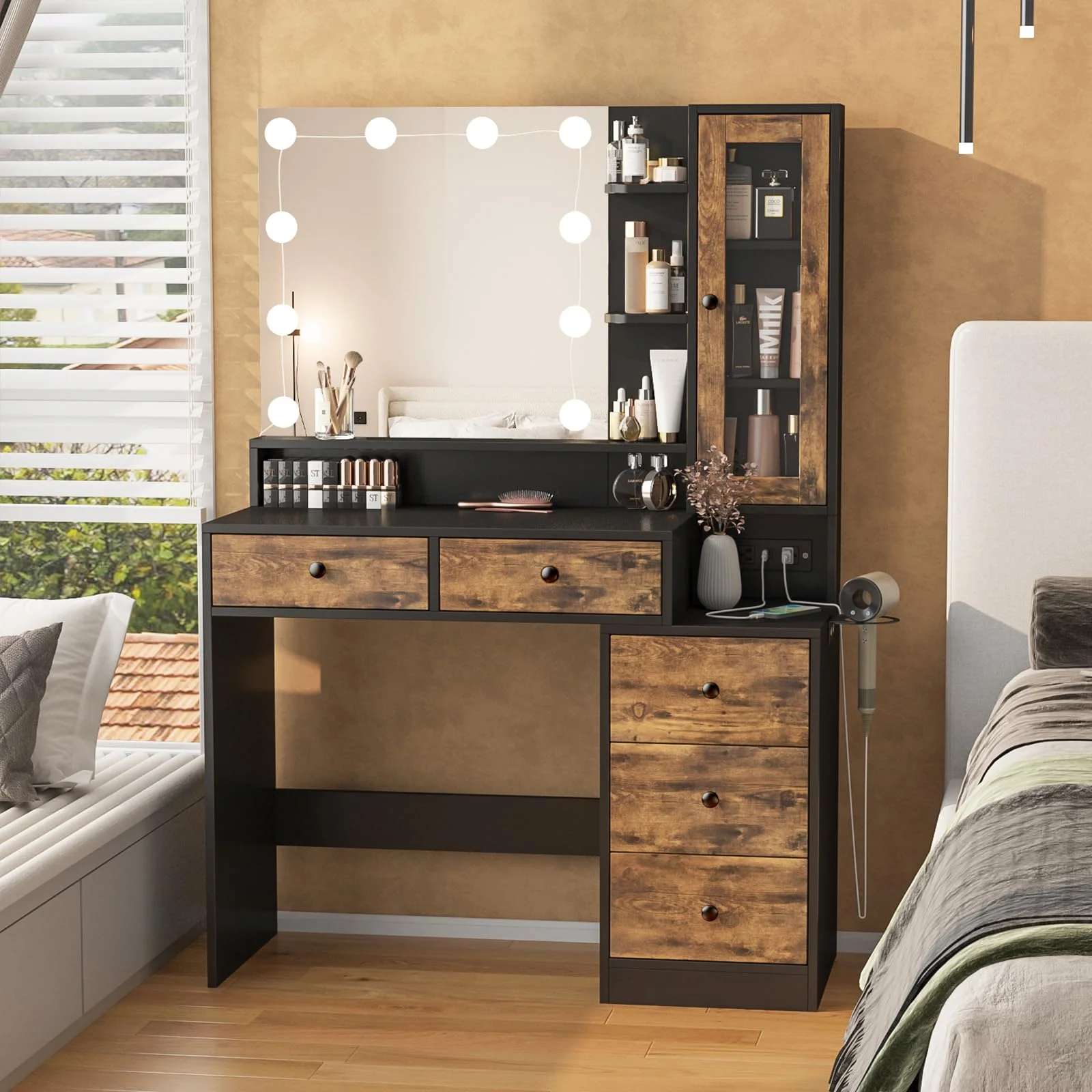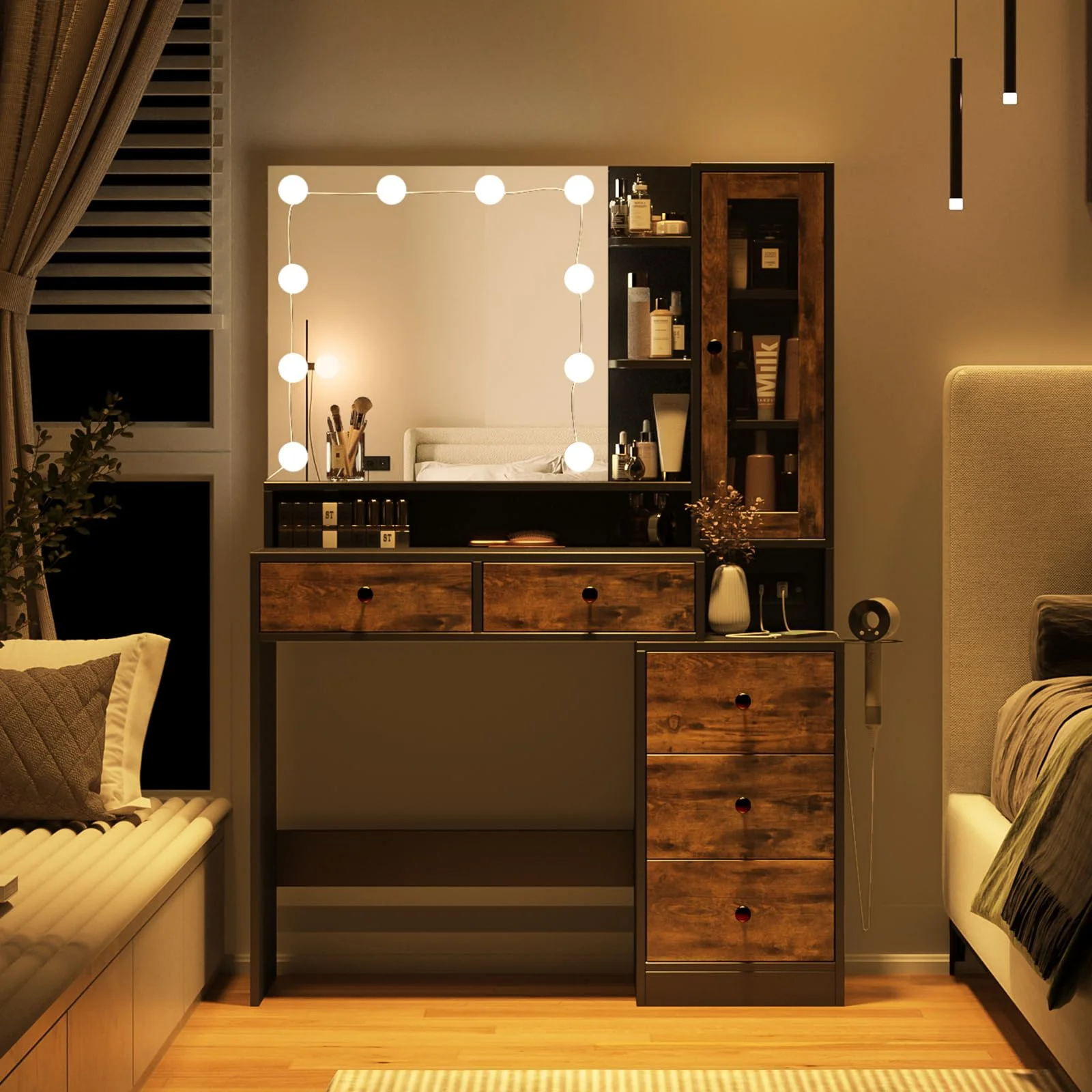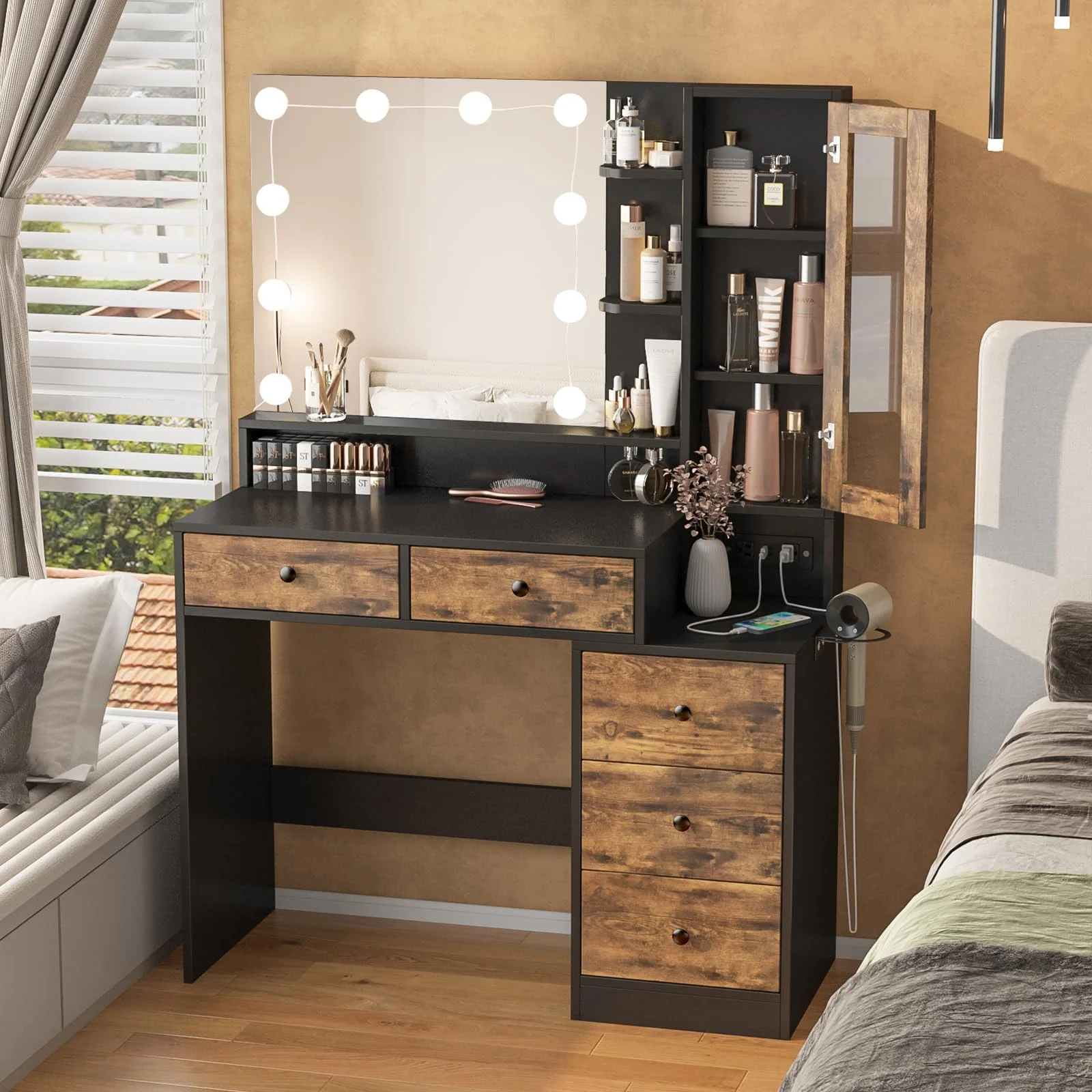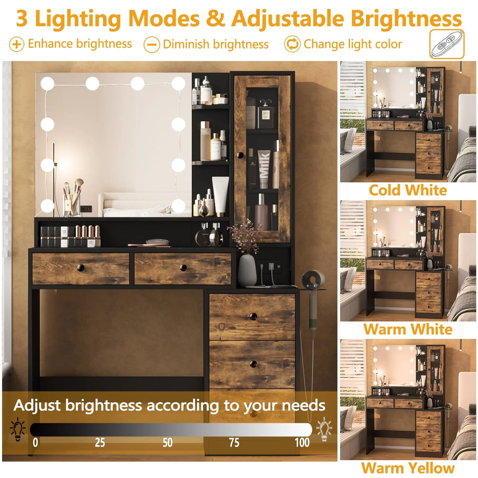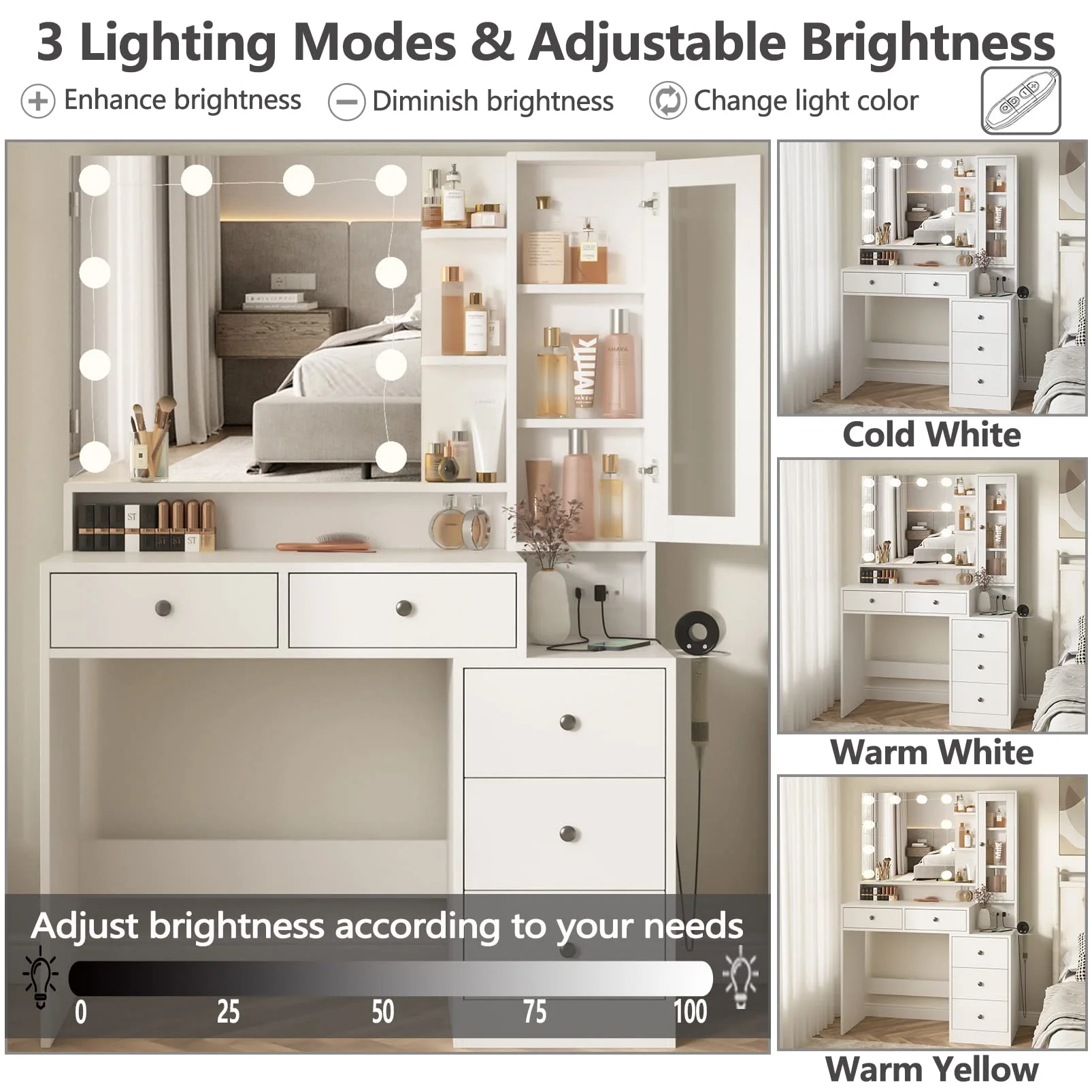 - 10 Led Lights 3 Lighting Modes Adjustable Brightness|2 Power Outlets and 2 USB Ports|5 Large Drawers for Storage|1 Cabinet with Glass Door|Open shelves|Built-in Hair Dryer Rack|Beautiful Modern Style