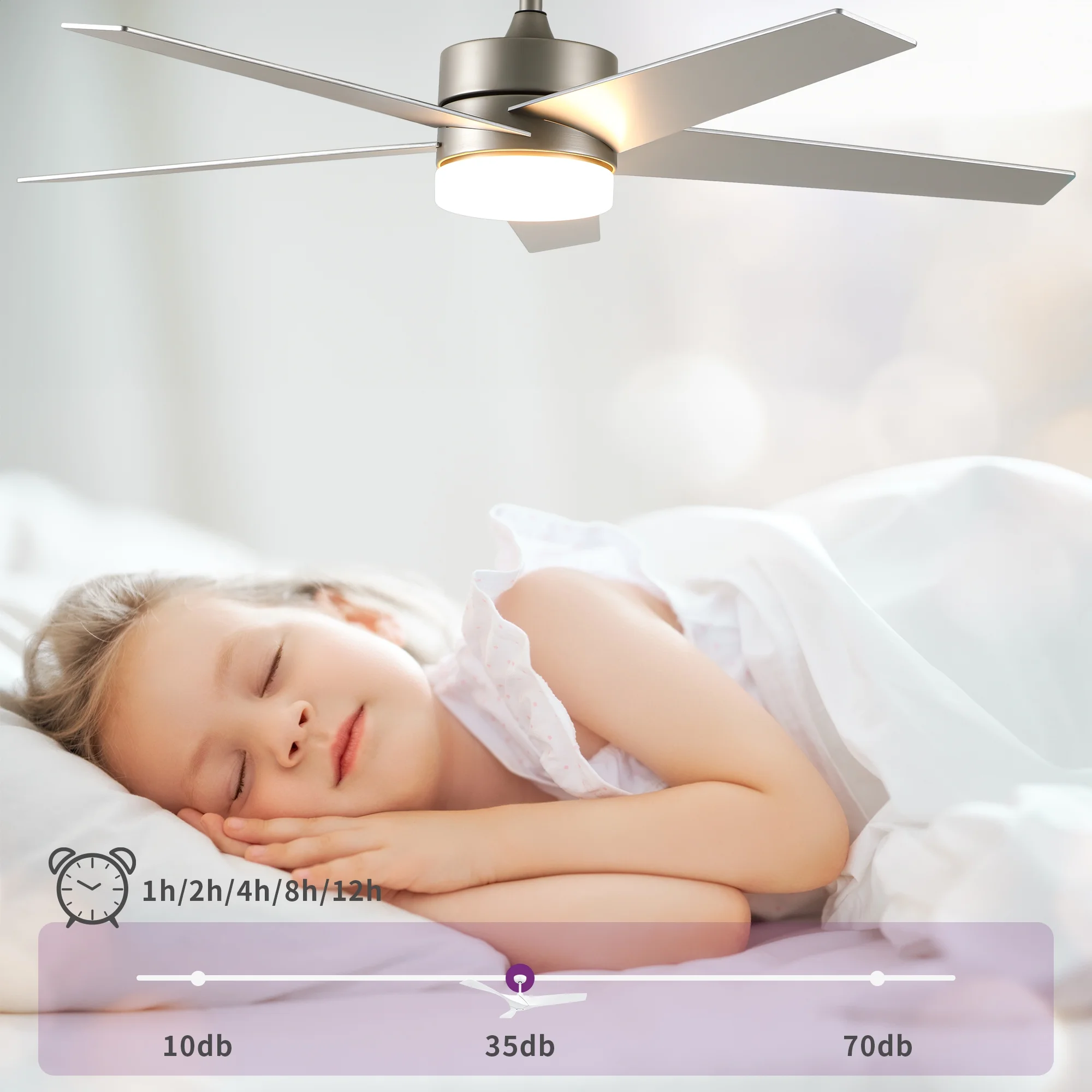 - Stylish Ceiling Fan with Light: Enhance your decor with this stylish and versatile ceiling fan. Featuring a chic contemporary design and five-blade construction, it effortlessly complements any interior. With its powerful 35W DC motor, it provides the perfect lighting ambiance for any occasion, offering warm, cool, or focused illumination options.
