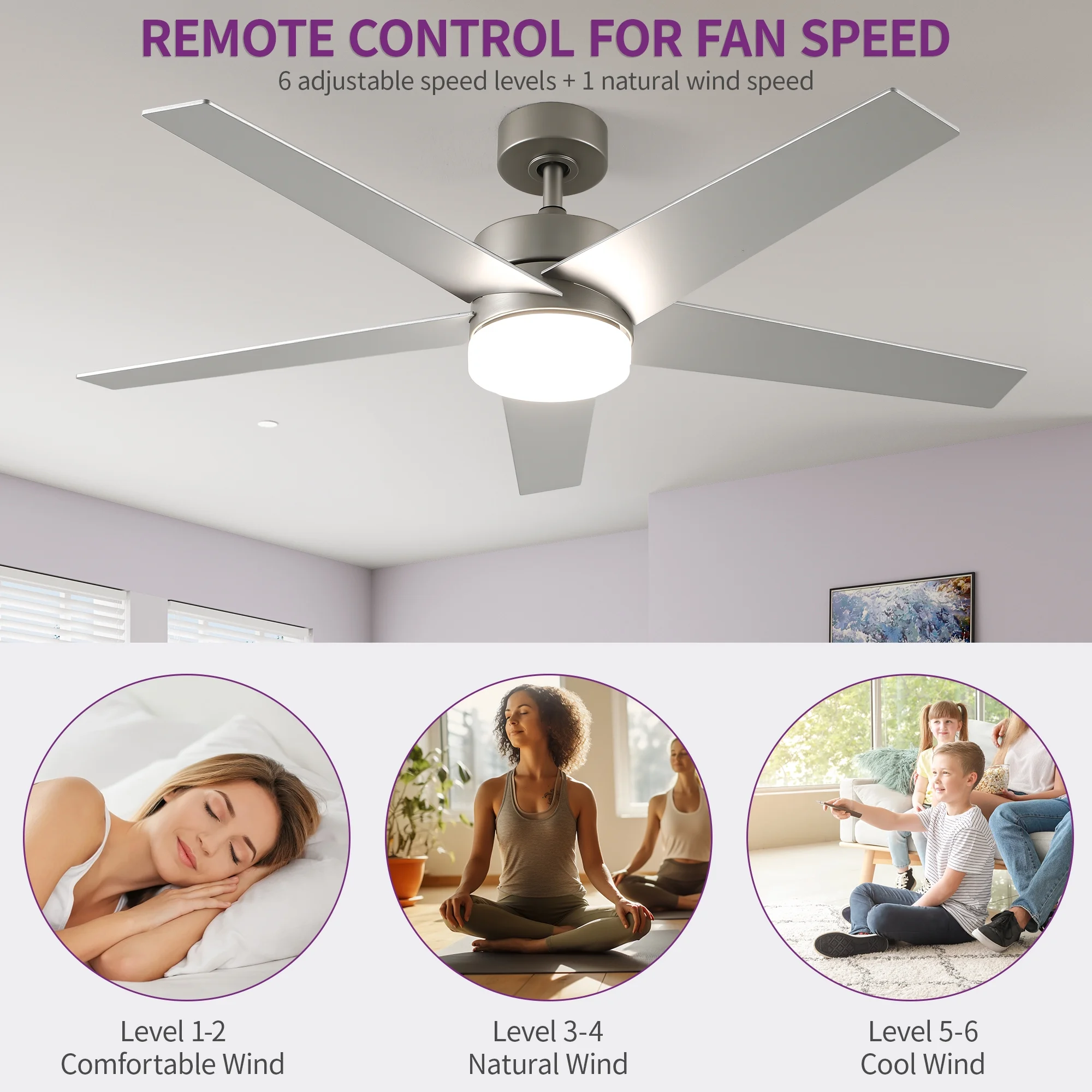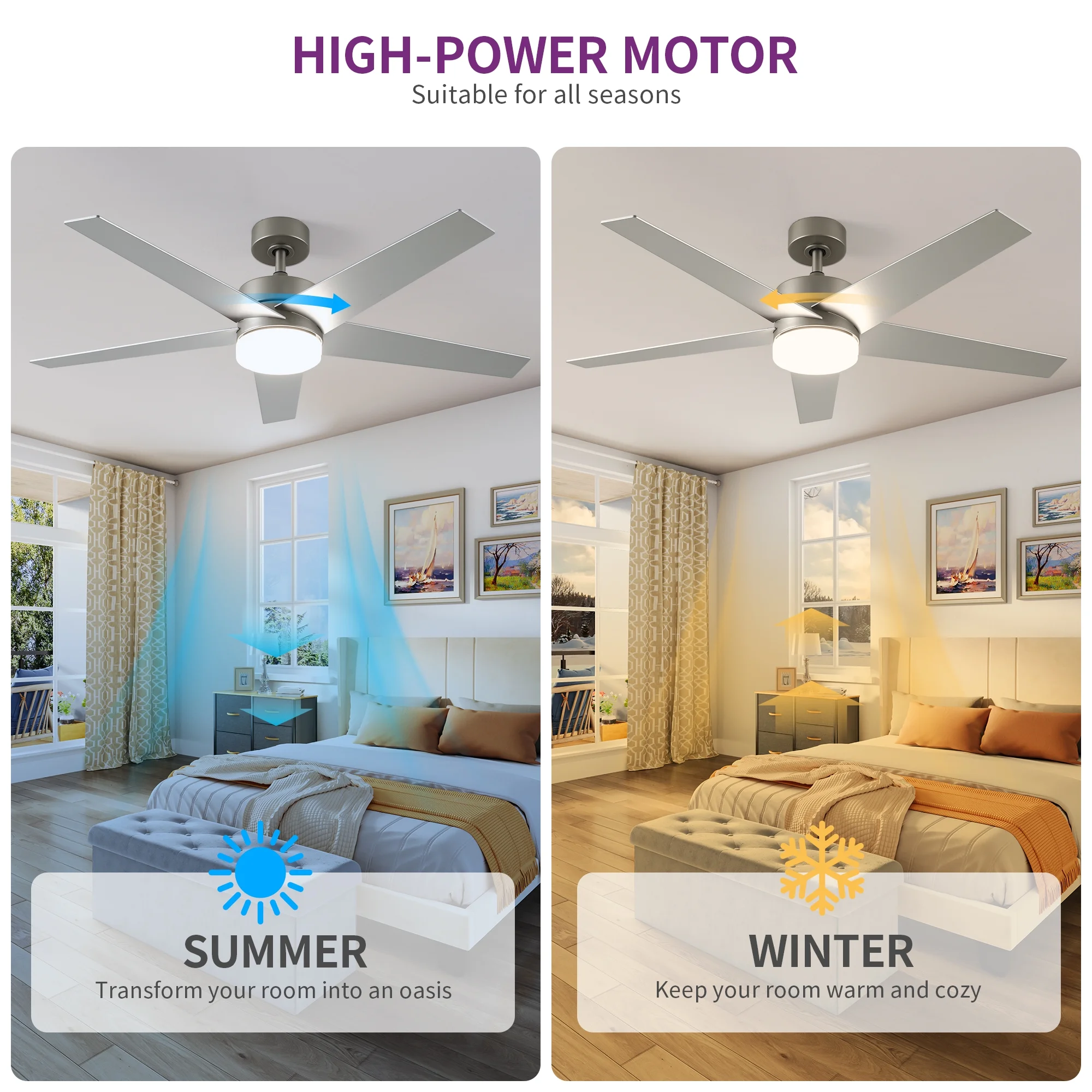 - Customizable Comfort: Enjoy paramount comfort with six adjustable fan speeds and a reversible motor for optimal airflow control. During hot summer days, select clockwise rotation for a refreshing breeze, while in winter, choose counterclockwise rotation for gentle warmth distribution.