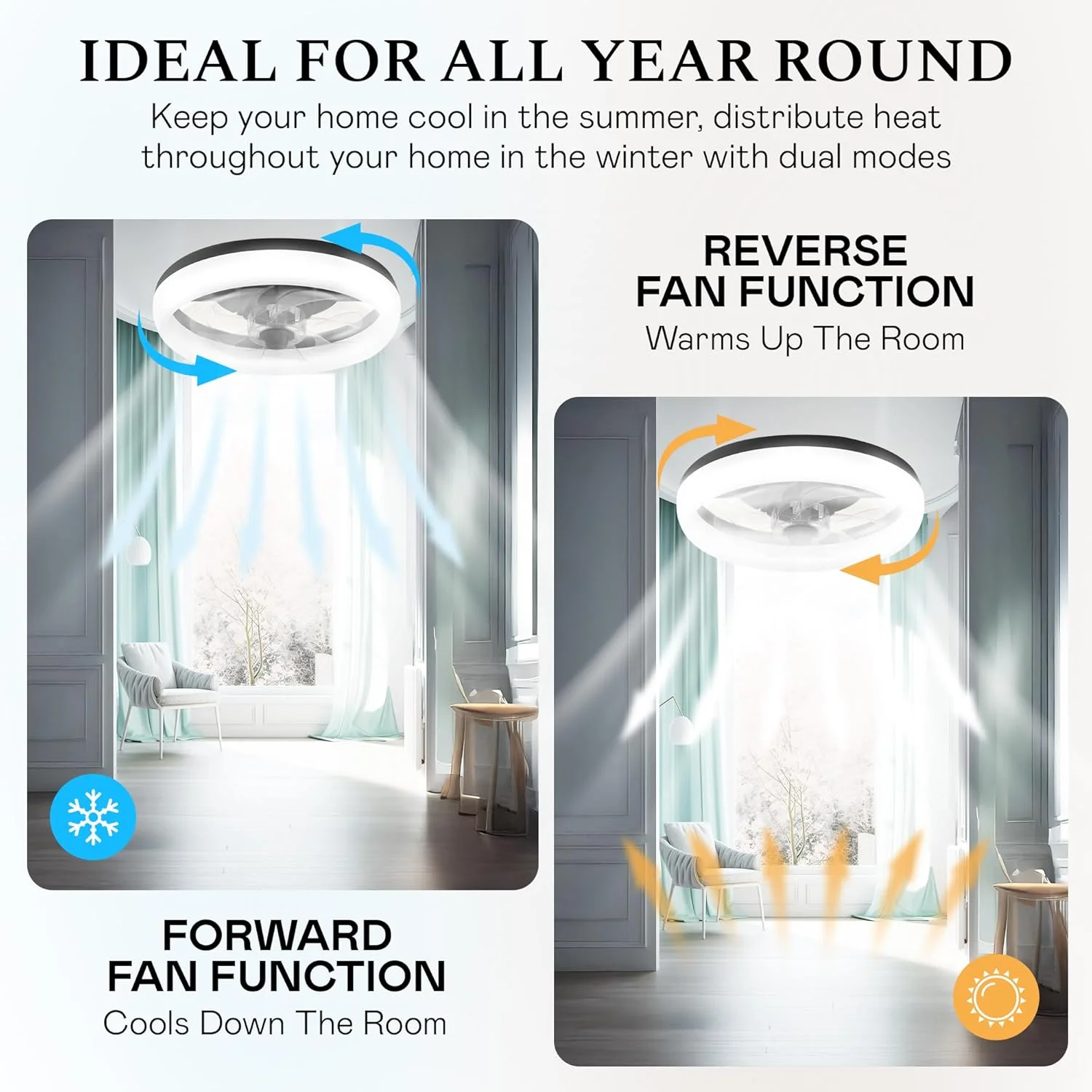 - Blade Reversibility for Summer & Winter Use: This low-profile ceiling fan with lights features blade reversibility, allowing you to switch between cooling airflow during summer and warming air circulation in winter, keeping your space comfortable year-round.