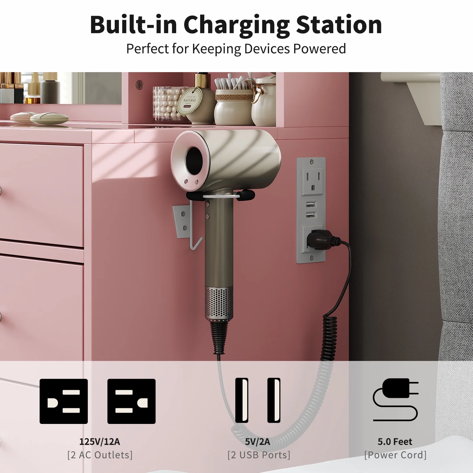 - Vanity Table with Charging Station: This Vanity comes with a hair dryer stand and charging station, including 2 standard plug sockets and 2 USB ports to connect your hair dryer, curling iron, computer, Ipad, mobile phone, allowing you to take beautiful selfies after applying makeup