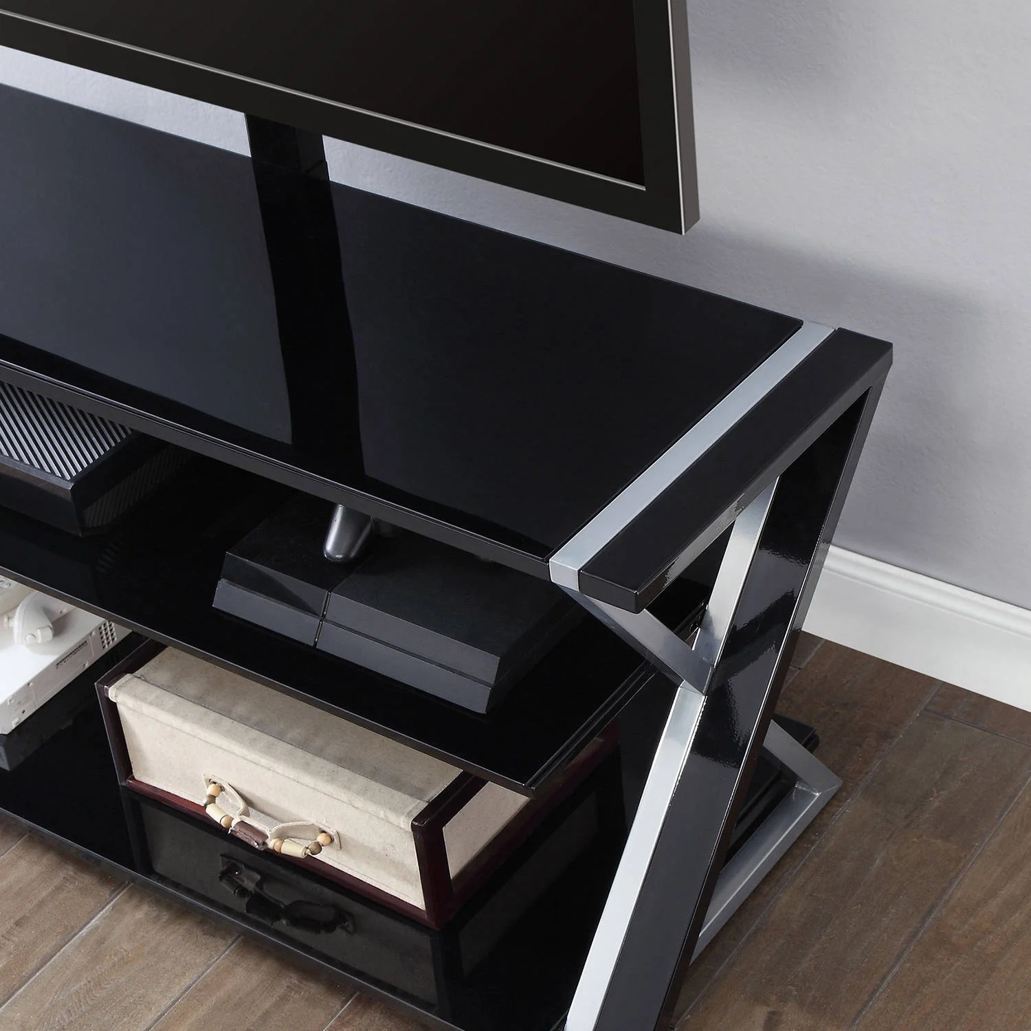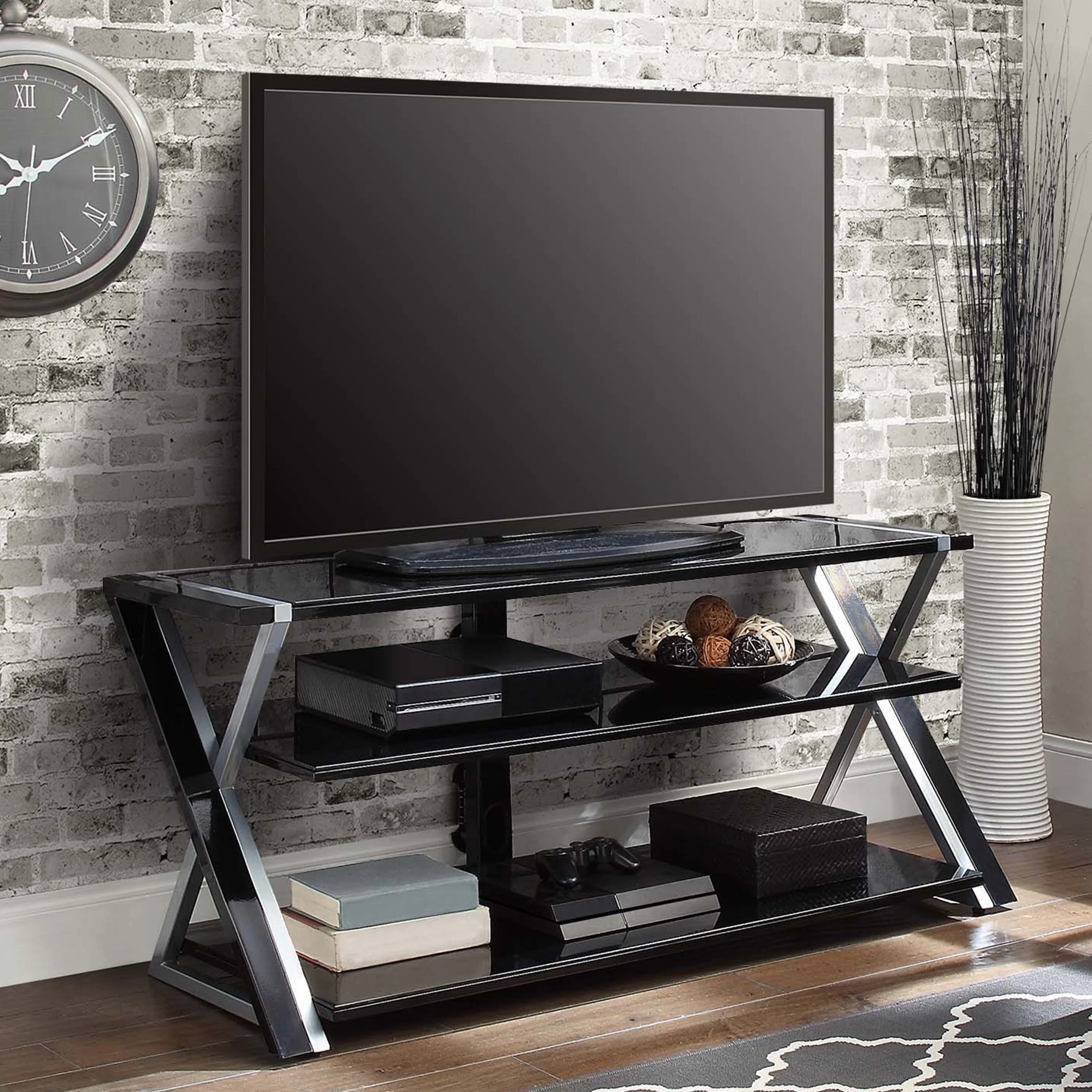 - Sleek console has clean lines with black and silver legs and black tempered glass shelves, that add a modern touch to any room