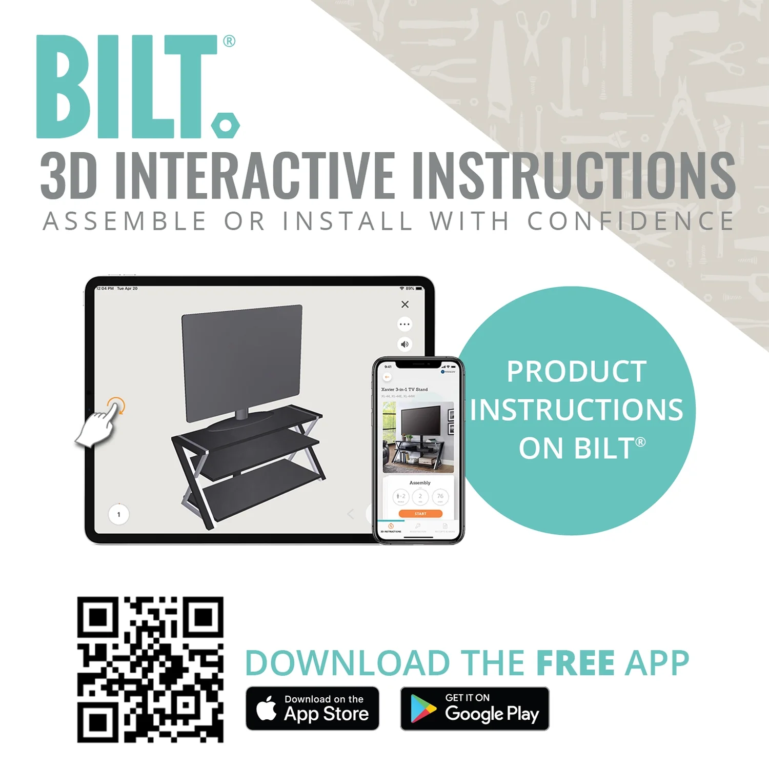 - 3D interactive assembly guide available through free BILT app (Download from the app store or Google Play)
