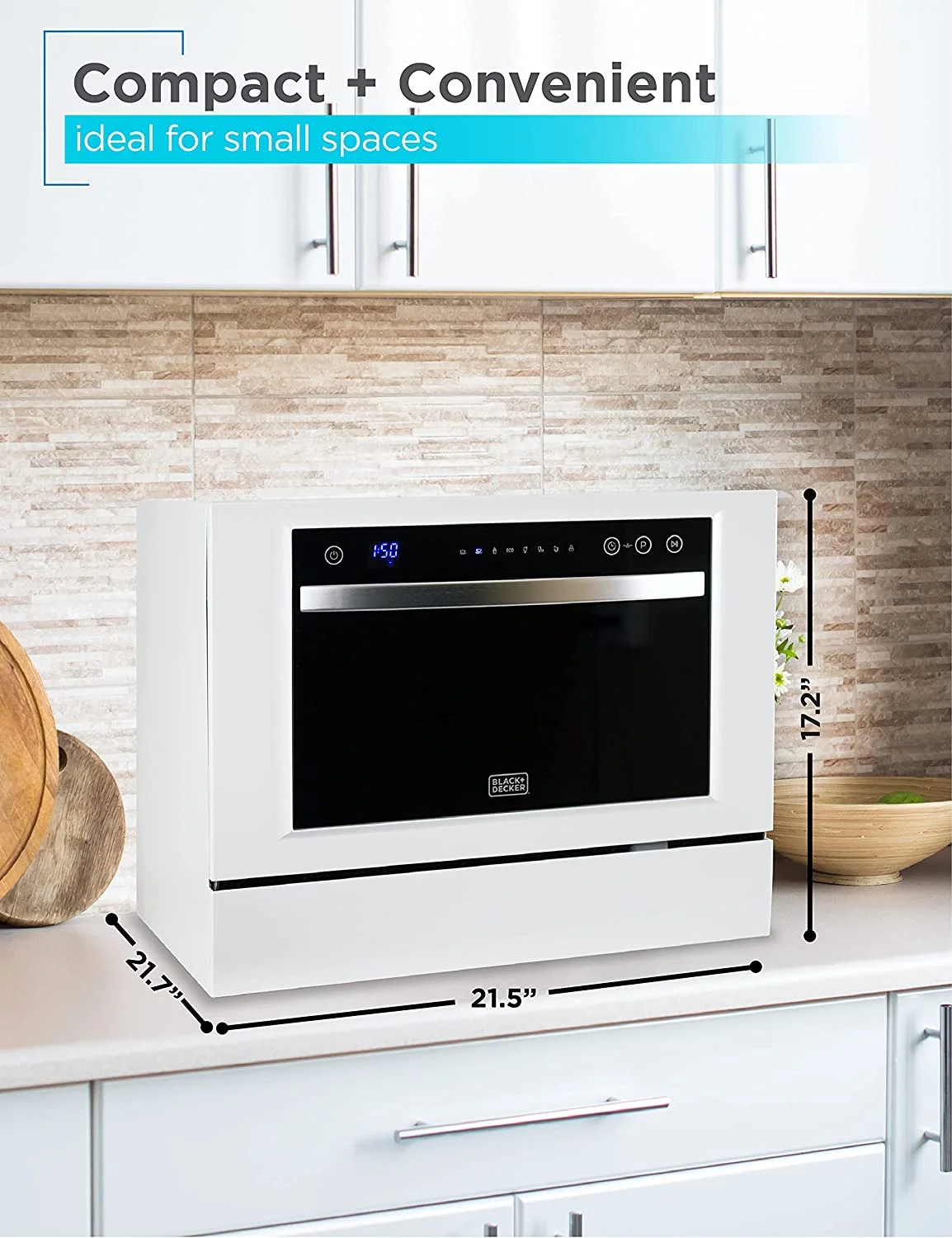 - 7 SUPERIOR WASH CYCLES: With this incredible BLACK?Ӕ portable dishwasher, you find the right wash cycle that works for you and your dishes. Our 7 wash cycles for this 21.5a?? x 21.7a?? x 17.2a?? dishwasher machine include: Normal, Intensive, Eco, Glass, 90 Minutes, Rapid & Soak. Save water and time in the kitchen cleaning by letting this stainless steel dishwasher do all the hard work.