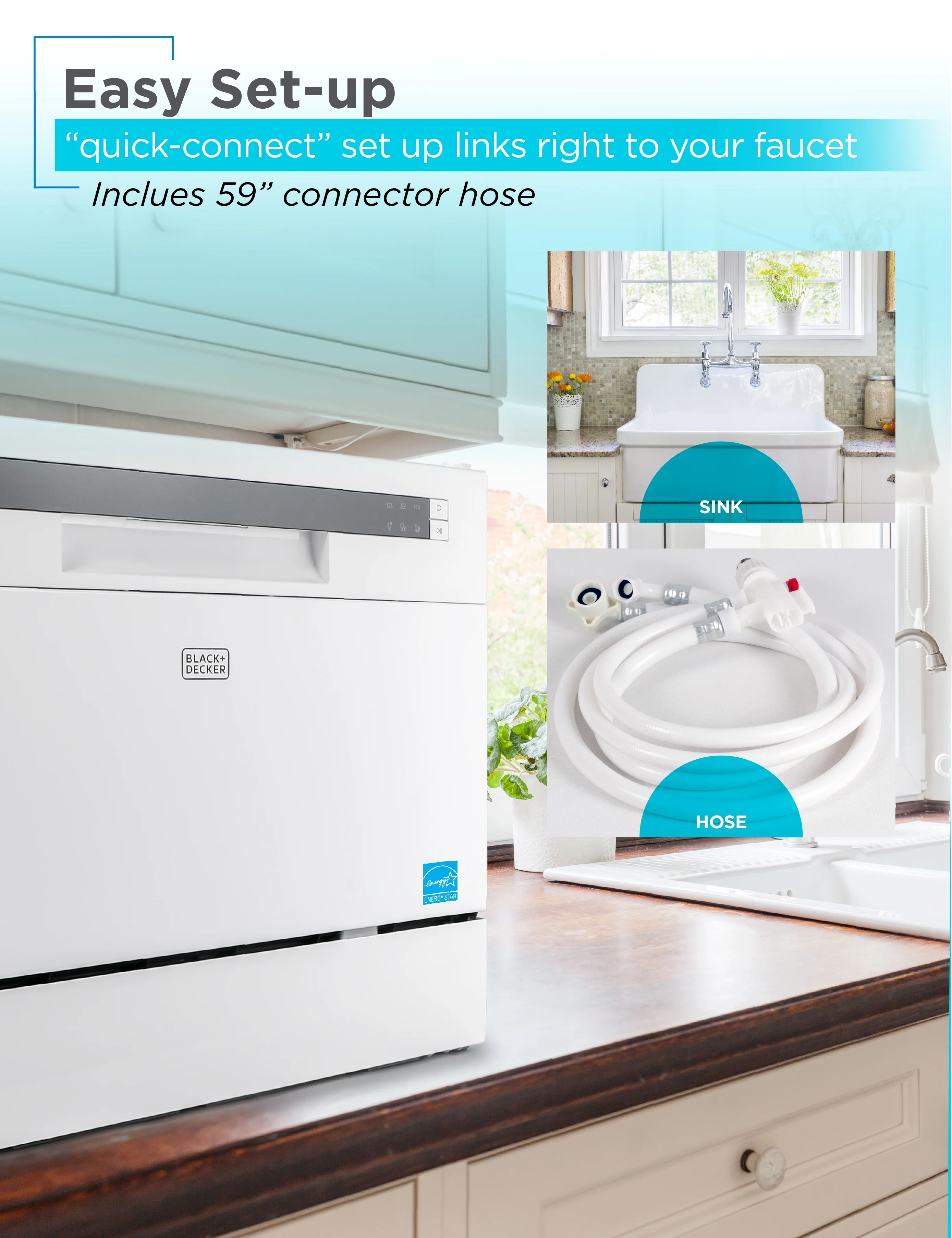 - QUICK CONNECT: Hook up your must-have white dishwasher with a seamless Quick Connect assembly, hooking right up to the faucet. No need for direct plumbing or permanent installation. With this portable dishwasher, you conveniently connect when you need clean dishes and disconnect when not in use.