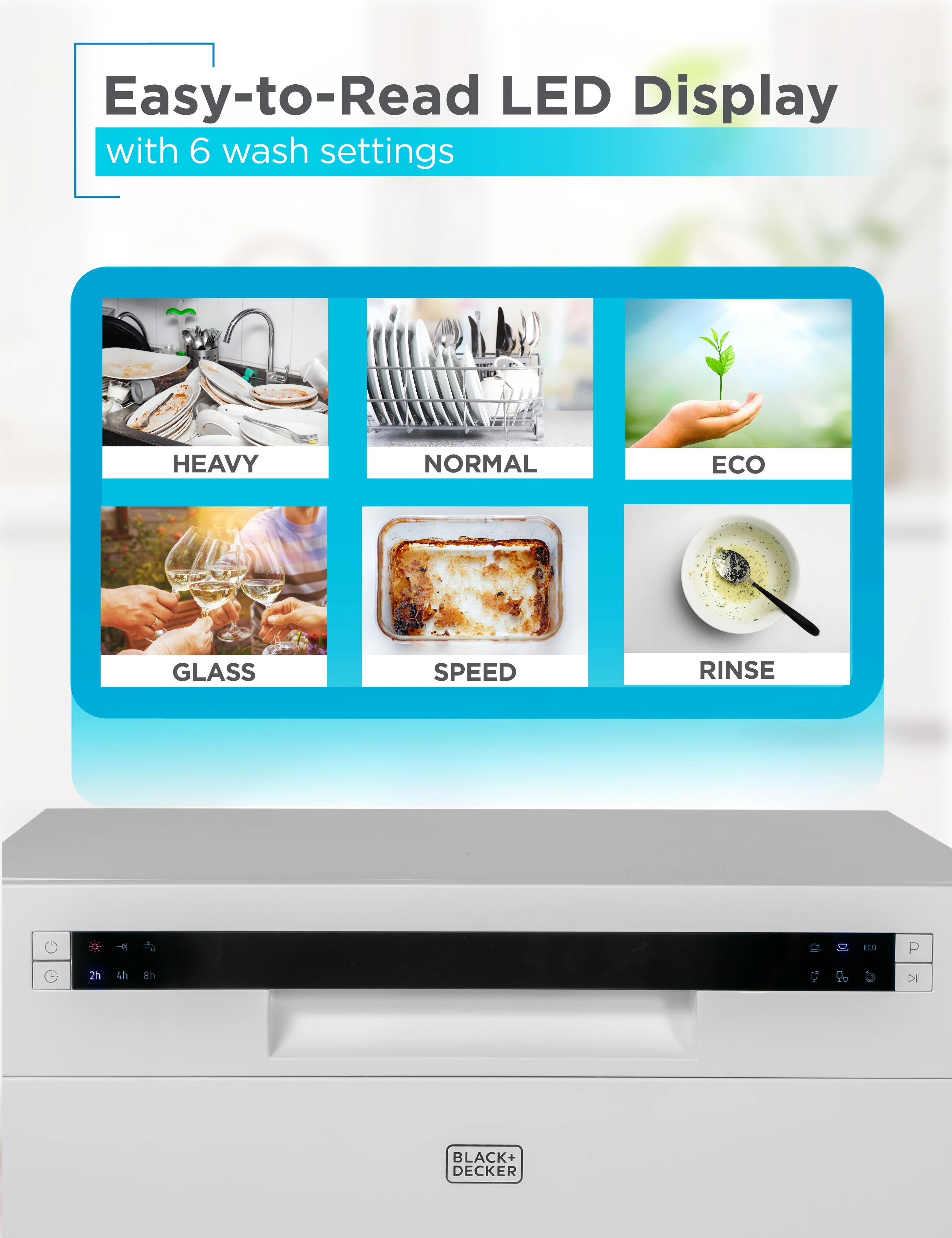 - LED DISPLAY: Set your wash cycle and time with ease thanks to this intuitive dish washer LED display. Thanks to its easy-to-navigate electronic touch controls, you can see remaining cycle time and even delay start time. Child lock included with portable dish washing machine to secure maximum safety.