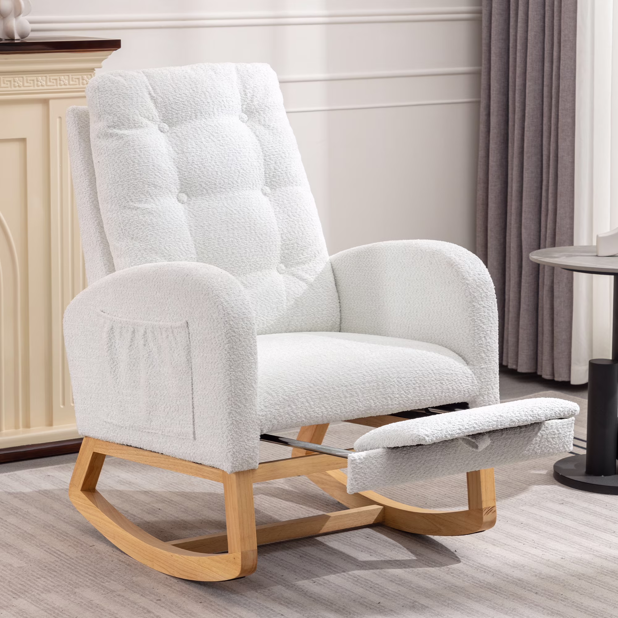 - Upholstered Rocking Chair Comfortable Living Room Rocker Lounge Armchair with Solid Wood Base High-Back Porch Rocker Nursery Rocker w/Side Storage Pocket