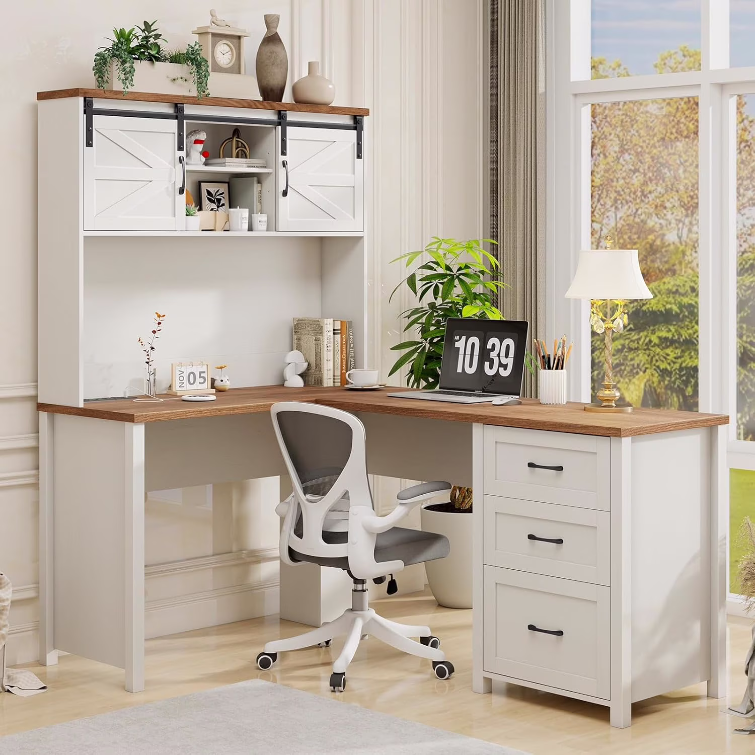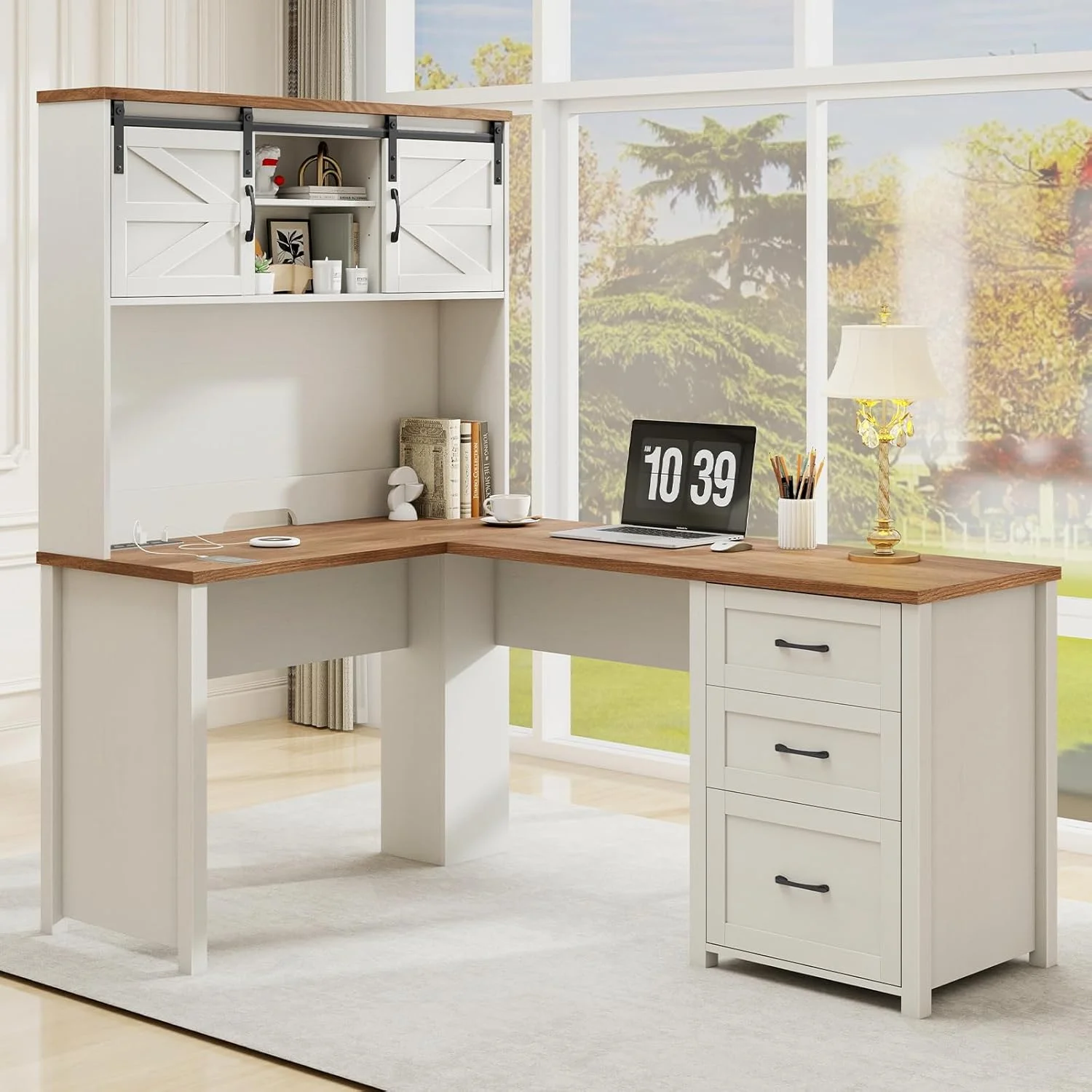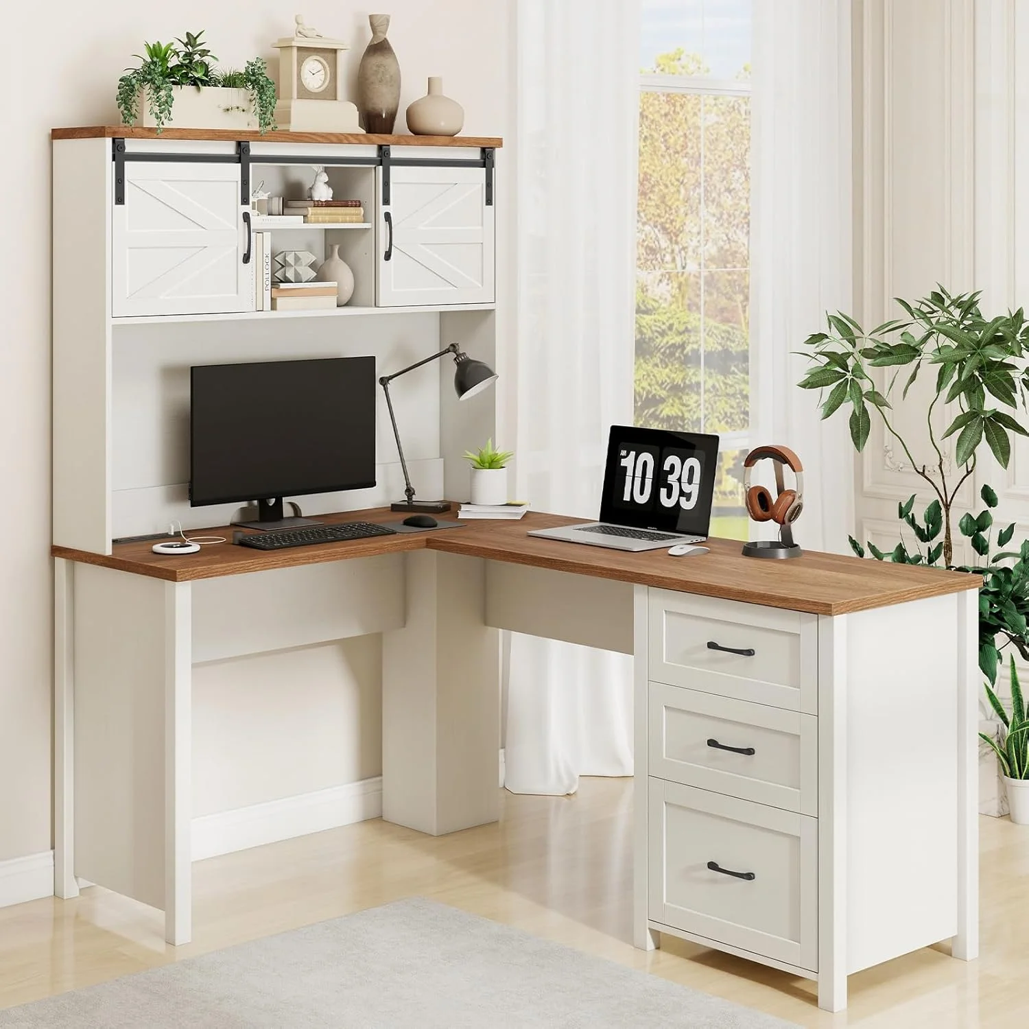 The desk includes ample storage options with built-in filing drawers, perfect for organizing important documents and office supplies. The drawers provide a discreet storage solution that keeps your workspace tidy and organized. - e??3e??????Two-Tier Adjustable Shelving with Sliding Barn Door???