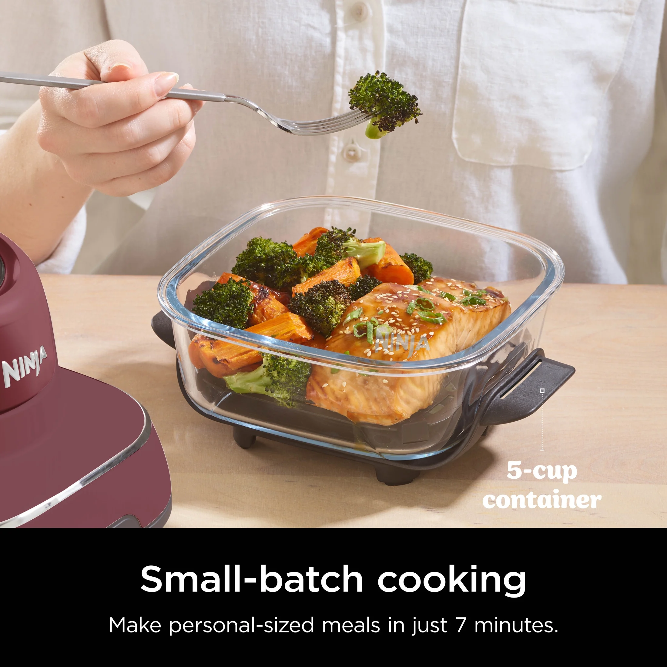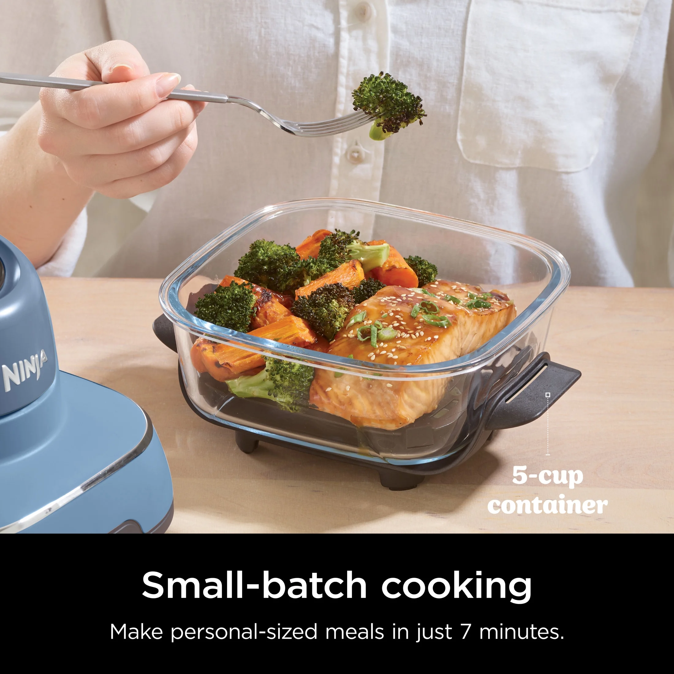 - SMALL & LARGE BATCH CONTAINERS: 5 cup container cooks a personal sized meal in 7 mins while the 4 QT fits a 4-LB chicken and veggies
