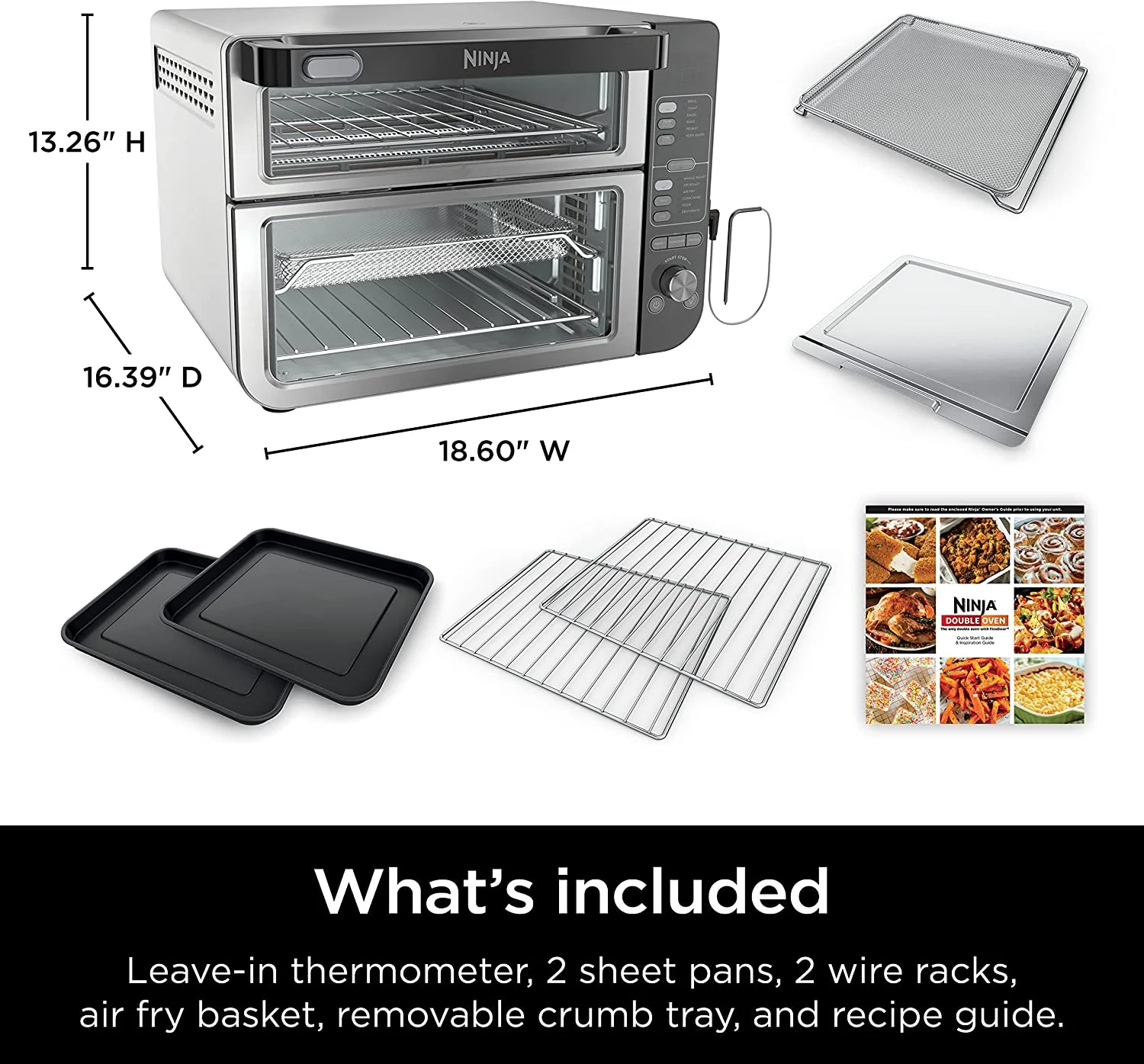 Ninja Digital DCT451 12-in-1 Smart Double Oven with FlexDoor DCT401 - Stainless Steel/Black BRAND NEWFLEXDOOR: Creates two separate ovens. Access just the top for quick meals and snacks, or open the full door so you can cook 2 meals, 2 ways on the top and bottom.,FLAVORSEAL TECHNOLOGY: Two separate ovens prevents smells from crossing between ovens, so your flavors stay separate.,SMART FINISH TECHNOLOGY: Sync both independent ovens to cook 2 meals, 2 different ways that finish at the same time.,SMART COOK SYSTEM: Leave-in thermometer precisely monitors temperatures, so you don t have to.,FASTER MEAL-MAKING: Spend less time cooking and more time with family. Eliminate back-to-back cooking for 65% faster meal-making than your traditional oven.,12 COOKING FUNCTIONS: Bake, broil, reheat, keep warm, bagel, and toast in the Top Rapid Oven. Air fry, convection bake, pizza, air roast, whole roast, and dehydrate in the Bottom Convection & Air Fry Oven.,FAMILY SIZED CAPACITY: Ninja s Double Oven fits 6 lbs of wings and a 12 in pizza at the same time to feed up to 8 people.,EASY FAMILY DINNERS: Two independent ovens let you cook a meal for the kids and a separate meal for the parents at the same time.,WHAT'S INCLUDED: Countertop oven, 2 sheet pans, 2 wire racks, air fry basket, removable crumb tray, and chef-created recipe book with 15 recipes and cooking charts.