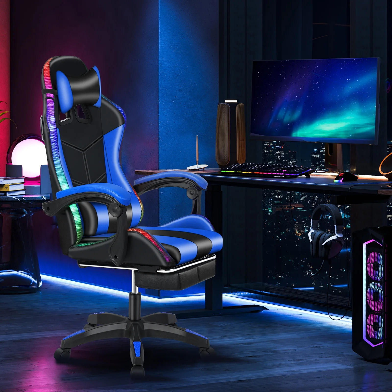 - RGB LED Lights: LED flashing lights on the back and the edge of the seat, you can easily adjust multiple light modes and brightness by remote control, to help level up your gaming setup.