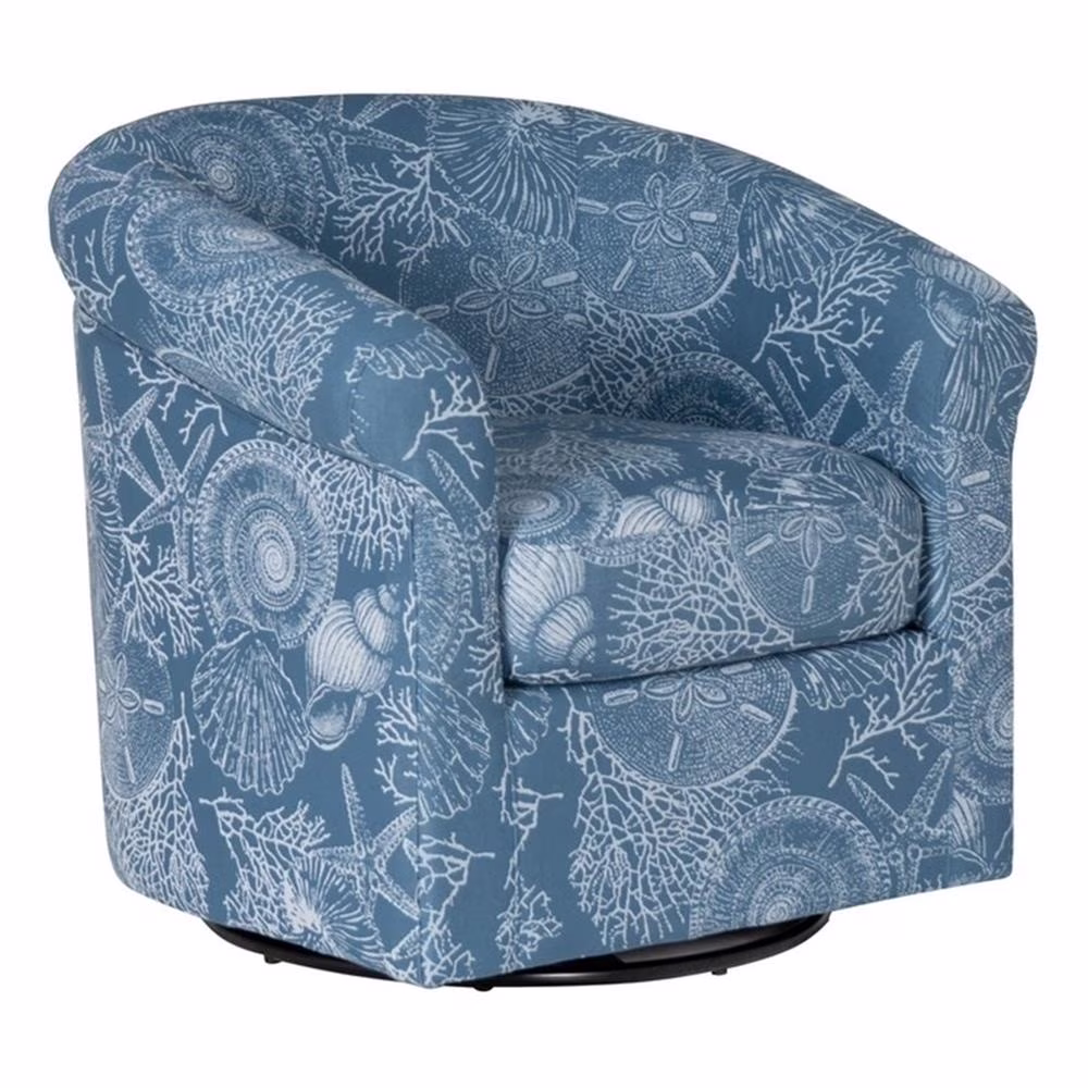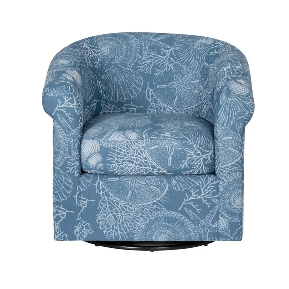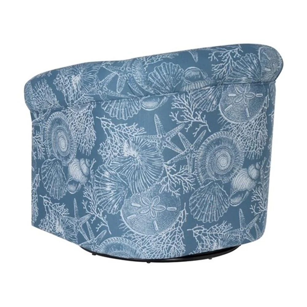 This denim swivel club chair is a stunning combination of modern design, luxurious comfort, and functional elegance. Upholstered in a rich baltic blue denim, a unique pattern including seashells, coral and sand dollars give it a striking nautical theme. A rotating base turns smoothly over a 360 degree range for maximum convenience. Its plush seat cushion and supportive backrest ensures lasting comfort, making it ideal for living rooms, home offices, and cozy reading corners. The contemporary design and soft curves enhance the aesthetic of a variety of interior styles, from coastal to mid-century modern. This chair is crafted with high-quality materials and attention to detail, ensuring durability and style for years to come. Whether you're looking for a statement piece or a comfortable chair for everyday use, this chair delivers both function and beauty.