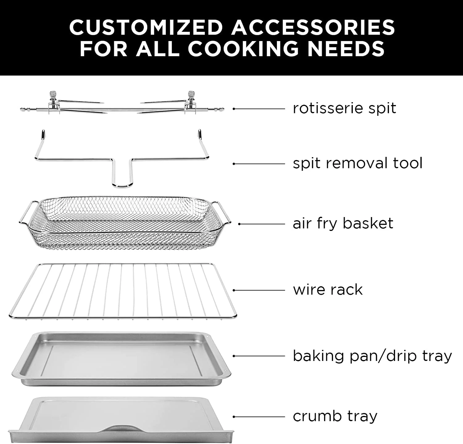 - COOK FOR A CROWD: Your search for the perfect family-size air fryer has come to an end. Let this oven be your go-to gadget for your partner’s, kids�? or roommates�?favorite grub. Prep a 12-inch supreme pizza or toast up to 6 slices of your favorite breakfast bread all at once. It gets even better—simply wipe down the oven with a damp cloth and load the wire rack, basket, and rotisserie spit in the dishwasher for cleanup in a breeze.