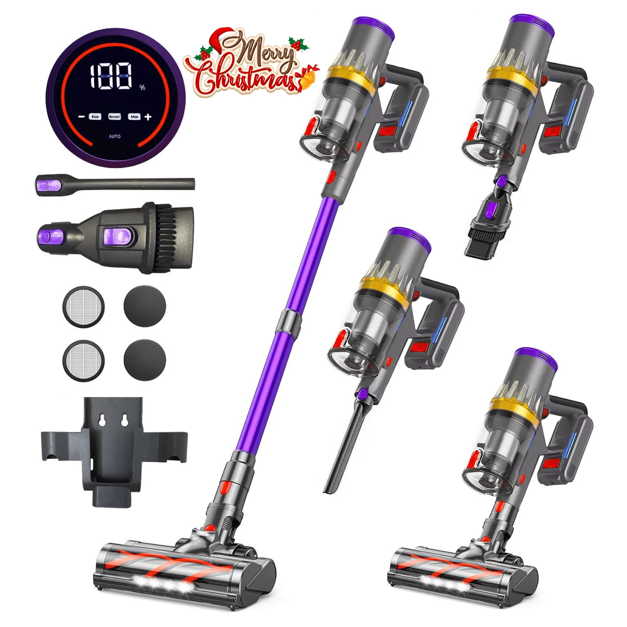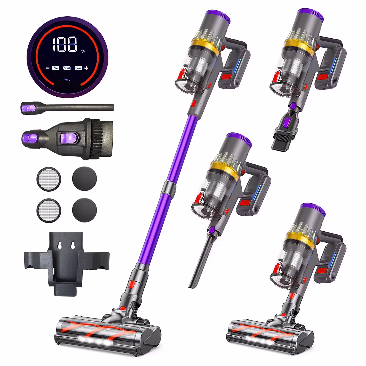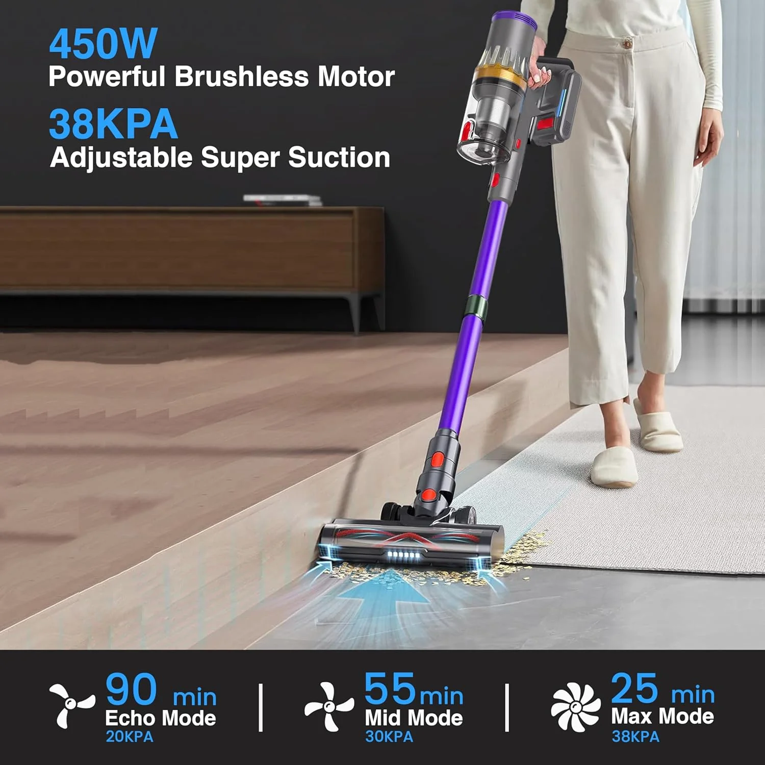 - 38KPa POWERFUL SUCTION & 450W LATEST MOTOR: Our Cordless vaccum cleaner features a powerful 450W brushless motor, delivering 38KPa suction to effortlessly pick up large debris, dust, pet hair and deep-seated dirt. With its four suction modes (Auto Mode-Eco Mode-Mid Mode-Max Mode) with a long runtime, our handheld vacuum cleaner meets all cleaning needs. Compared to traditional motors, it has lower noise level (�?5 db) and a longer lifespan.