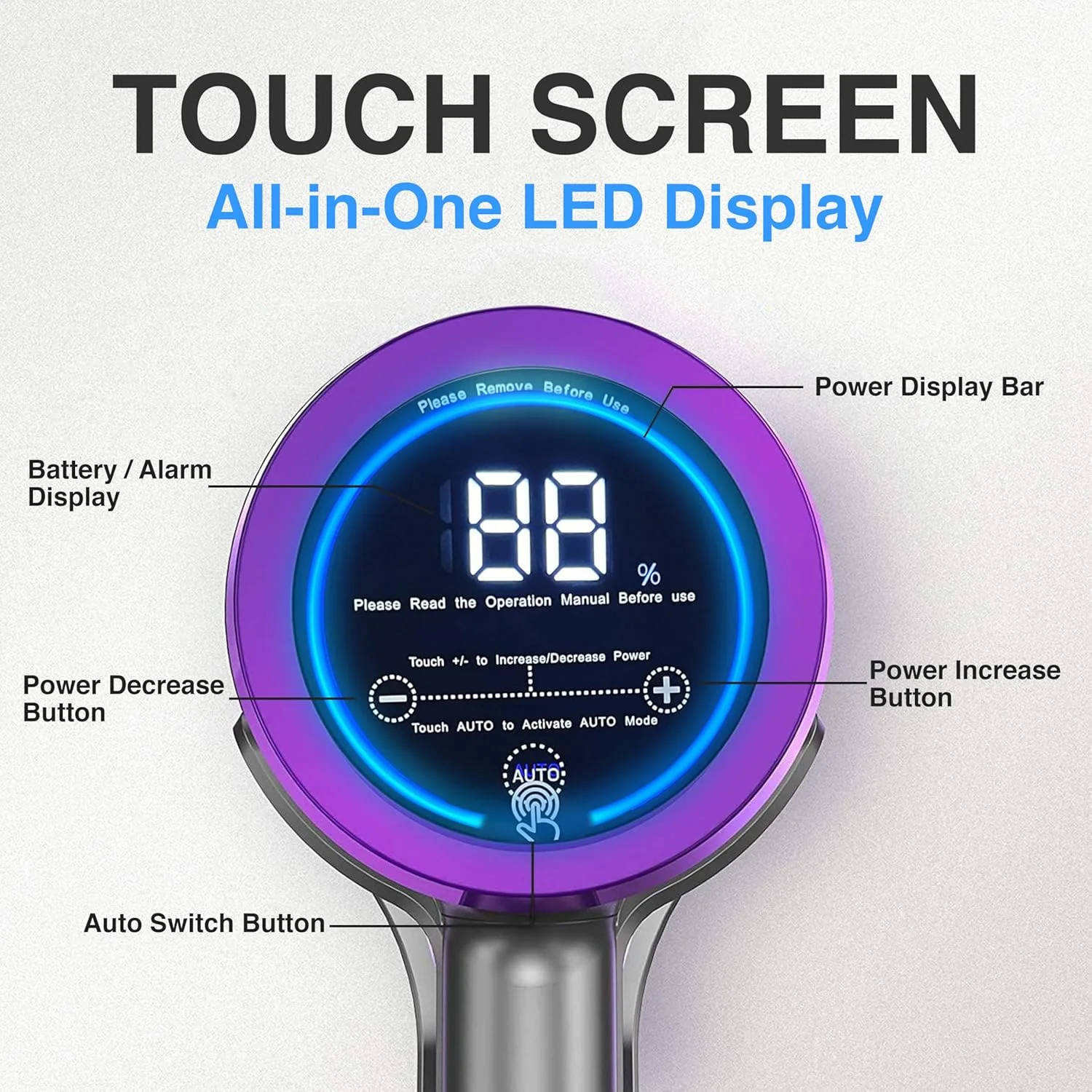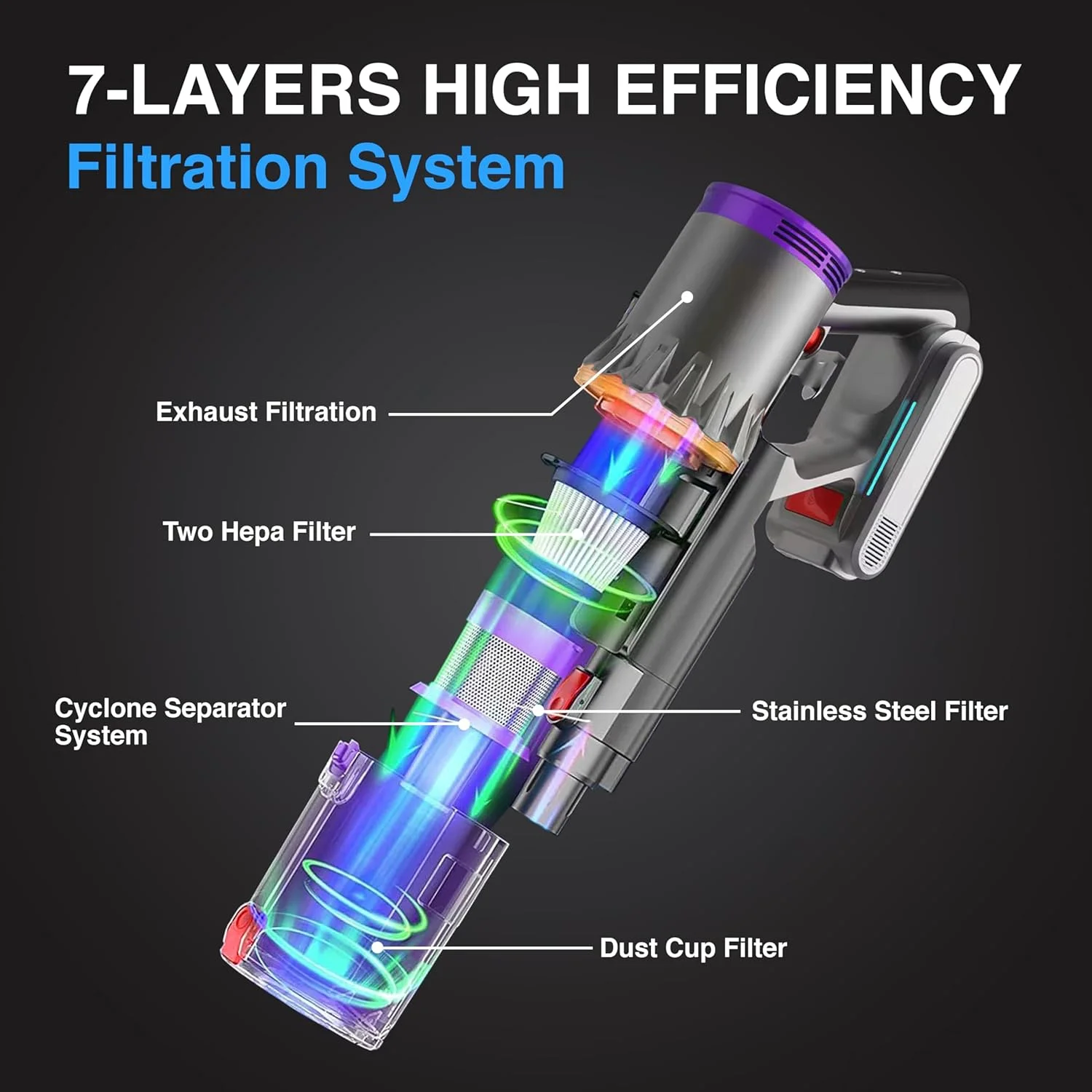 - 7-LAYER PREMIUM HEPA FILTRATION SYSTEM WITH LED TOUCHSCREEN: This hand held vacuum cordless features a 7-layer premium HEPA filtration system, capturing 99.99% of fine dust and bacteria for clean air release. An extra HEPA filter enhances performance. The 1.5L dust cup allows for longer cleaning with easy, single-click emptying. The large touch screen LED control panel displays battery level, suction performance, and alerts, offering convenient operation.