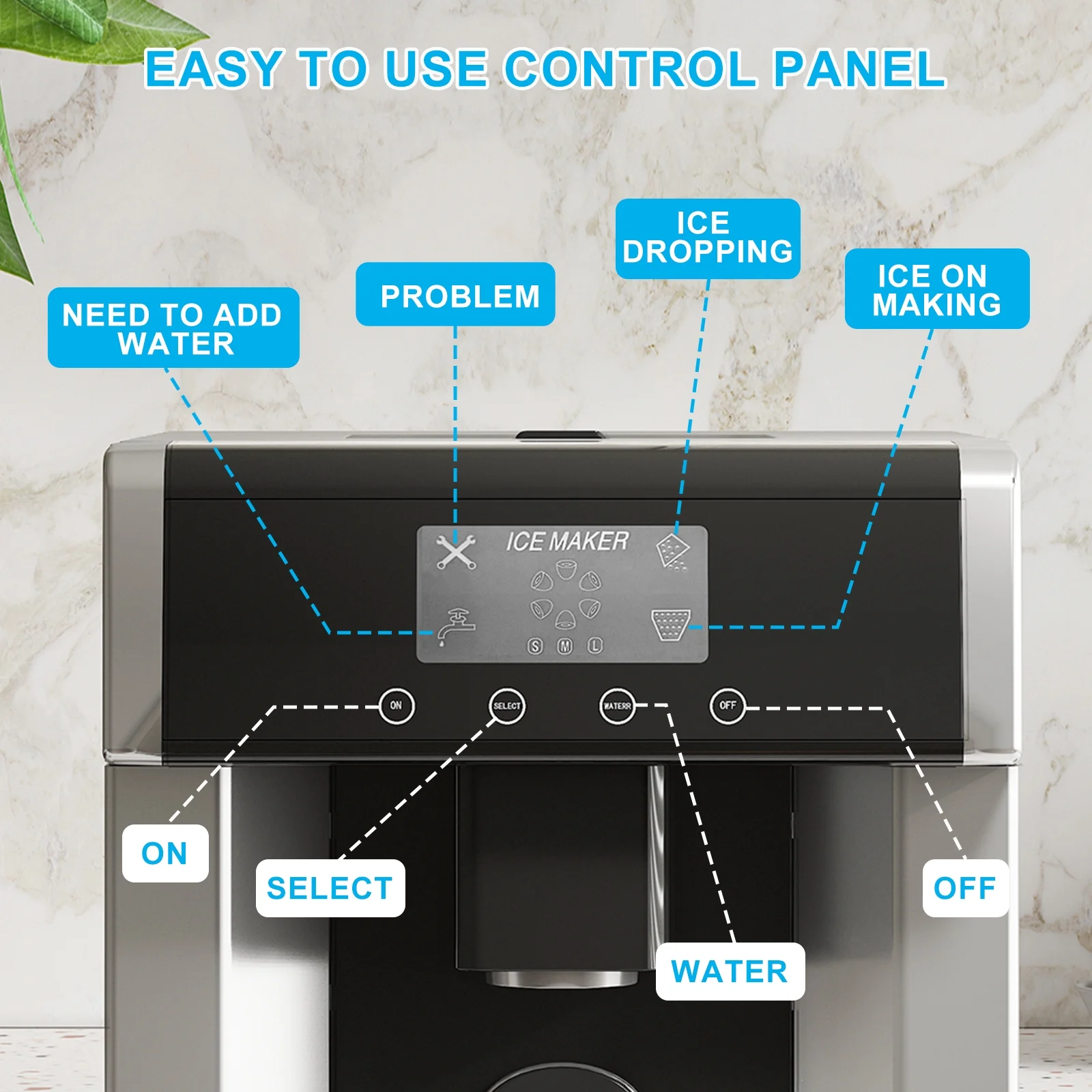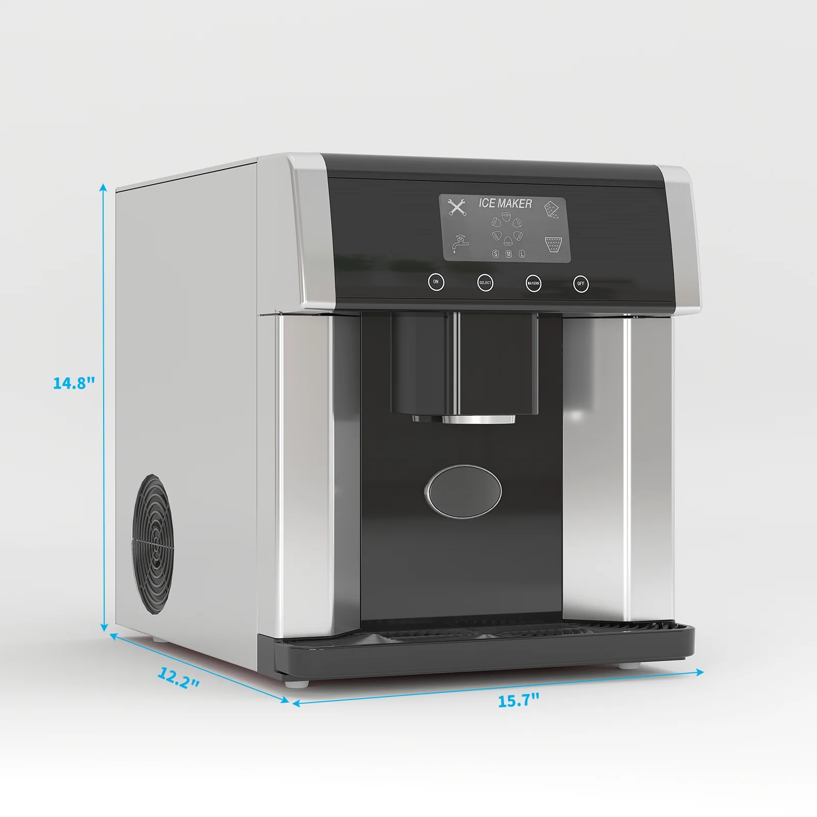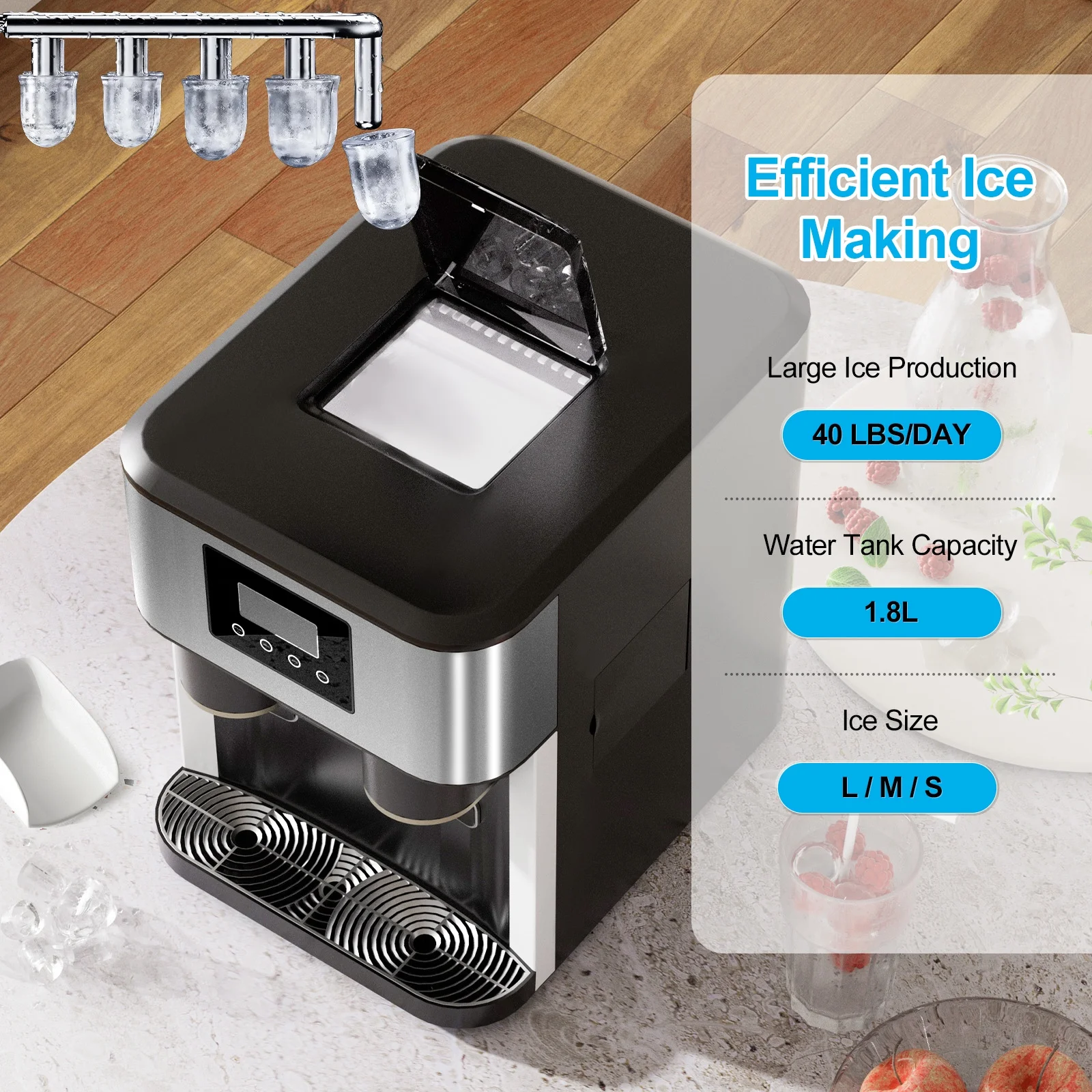 �?0 lbs Daily Ice Output & 3 Cube Sizes】This countertop ice maker with water dispenser can make up to 40 pounds of ice per day, and it can produce fresh ice every 8-15 minutes. You can choose from crushed ice or large, medium, or small ice cubes depending on your needs.