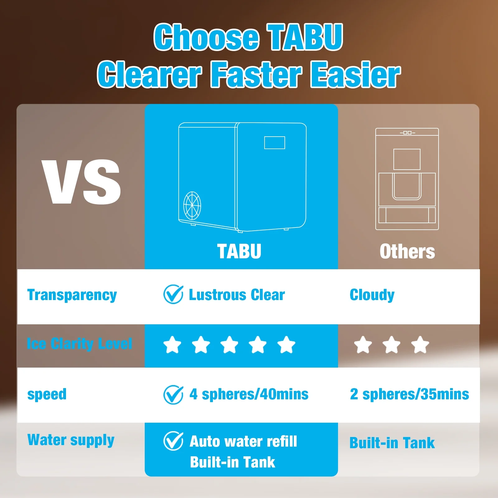 【Low Noise & Environmentally Friendly】TABU 3 in 1 ice maker and water dispenser is energy saving and environmentally friendly, the noise during operation is very low. Unlike traditional electronic refrigeration, our ice maker crushed ice utilizes a high-performance compressor to make ice with excellent efficiency and stability.