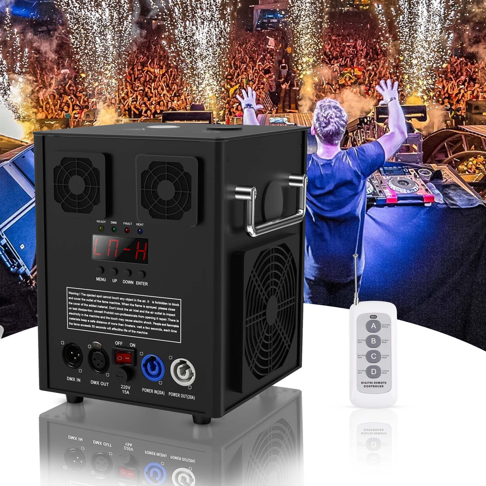 - This fireworks machine supports max. 16 fts height spark, 3-level height adjustable. Spark direction: up; you can control the various effects within 66 ft with the controller.