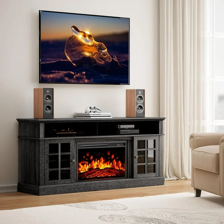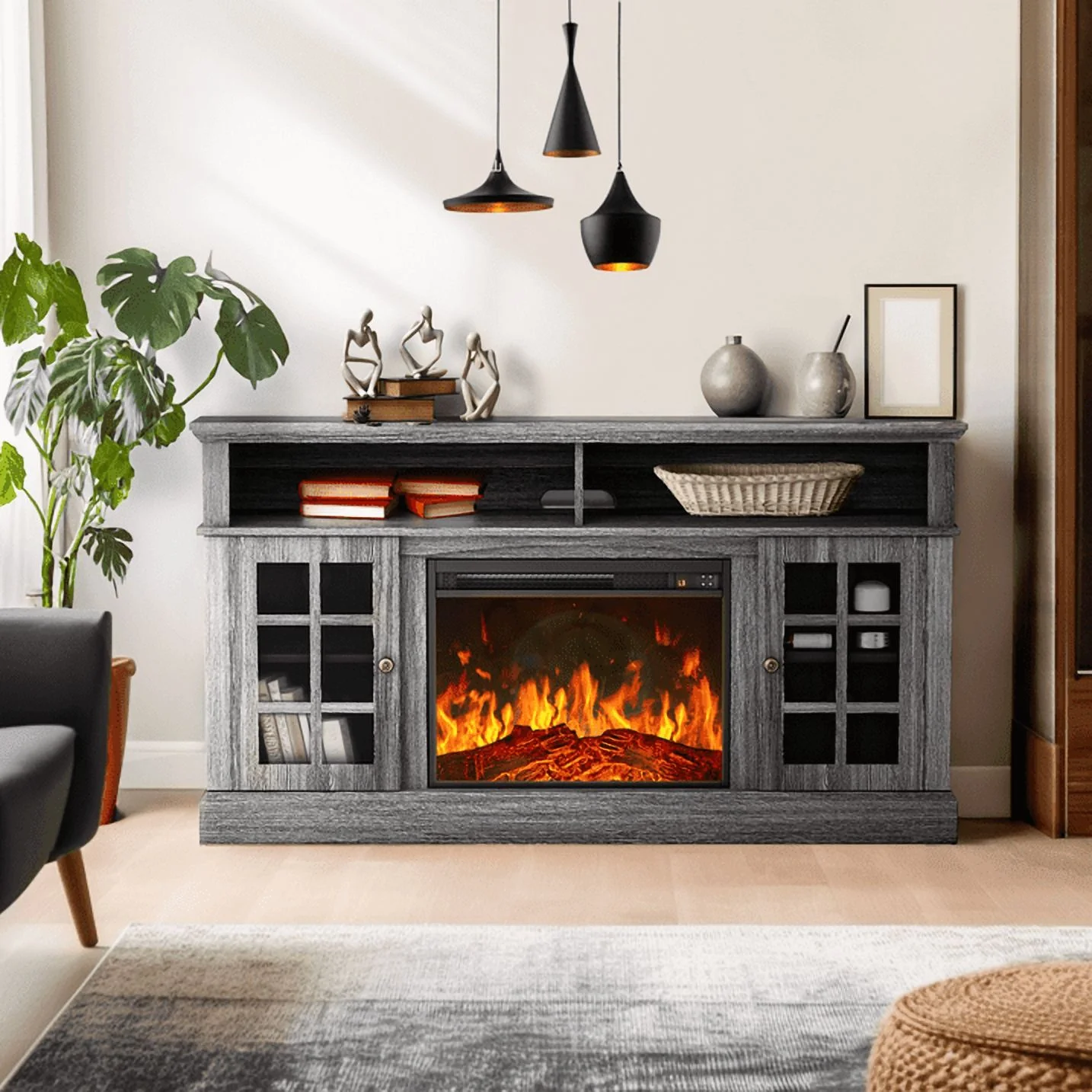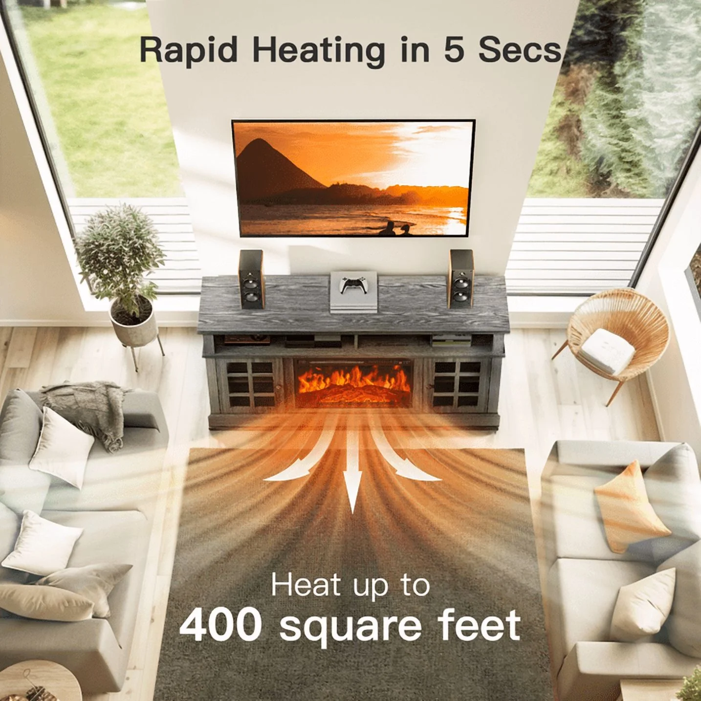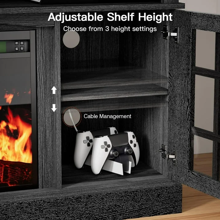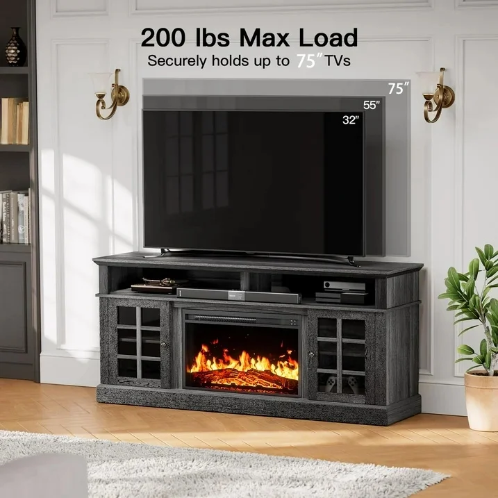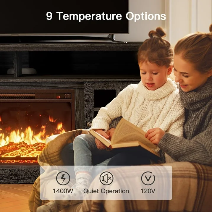 This TV stand for up to 75 inch TVs and up to 200lbs with a fire pit is perfect for your living room or bedroom by adding storage space and heat. The 23�?electric fireplace insert can heat a room up to 400 sq.ft. and plugs into a standard 120V outlet.and with 9 temperature options, 4 levels of flame brightness, and 1400W rapid heating system that can warm air in only 5 seconds. The electric fireplace insert features a realistic flame effect that can be used with or without heat to enjoy the ambiance even in the warm summer months. You'll appreciate the long-lasting durability of the piece, thanks to its high-quality manufactured wood construction and sturdy particleboard construction. This storage console features two adjustable shelves on both sides for anything from your electronics to your home decor. With a cord management port at the back of each shelving space, you'll never have to worry about a tangled mess of wires as it'll keep them organized. This entertainment center combines modern with farmhouse design and is sure to blend perfectly into your living room.