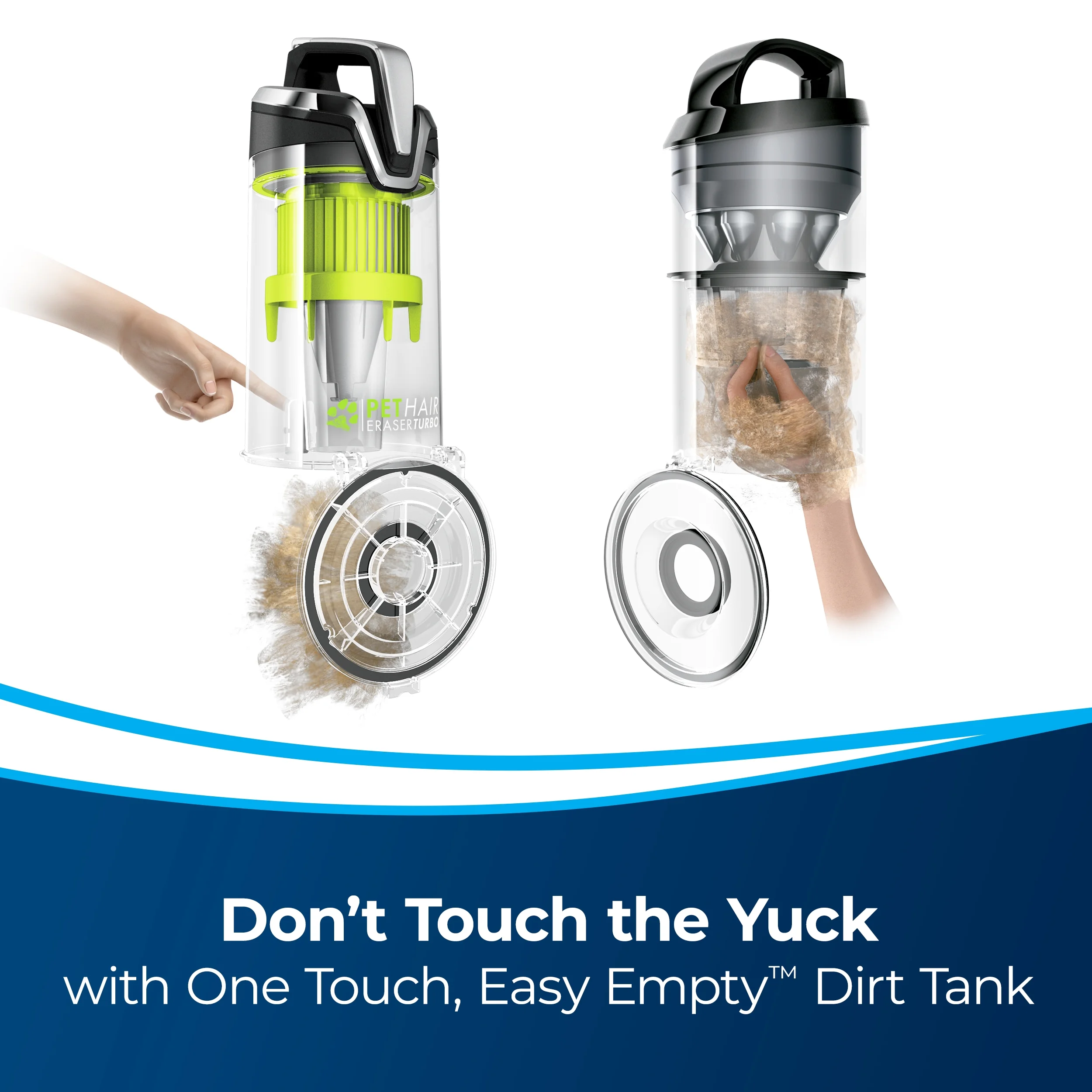- One-Touch, Easy Empty�?with Cyclonic Pet Hair Spooling System�?means you no longer have to touch the yuck.
