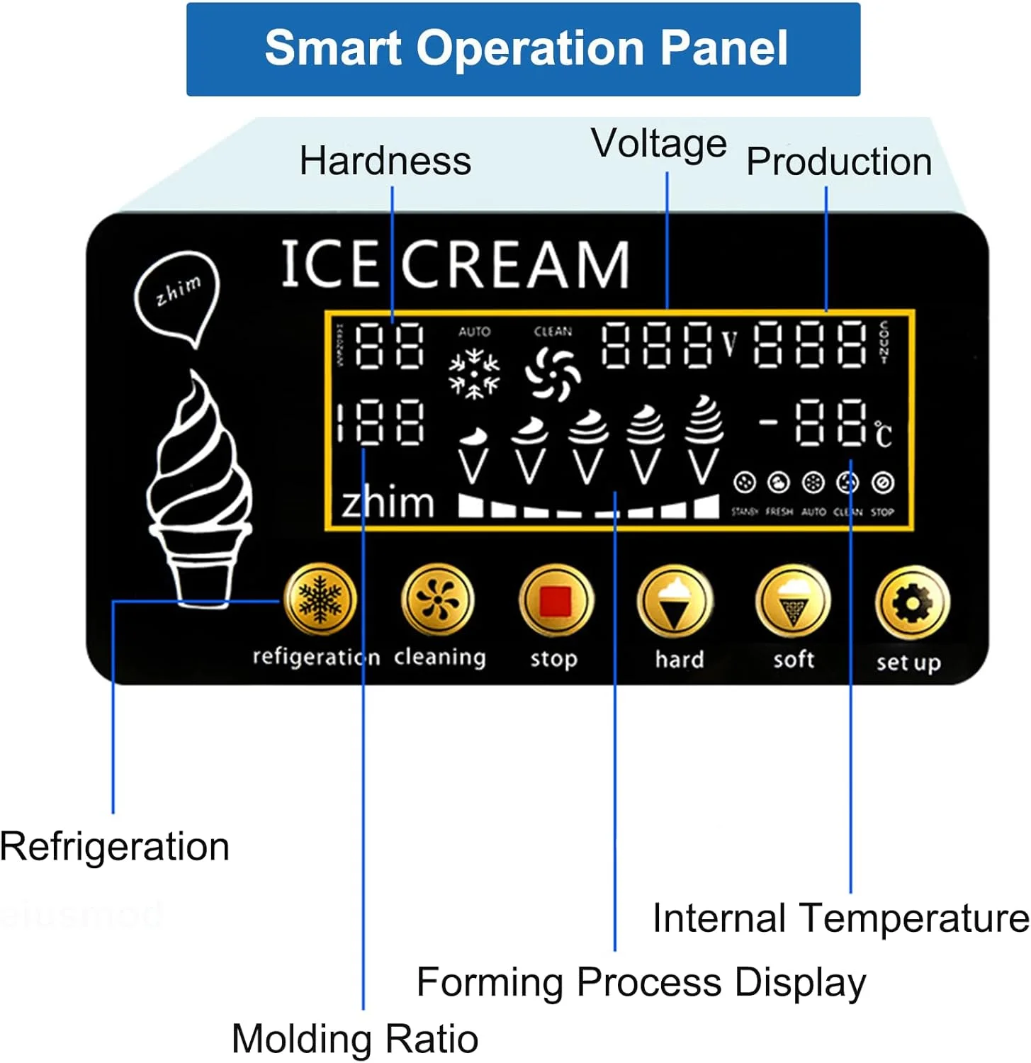 4. Intelligent LCD Panel Control: You can set the time, temperature, and hardness with the convenient LCD control panel. The quantity will also be displayed on the screen for direct observation, and with just one click, the ice cream machine can quickly start self-cleaning.