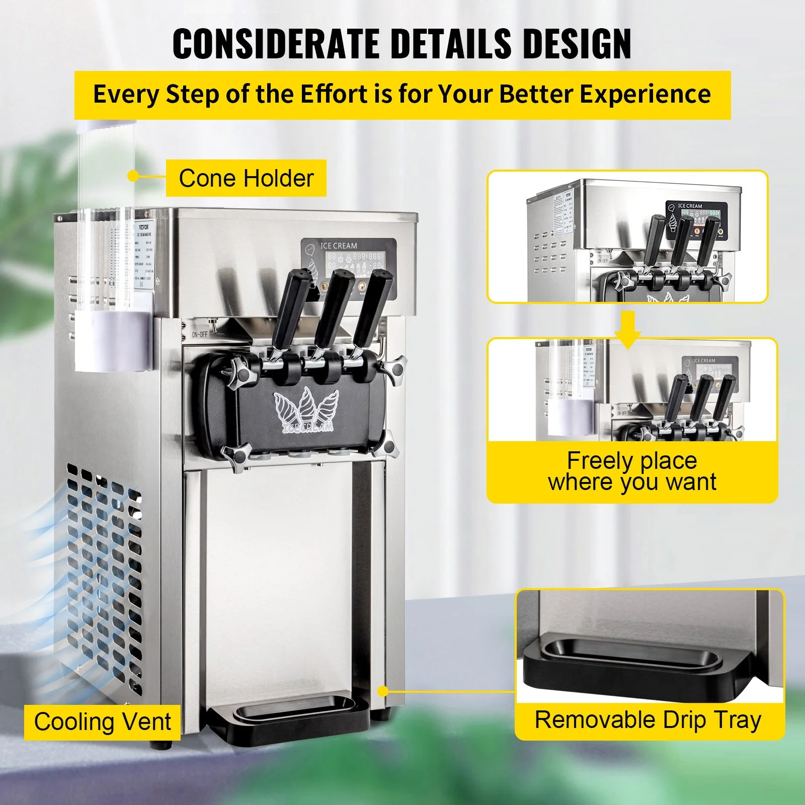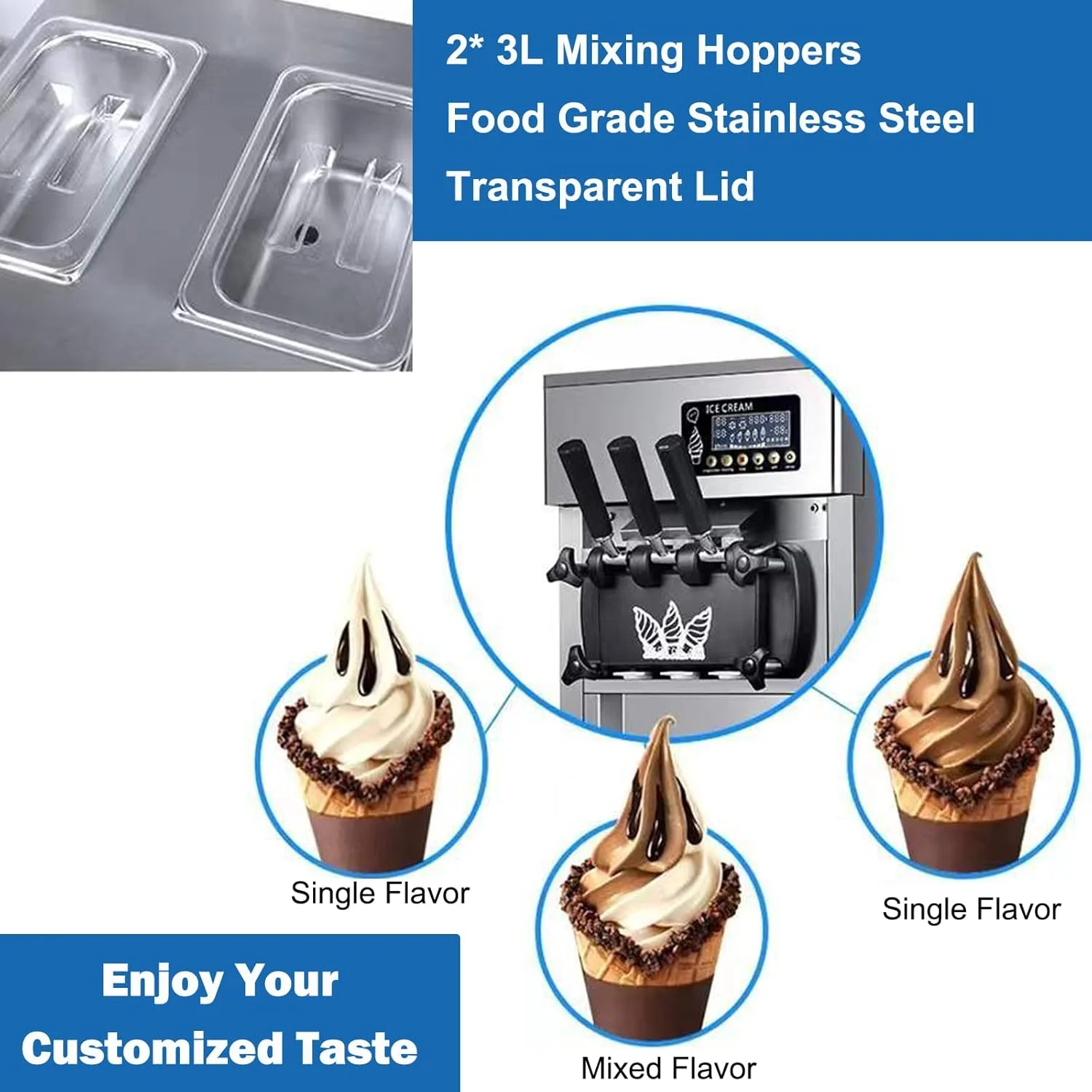 2. 2 Hoppers & 2+1 Flavors: Our soft serve ice cream machine integrates 3 flavors to meet various tastes, including 2 single flavors and 1 mixed flavor. During the mixing process, you can add your favorite foods, such as vanilla, strawberry, chocolate, mango, etc.