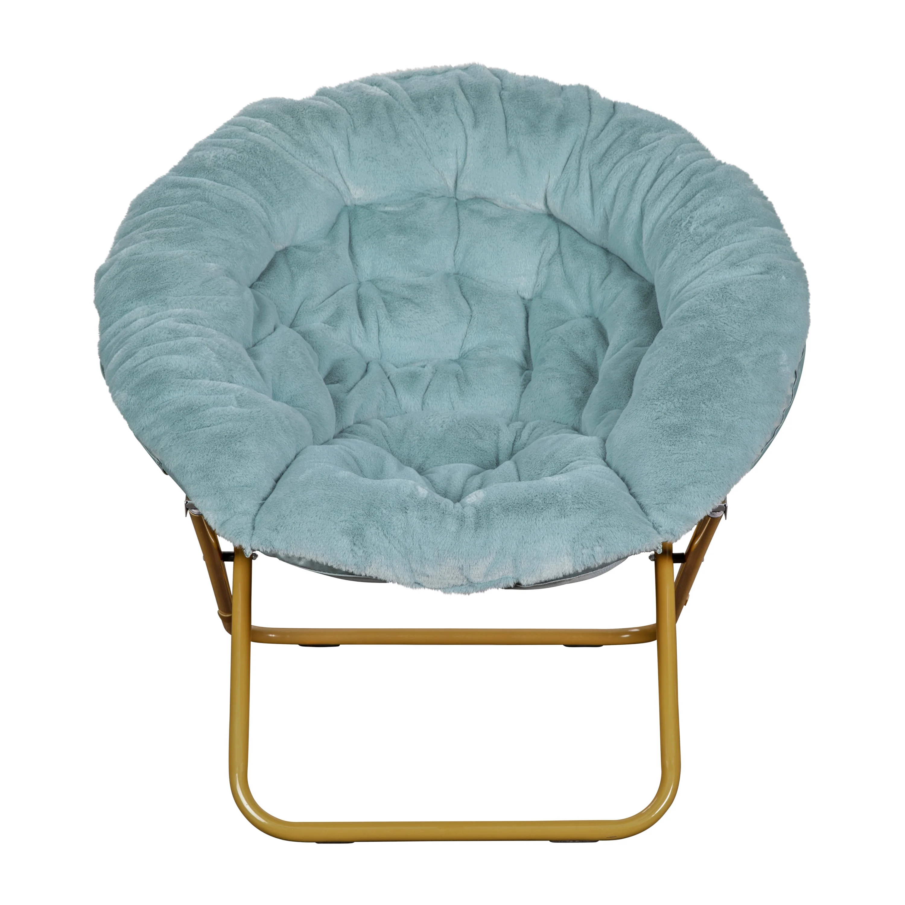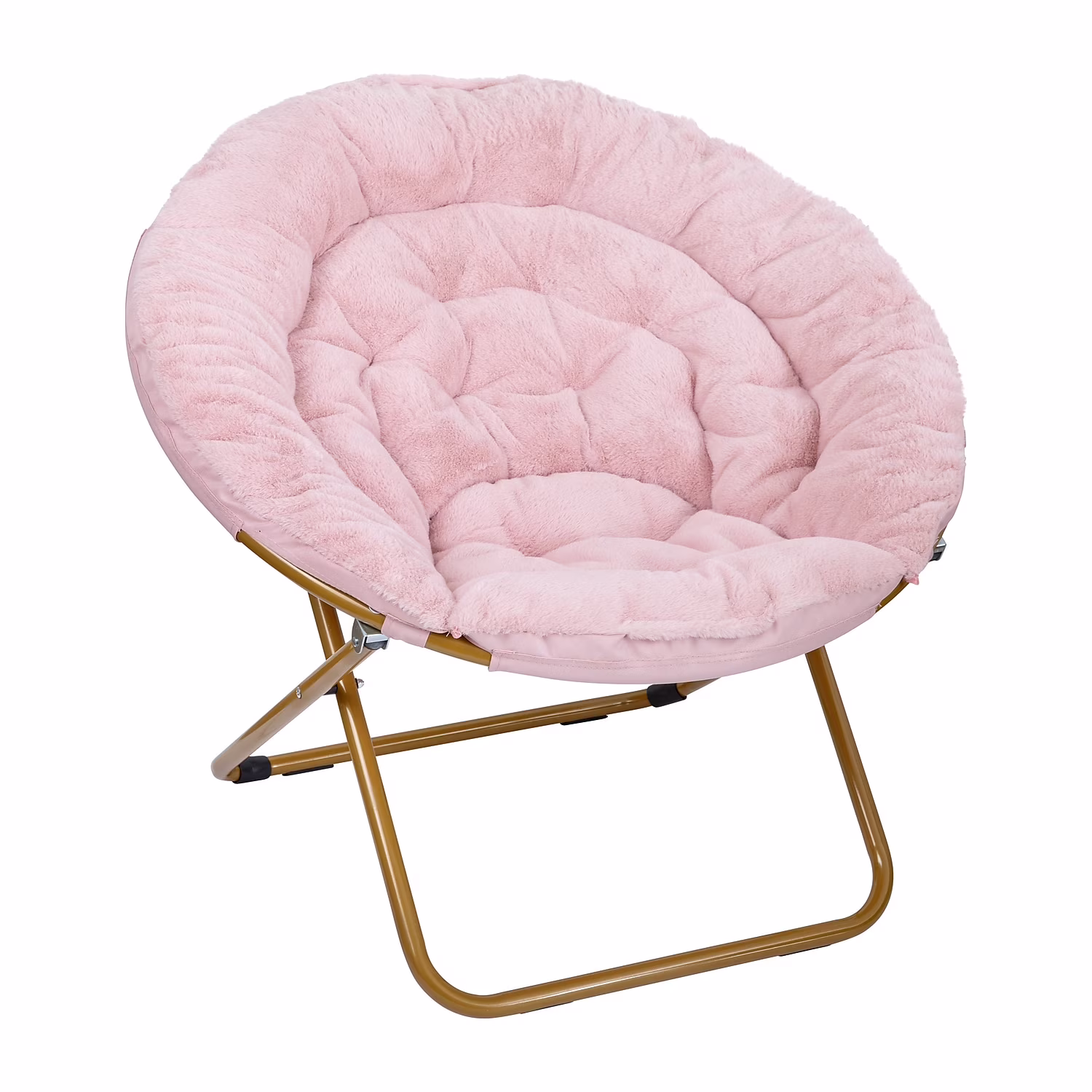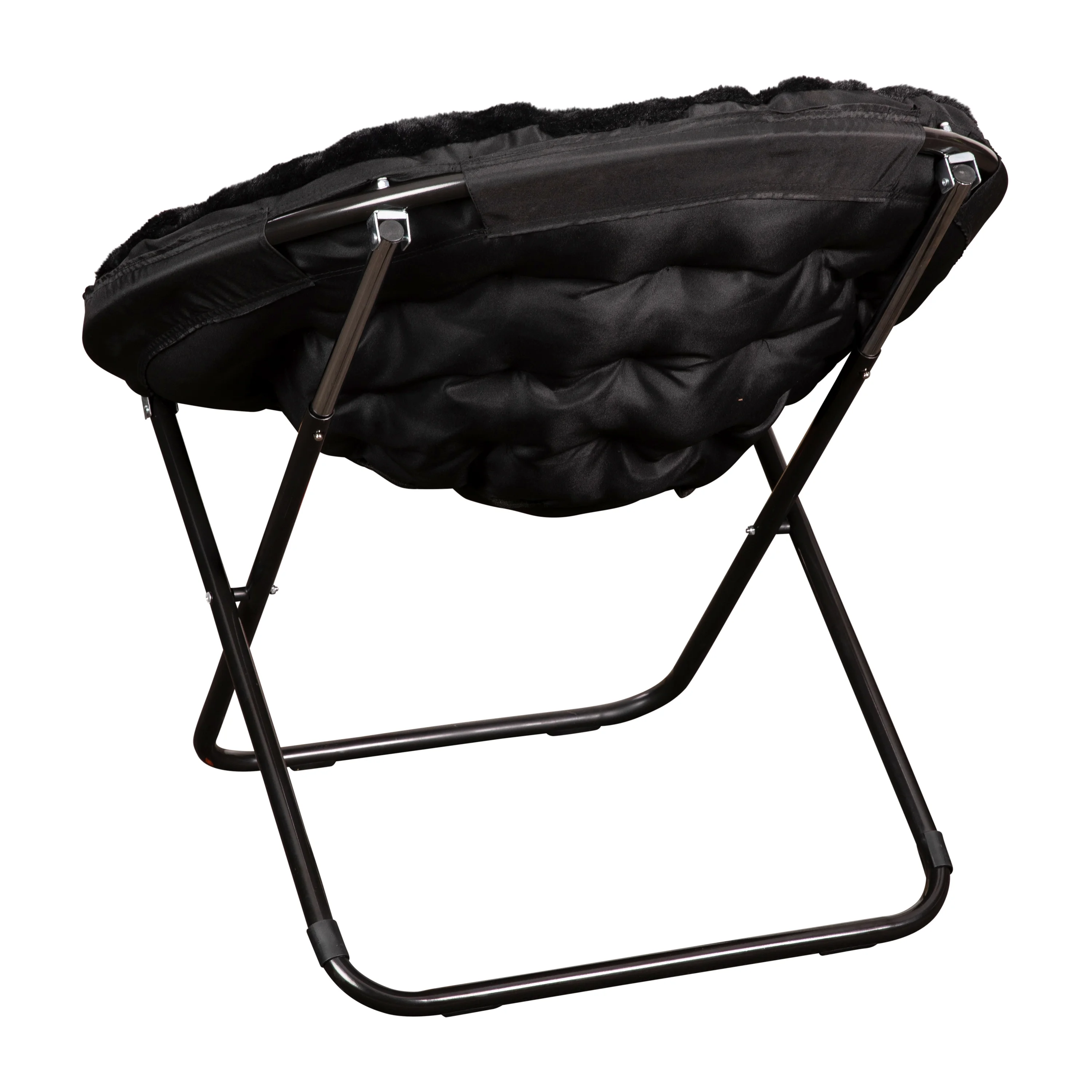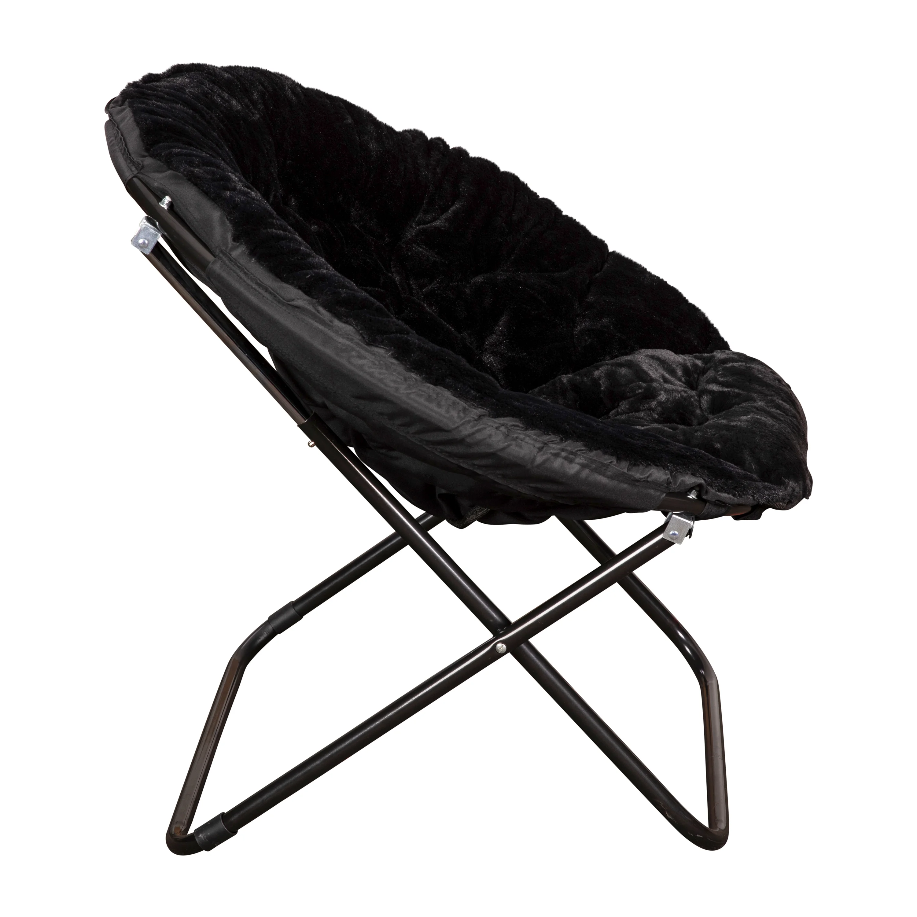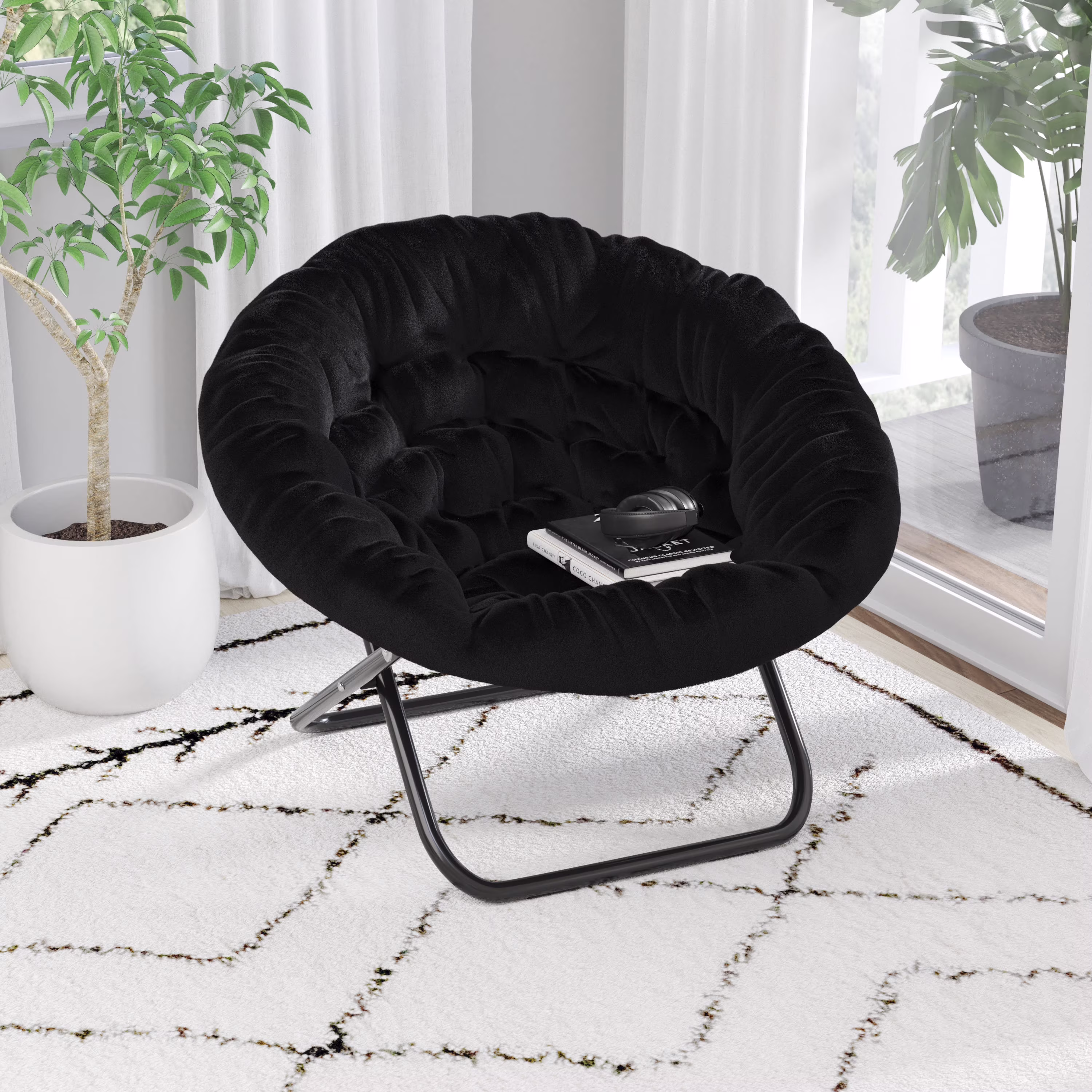 A resurgence in overall well-being elevates comfort to the top of the list when looking for seating making the soft, faux fur upholstery and extra padding in this oversize saucer chair a must have for any dorm room, apartment, or today's homes. The sturdy steel frame holds up to 300 lbs. static weight and folds flat when not in use making it ideal in small spaces and easily portable. The extra large, round frame lets you lounge in almost any position which is great for reading, gaming, or watching tv. Perfect for gift giving, this moon chair requires no assembly and can be enjoyed right out of the box. A damp rag with a mild detergent will keep your new favorite relaxation spot looking great.