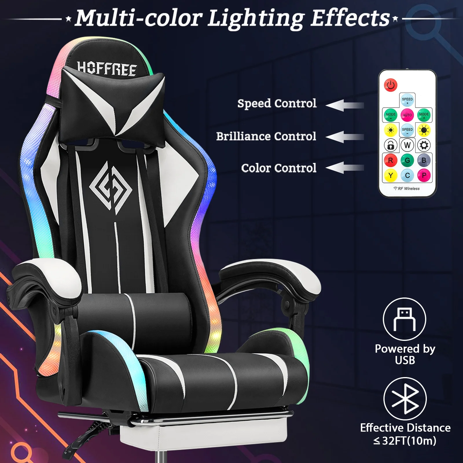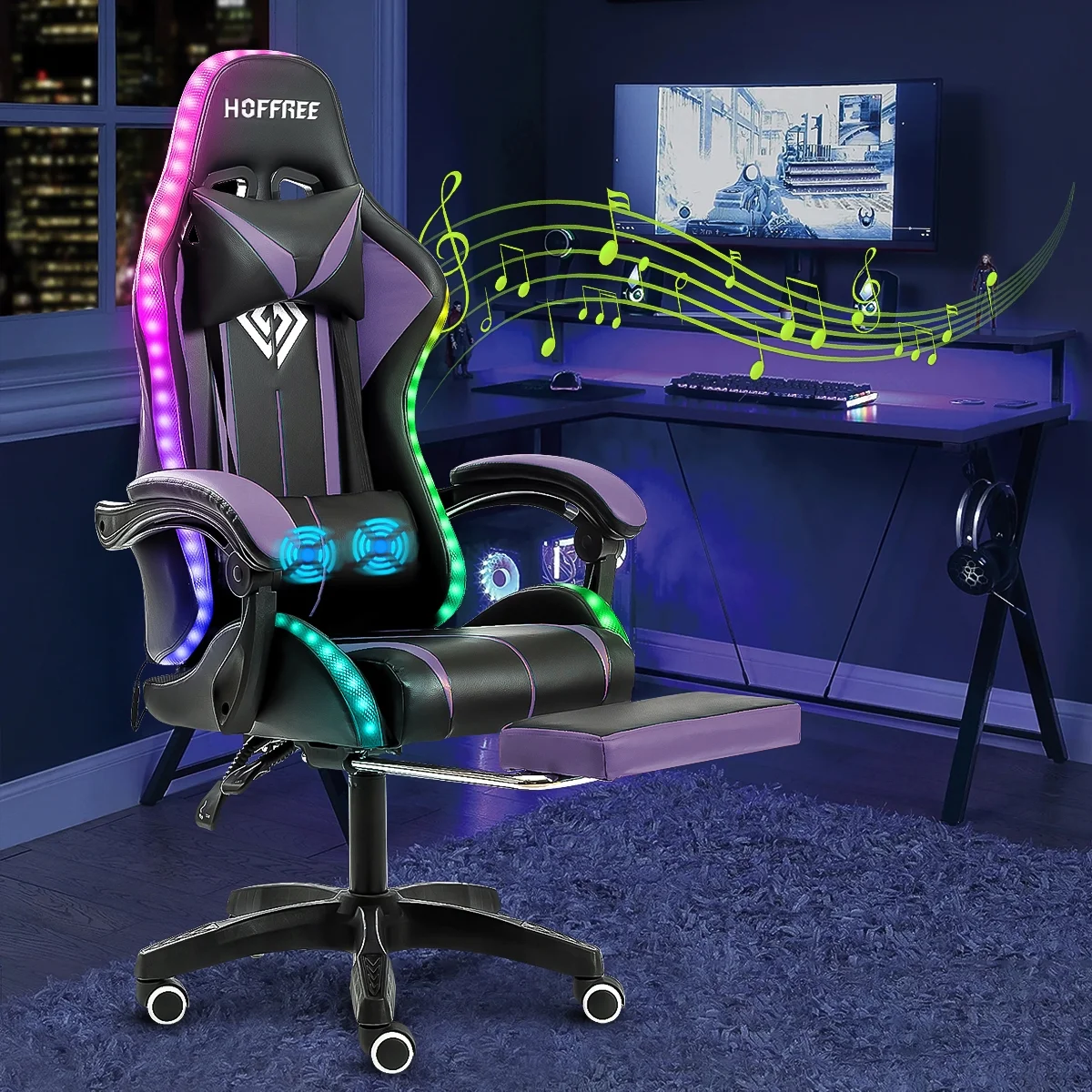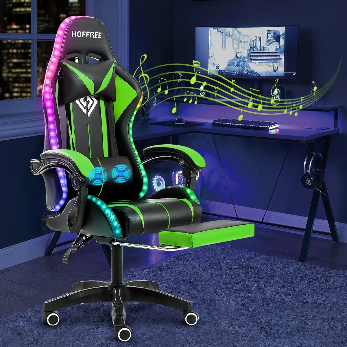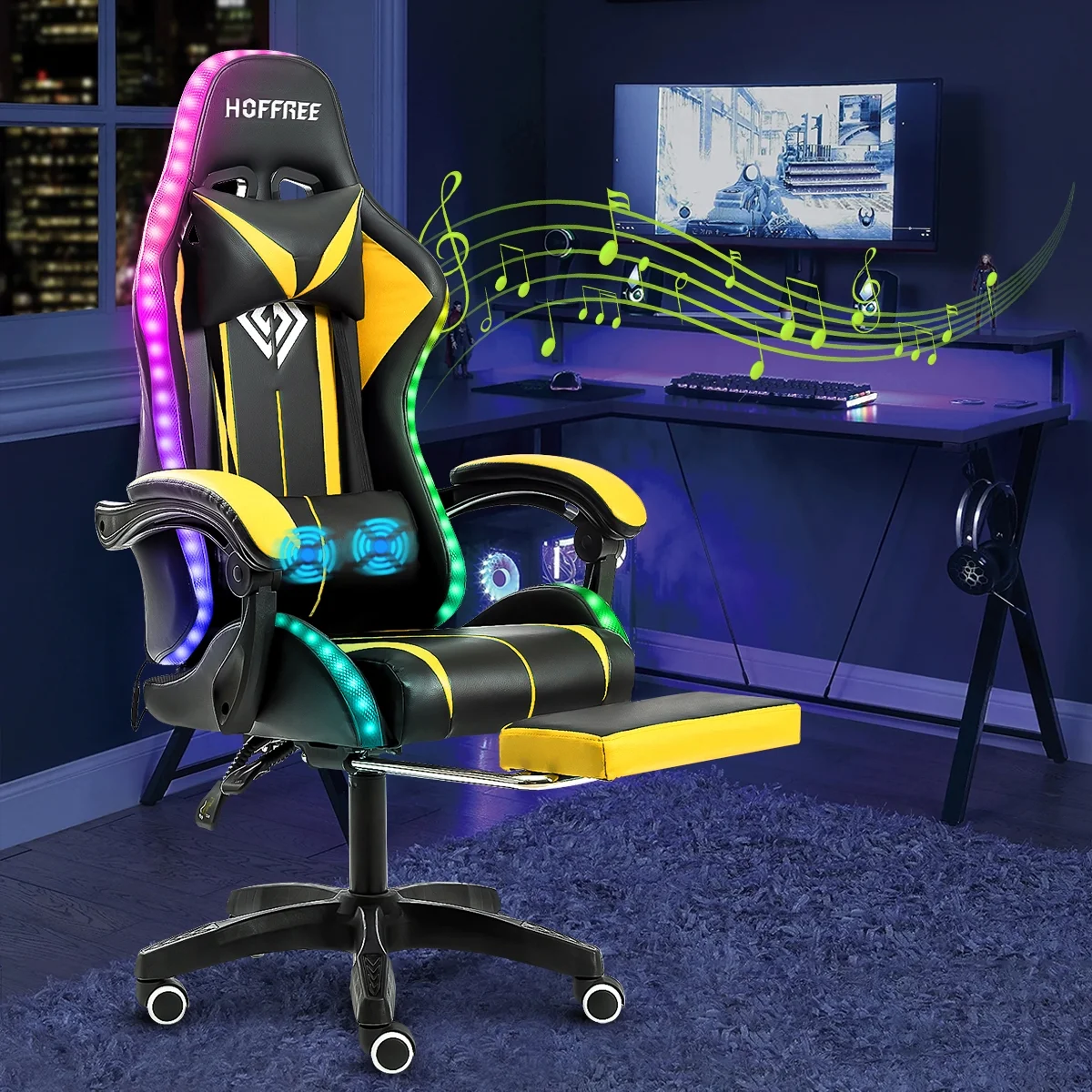 Hoffree Gaming Chair with Bluetooth Speakers and Footrest Massage Office Chair with LED Lights Ergonomic Game Chair High Back with Lumbar Support and Headrest Adjustable Swivel for Adults 300 lb
