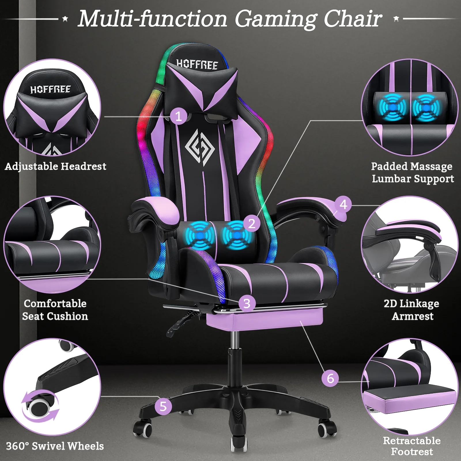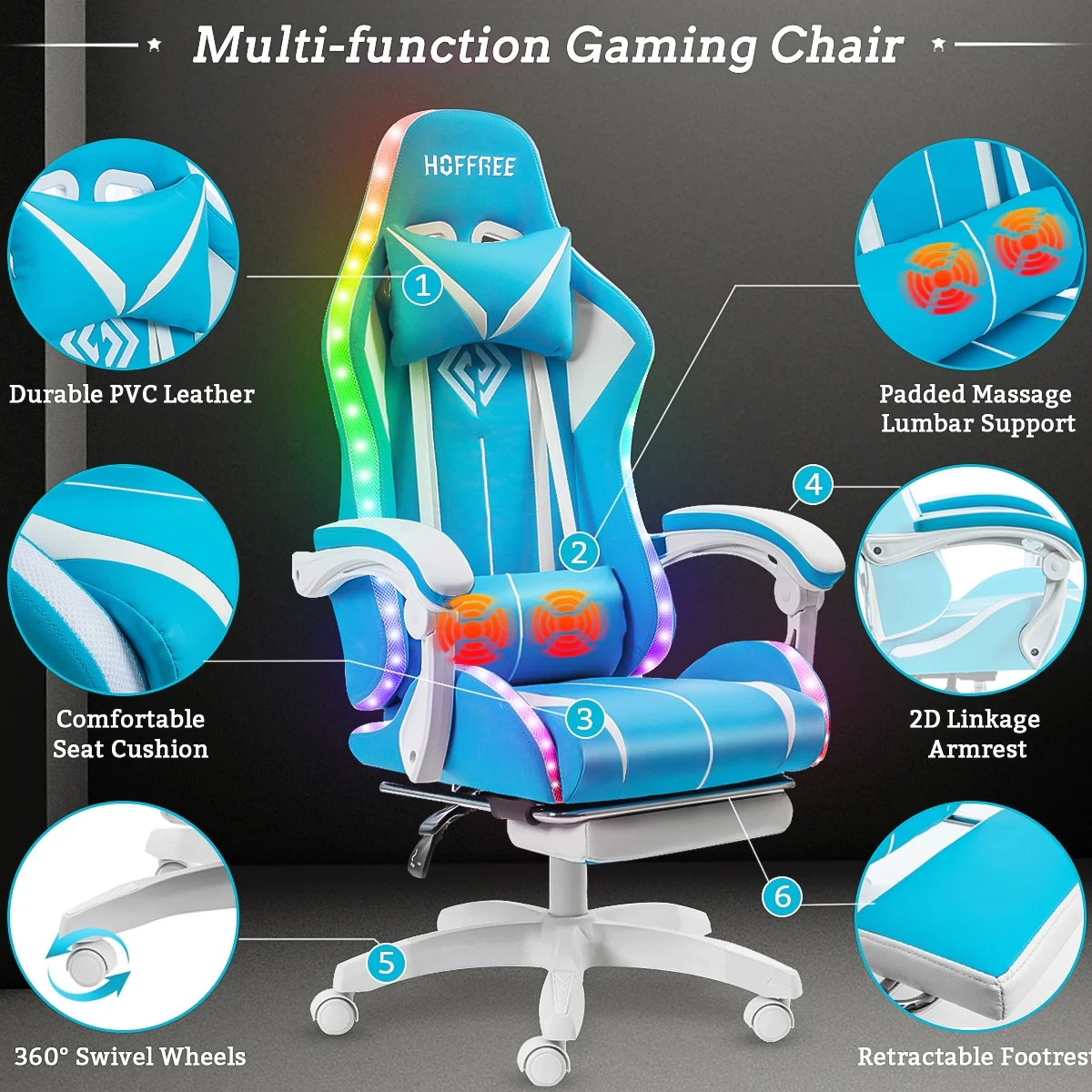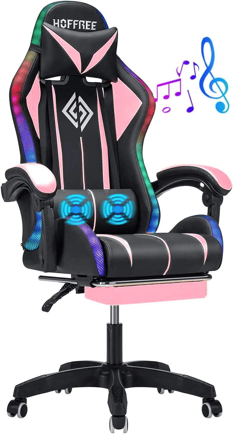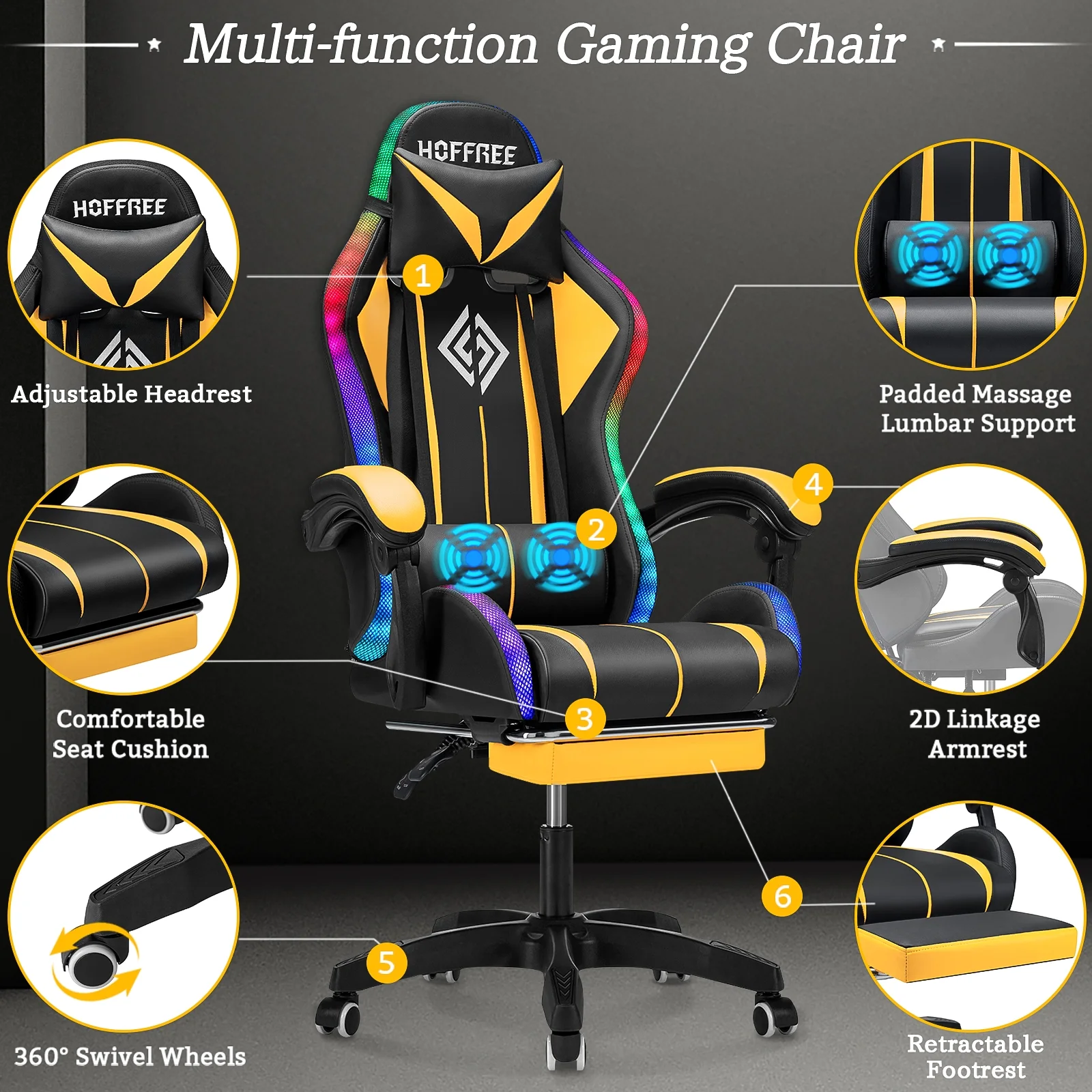 Hoffree Gaming Chair with Bluetooth Speakers and Footrest Massage Office Chair with LED Lights Ergonomic Game Chair High Back with Lumbar Support and Headrest Adjustable Swivel for Adults 300 lb