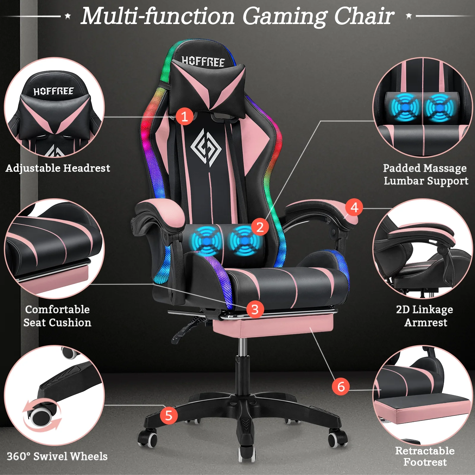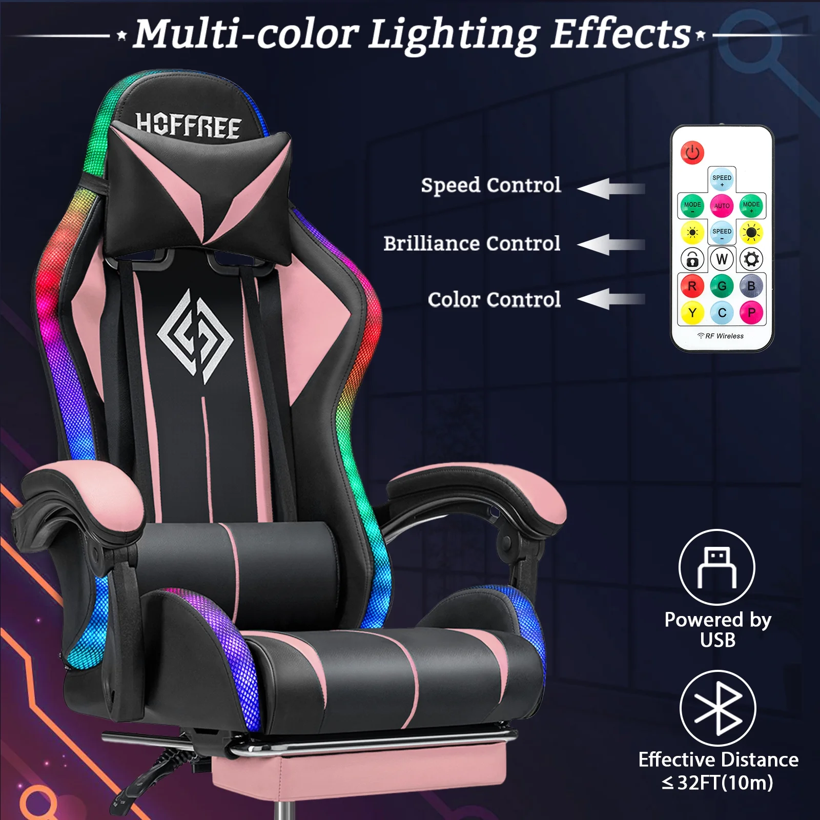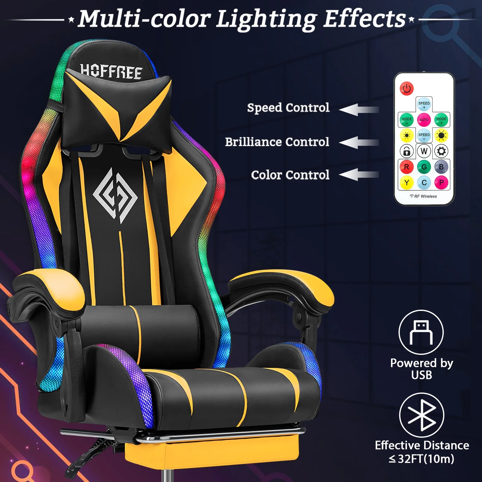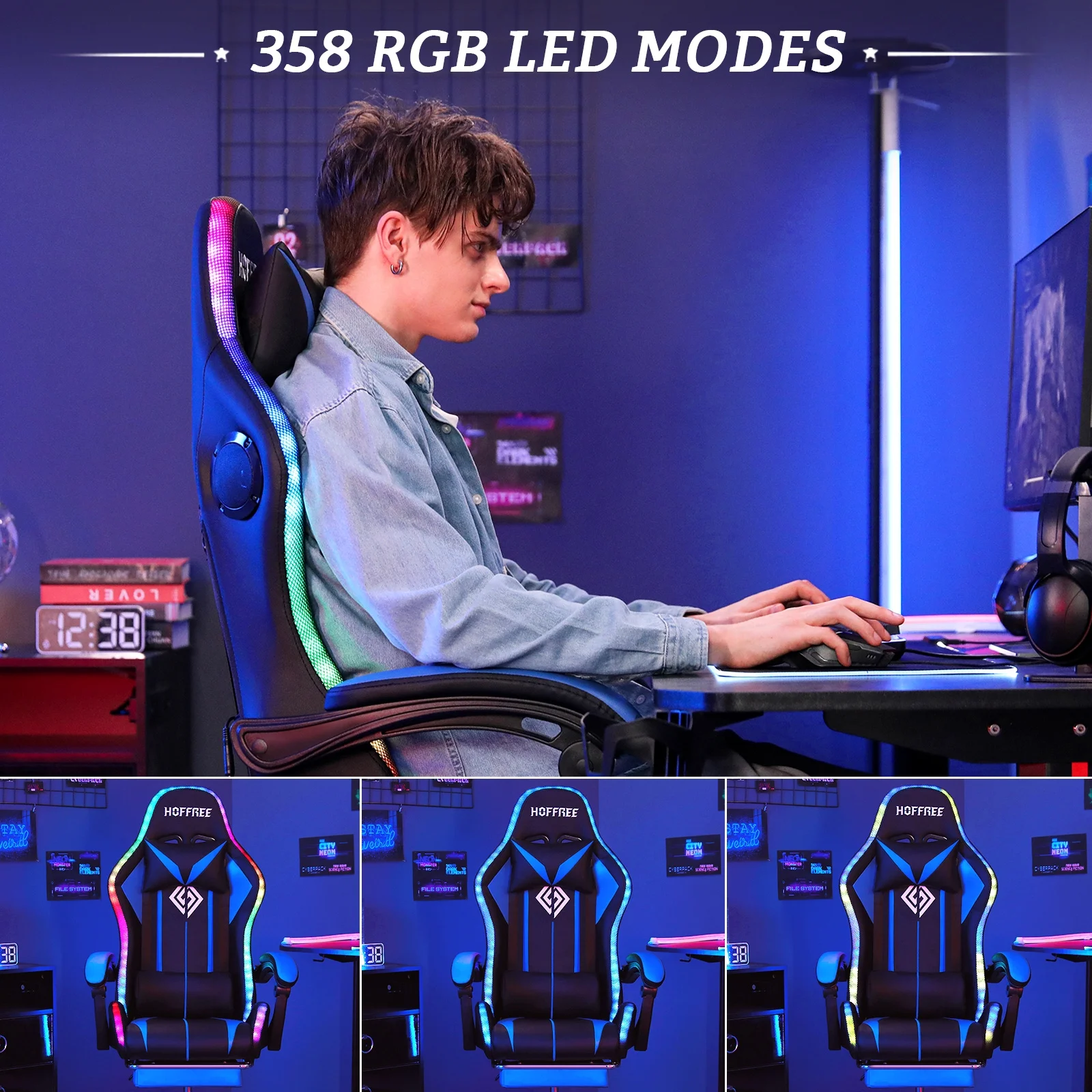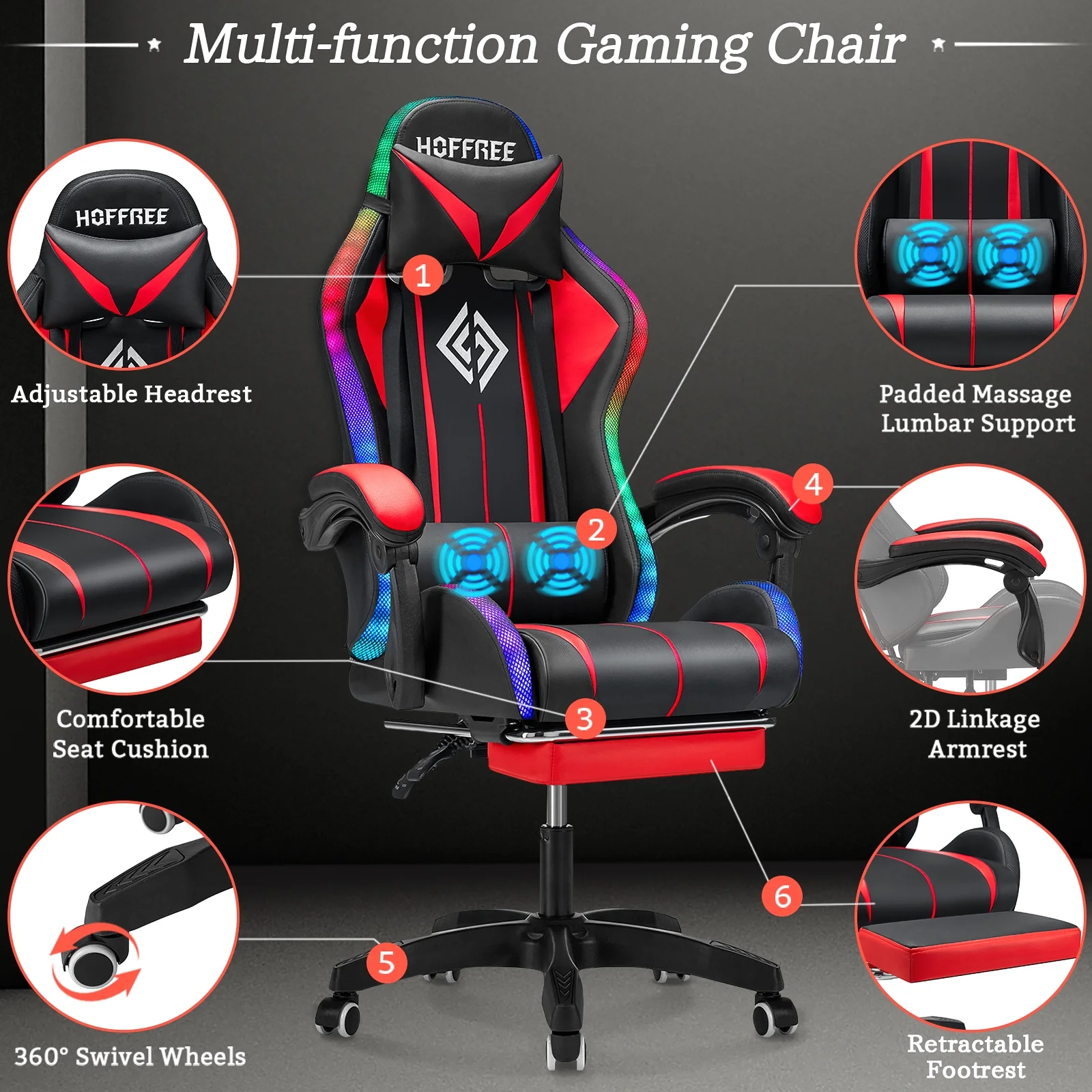 Hoffree Gaming Chair with Bluetooth Speakers and Footrest Massage Office Chair with LED Lights Ergonomic Game Chair High Back with Lumbar Support and Headrest Adjustable Swivel for Adults 300 lb