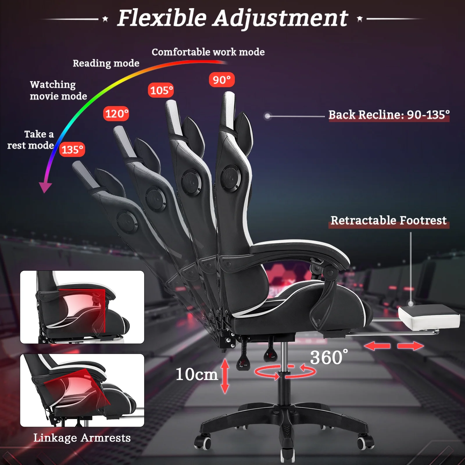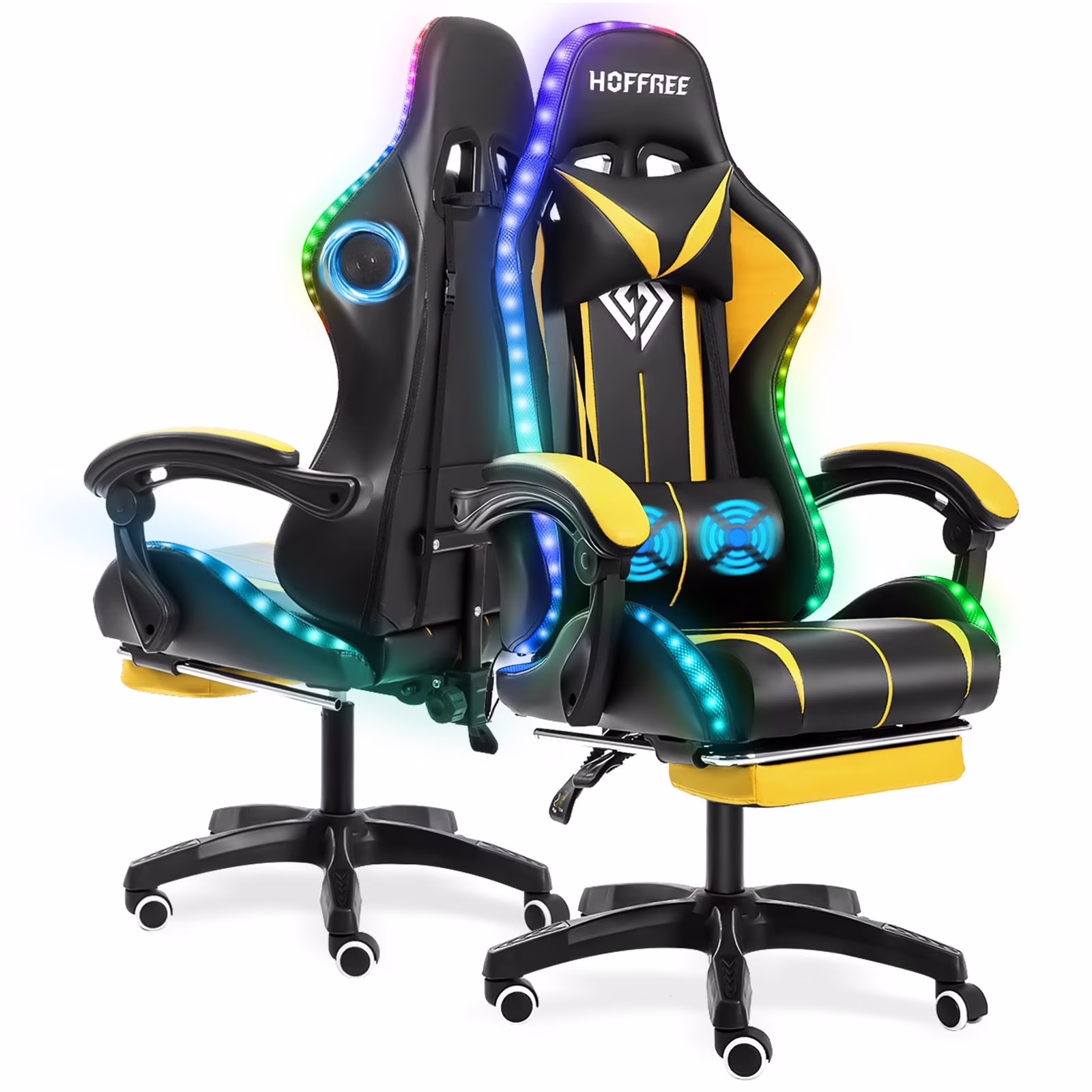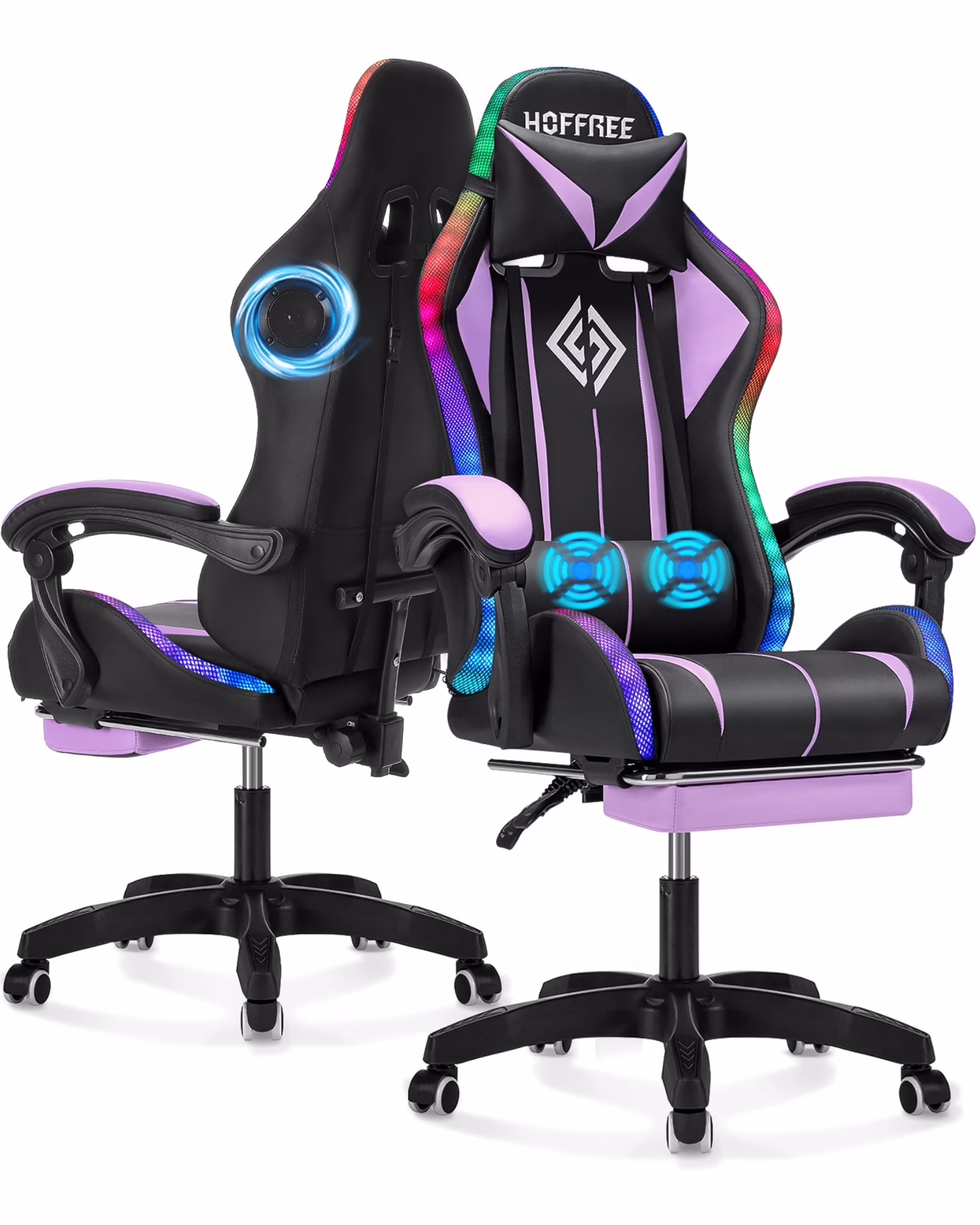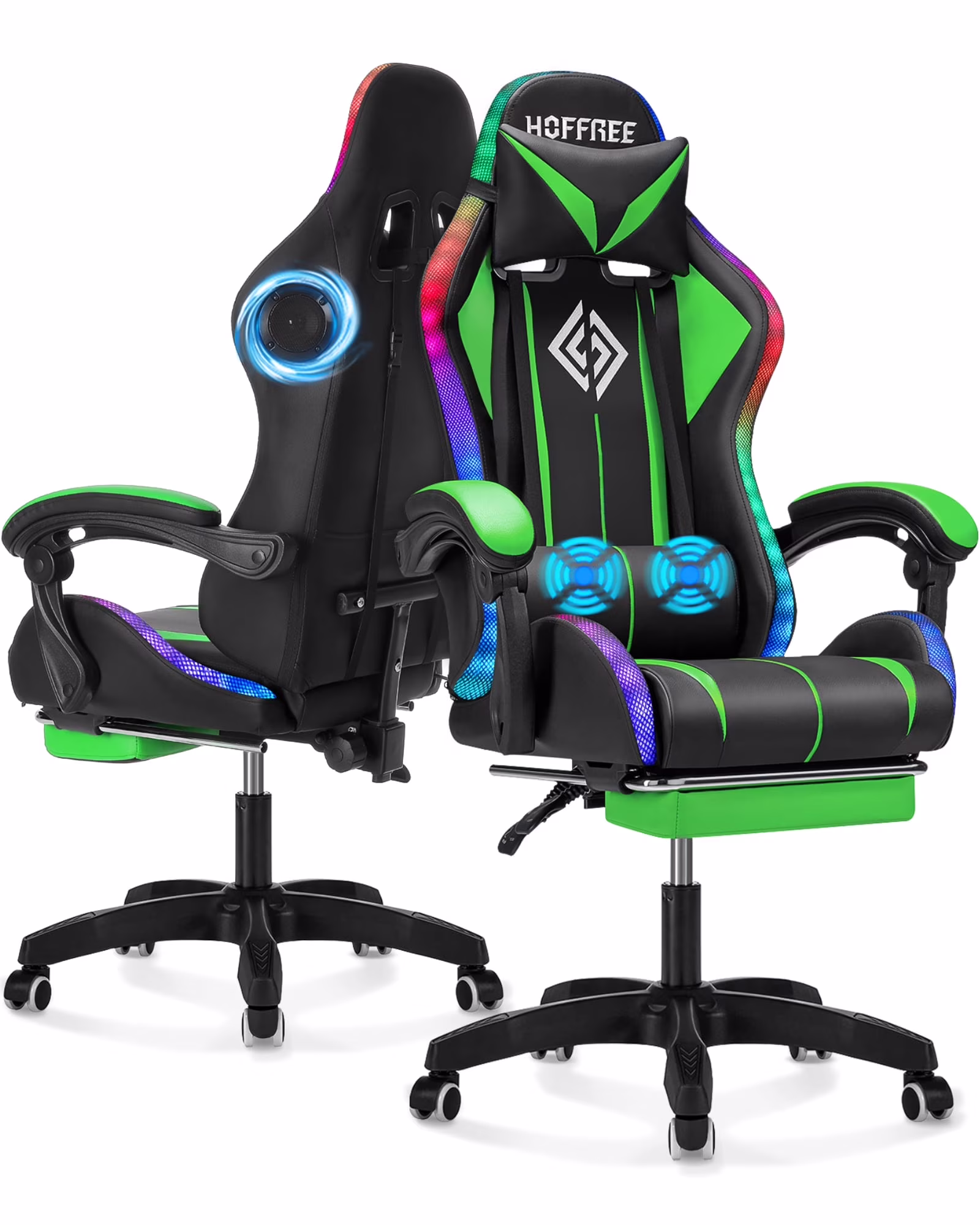 Hoffree Gaming Chair with Bluetooth Speakers and Footrest Massage Office Chair with LED Lights Ergonomic Game Chair High Back with Lumbar Support and Headrest Adjustable Swivel for Adults 300 lb