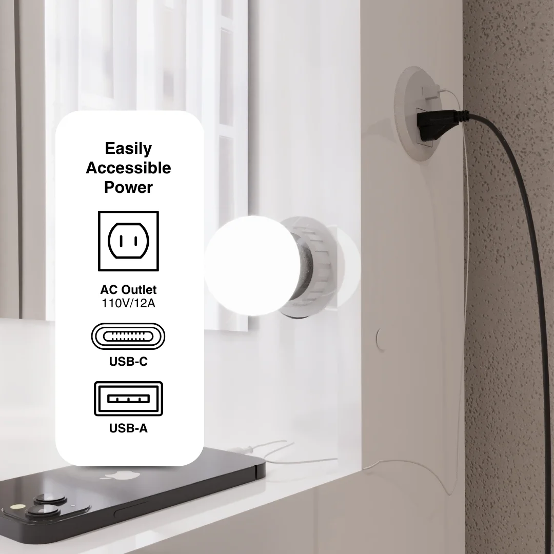 - Charging Station Included: Built-in USB Type-A, Type-C, and 110V outlet to power all your devices while you get ready.