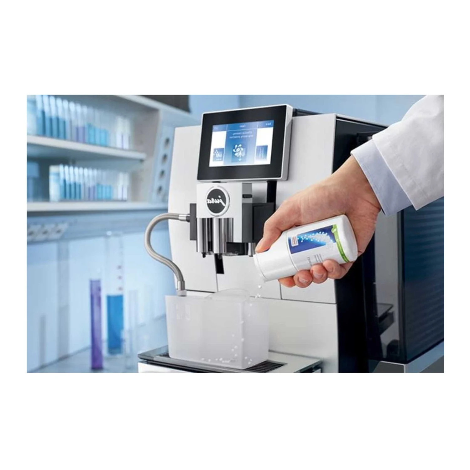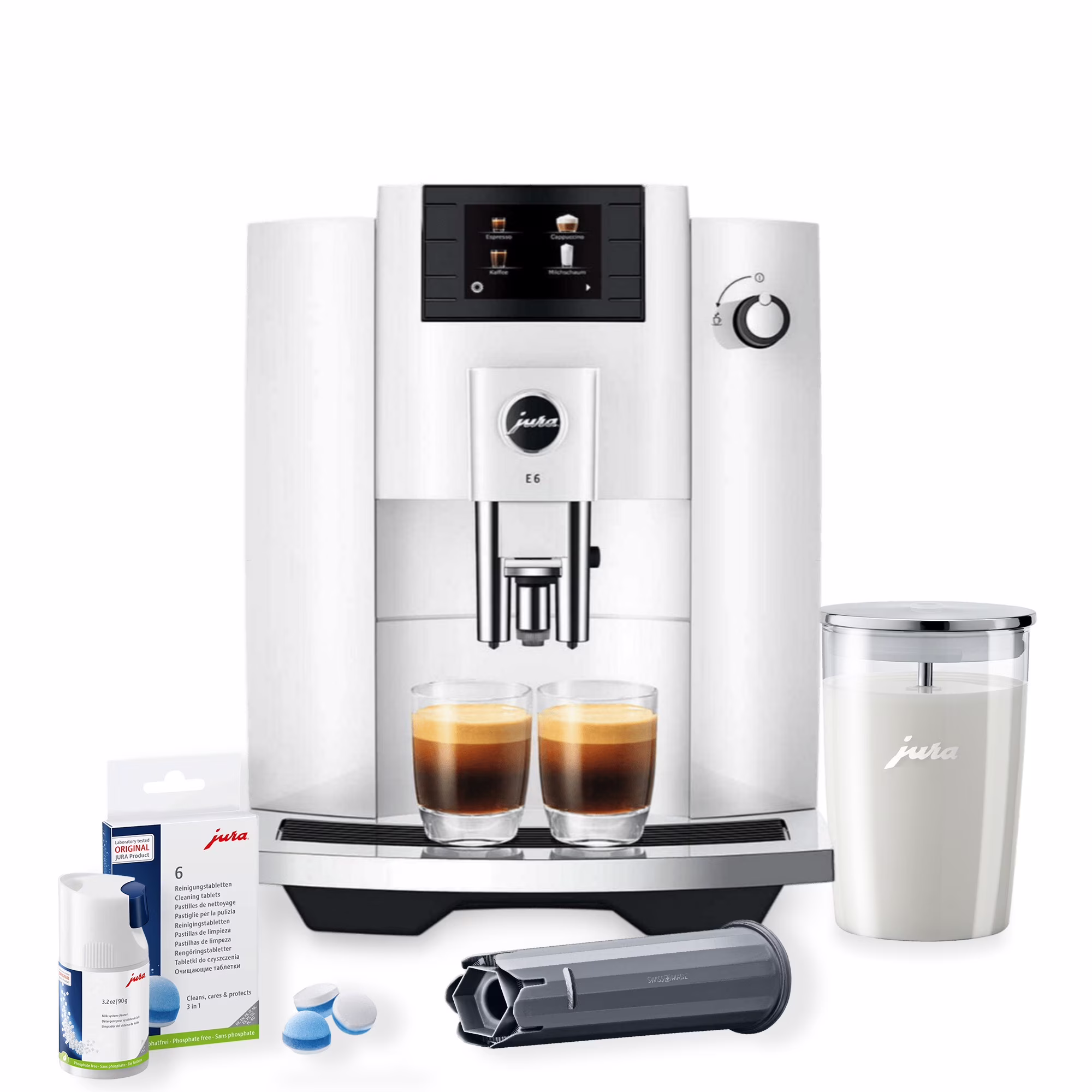 - Bundle Includes: Jura E4 Automatic Coffee Machine (Piano White) with Jura CLEARYL Smart+ Filter Cartridge Water Stabilizer with RFID Technology and TÜV-Certified Hygiene, East Coast Blend Whole Bean Coffee (1-Pound), Jura 3-Phase 6 Cleaning Tablets