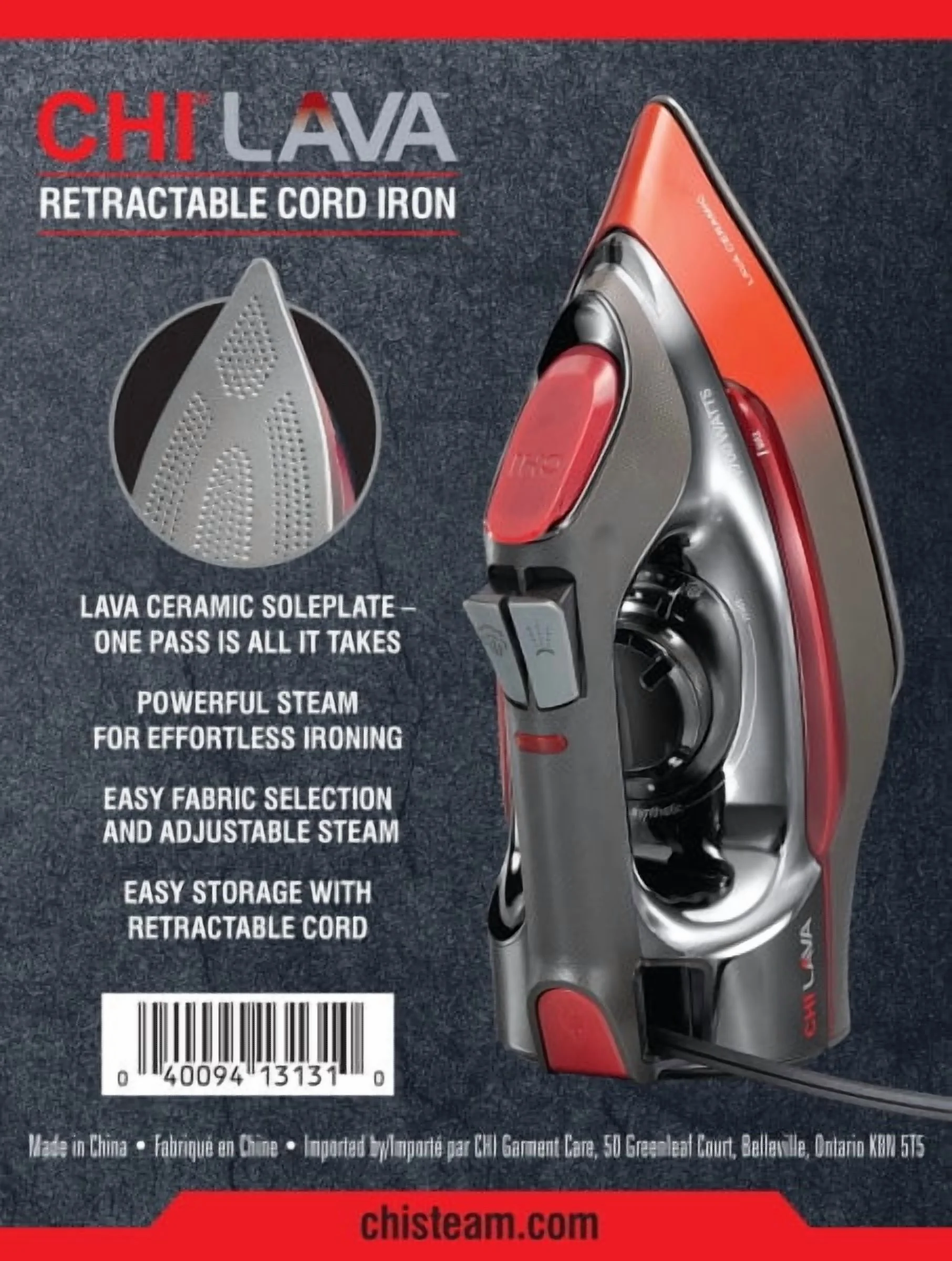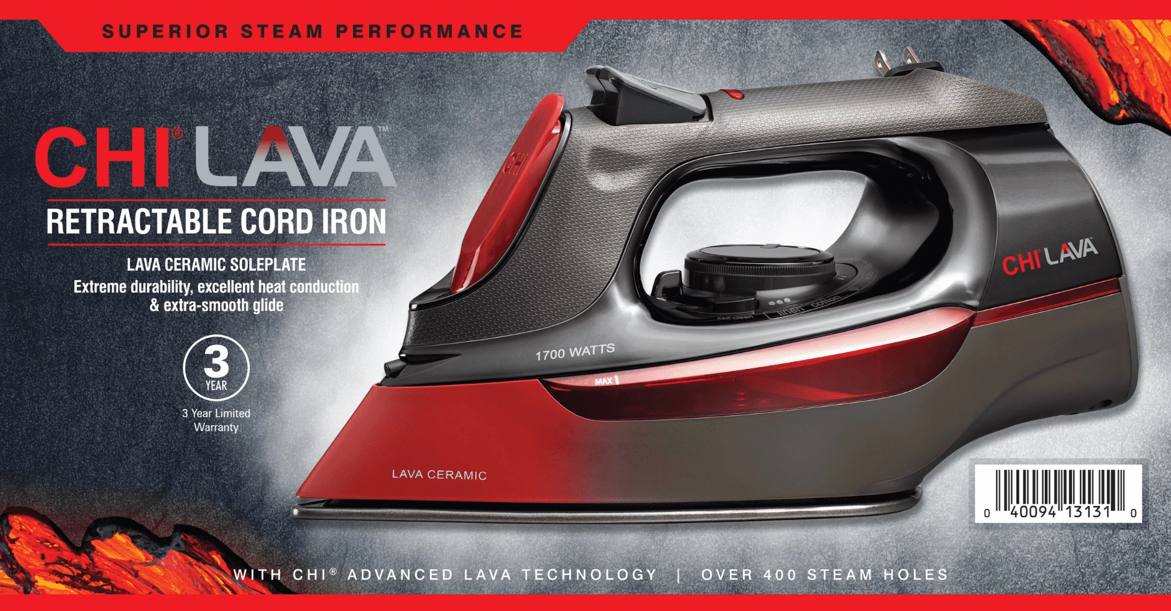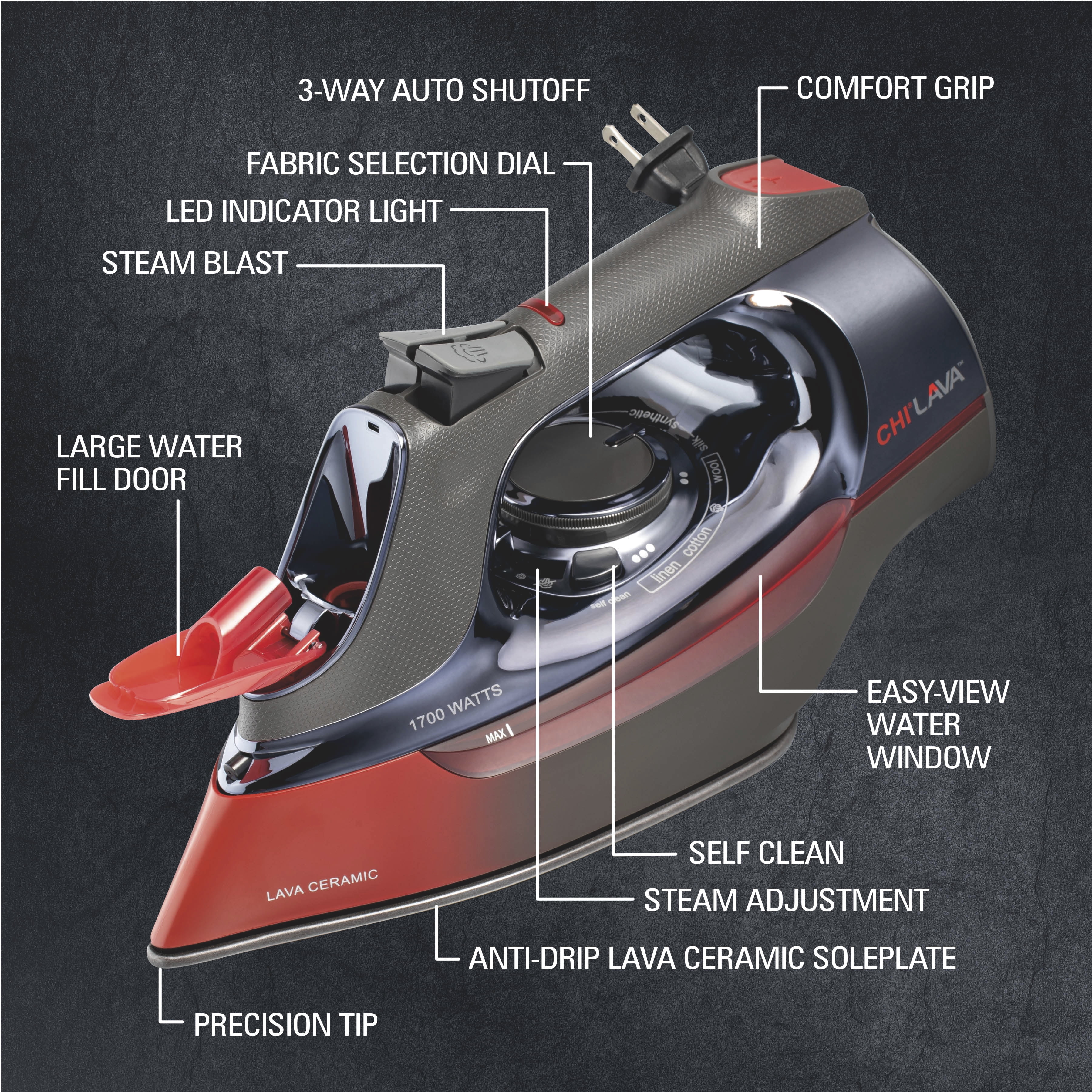 - LAVA CERAMIC SOLEPLATE: This steam iron's soleplate is engineered with volcanic lava combined with the power of CHI ceramic. This innovative combination of elements creates extreme durability, excellent heat conduction and an extra-smooth glide.
