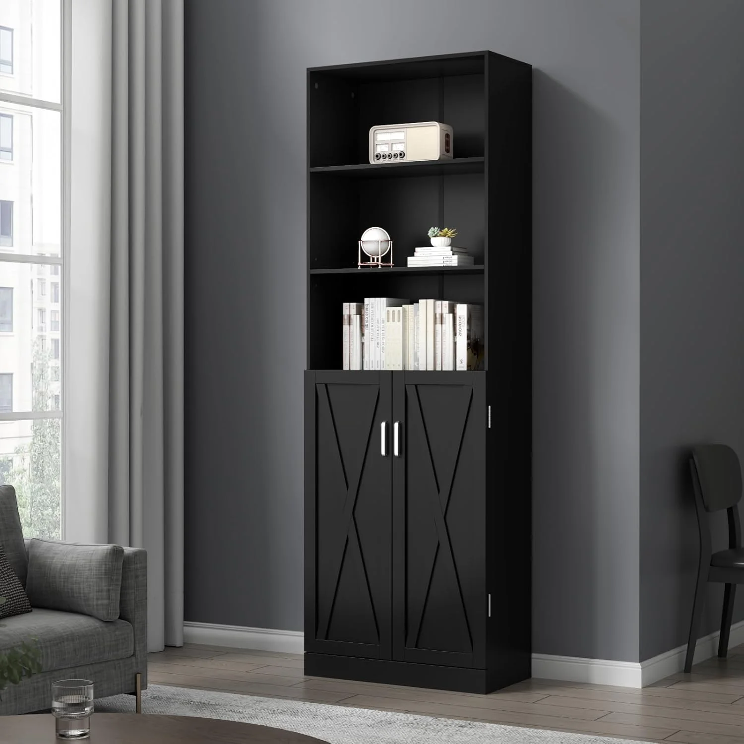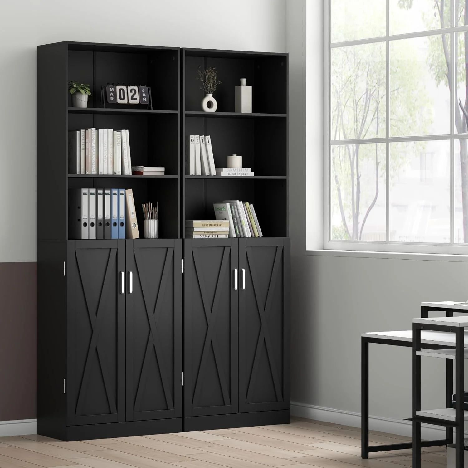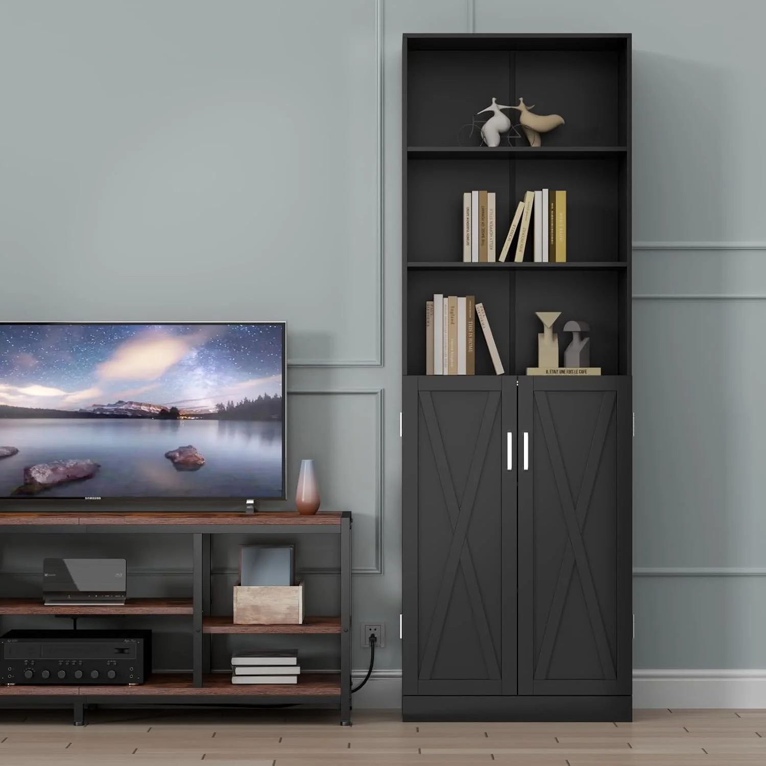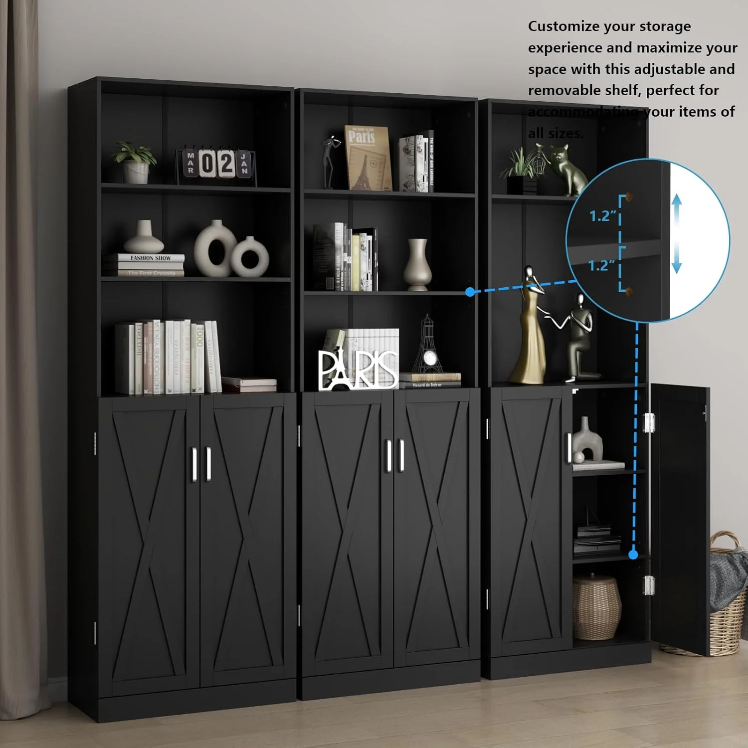 Adjustable shelves and a cabinet provide plenty of space for storage and display
