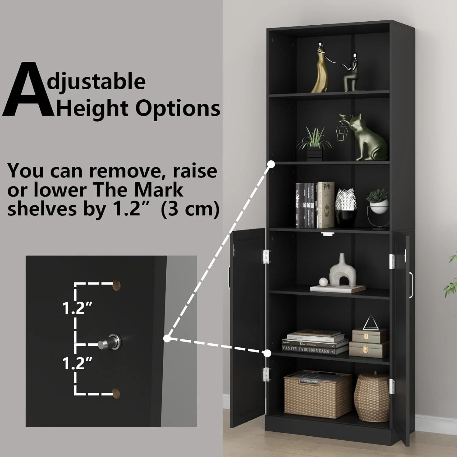 The first and fourth shelves can be easily adjusted to three height positions for your various items