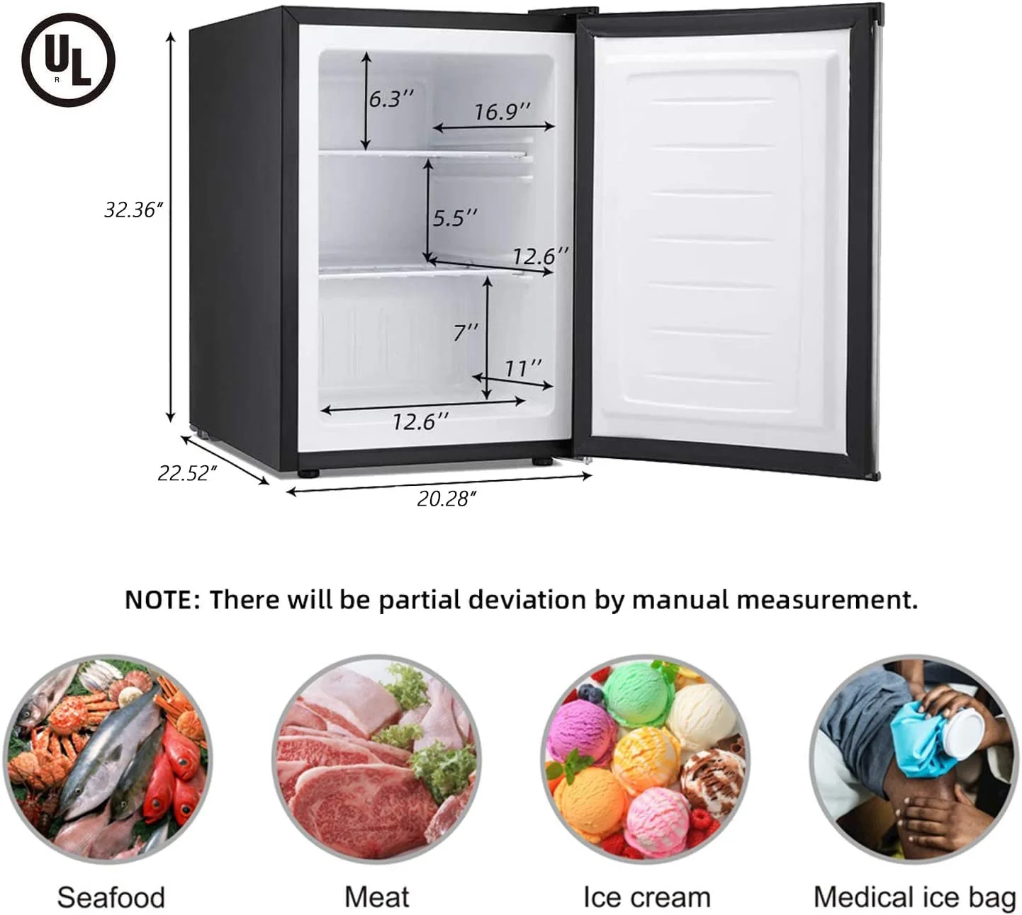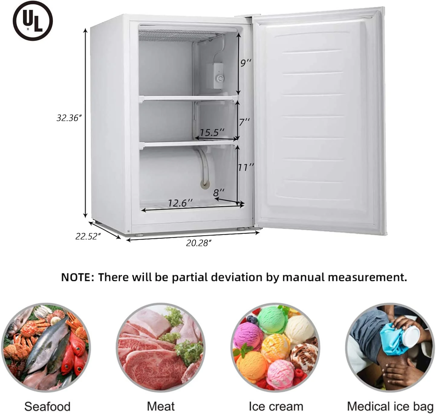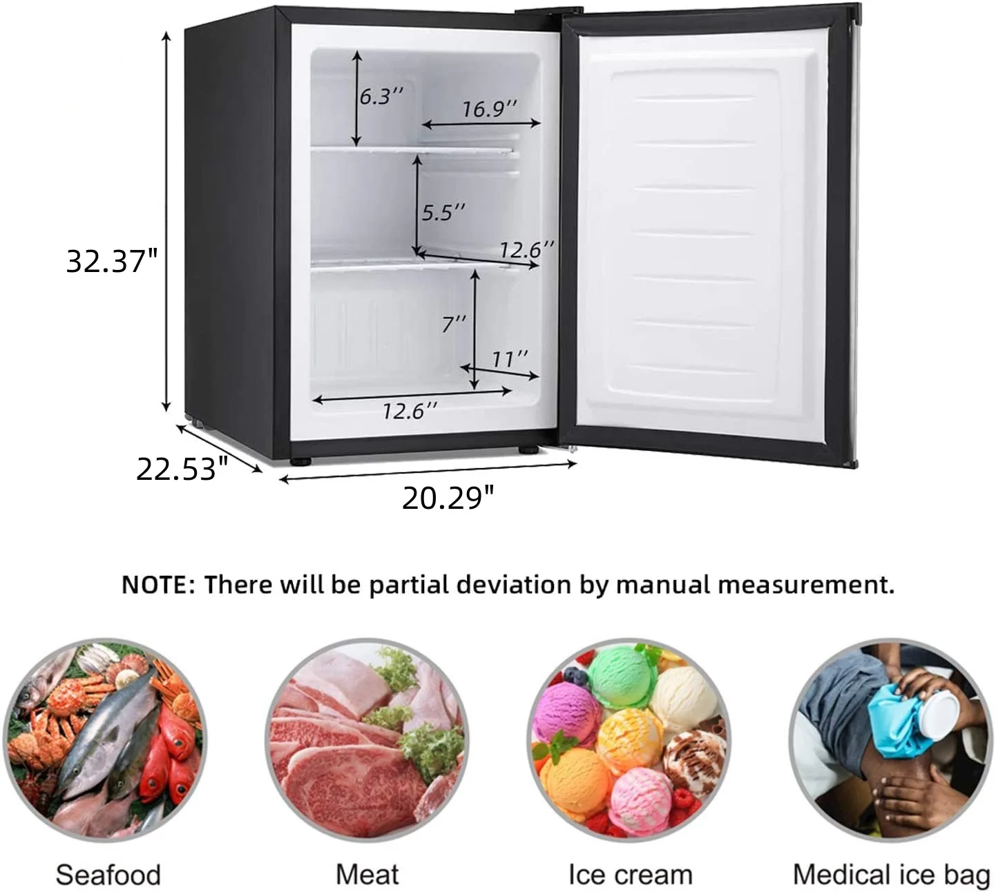 - 【❄️Large Capacity for Protection�?Compact design, 3.5Cu.ft large internal capacity, including two removable shelves, flexible storage space can reasonably include a variety of food. Suitable for meat, seafood, ice cream, breast milk, and other quick-frozen products. Just this small freezer can satisfy the whole family's freshness needs! Measures: 20.87�?W)*20.28�?D)*31.5�?H)