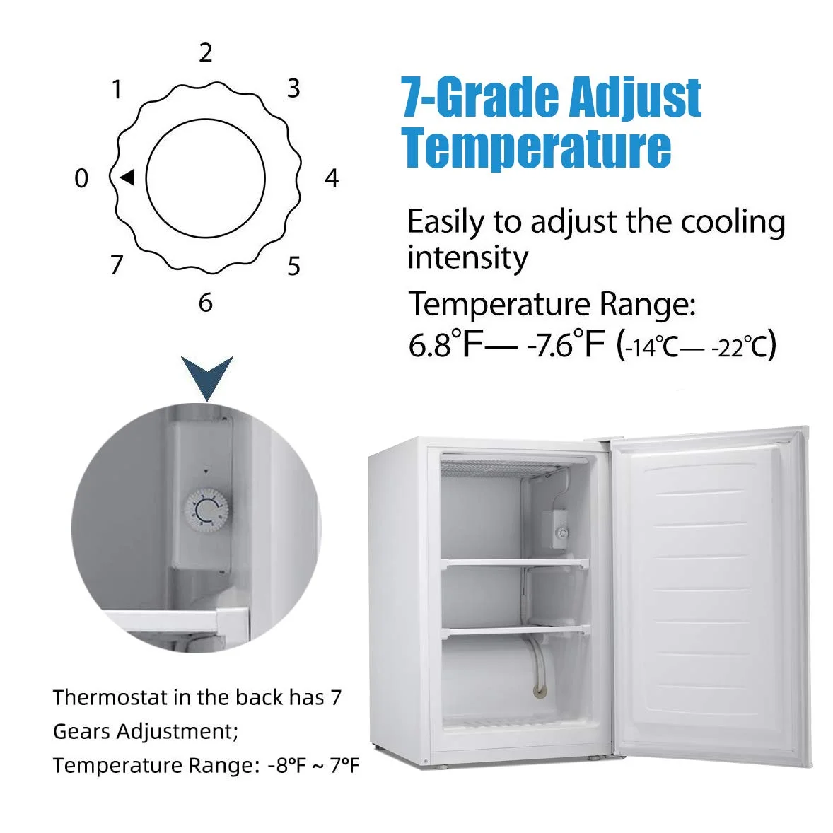 - 【❄�?-Speed Thermostat Design�?Built-in temperature control knob, you can easily adjust the desired temperature level. "1" means the hottest, "7" means the coldest, the temperature adjustment range is -7.6�?to 6.8�?One-piece design, upgraded sealing strip as well as thermal insulation, which can effectively reduce the generation of frost and easy to clean - Knob on the back of the freezer