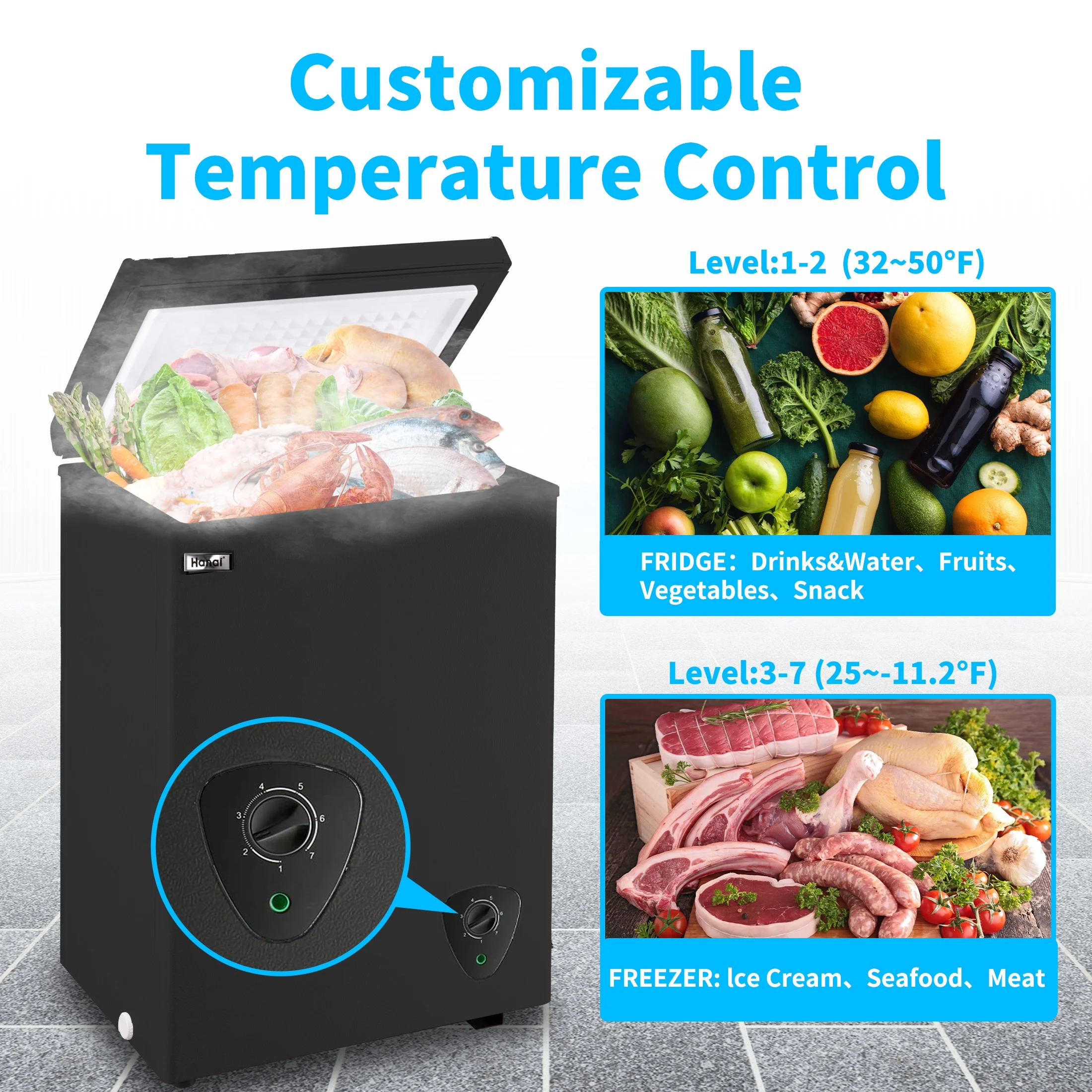 - Precision Temperature Adjustment:Boasting 7 settings,tailor the chill to your exact preference.Start at Gear 1 for defrosting,and go all the way to Gear 7 for ultimate coldness.For fresh produce and beverages,Levels 1-2 offer fridge temperatures between 32°F and 50°F.For preserving meats,ice creams,and seafood,Levels 3-7 ensure freezer temperatures from -11.2°F to 32°F.