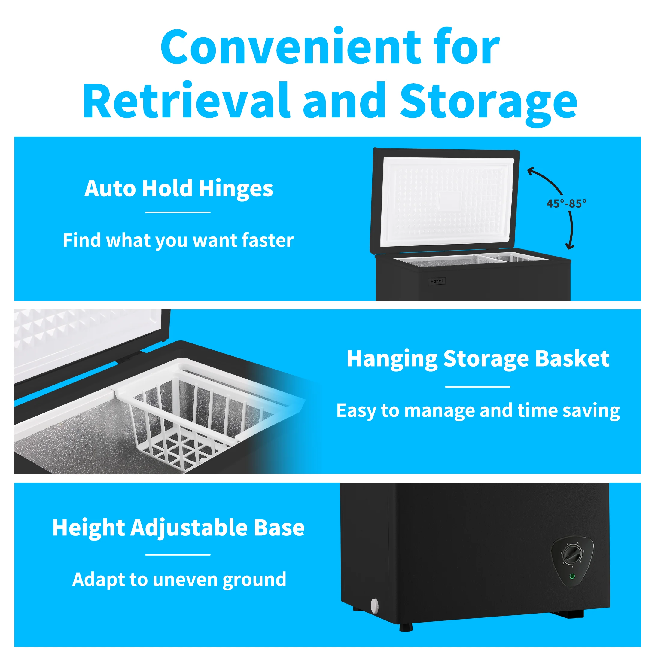 - Humanized Design for Ease of Use:Featuring door hinges that open at a 45° to 90° angle for convenient food storage.The removable storage basket makes it simple to organize,slide,and retrieve small items.The adjustable leveling legs ensure the freezer stands steady on uneven surfaces.