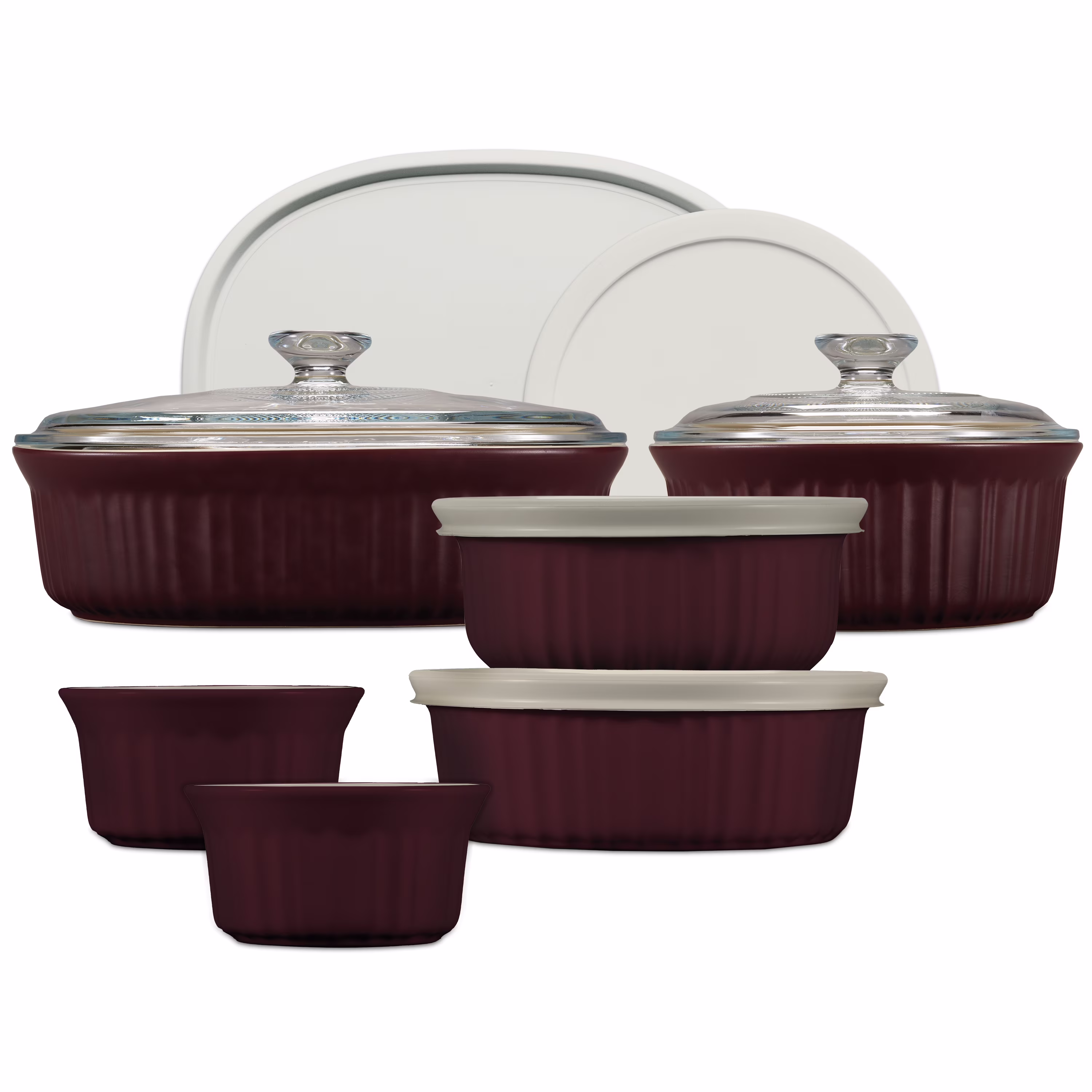 - 12pc Bakeware Set Includes: (1) 2.5-qt Oval Baking Dish with Glass and Plastic Lids, (1) 1.5-qt Round Baking Dish with Glass and Plastic Lids, (1) 24oz Round Baking Dish with Plastic Lid, (1) 16-oz Round Baking Dish with Plastic Lid, and (2) 4-oz Ramekins