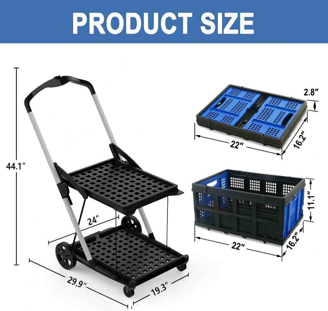 - LARGE LOADING CAPACITY: This shopping cart with wheels has a load capacity of 200 lbs in all - the upper layer can load 90 lbs, and the bottom layer can load 110 lbs; Assembled dimensions (L x W x H): 44.1 x 29.9 x 24 inches; Offers a compact storage of your belongings thanks to the unique and innovative fold-flat design